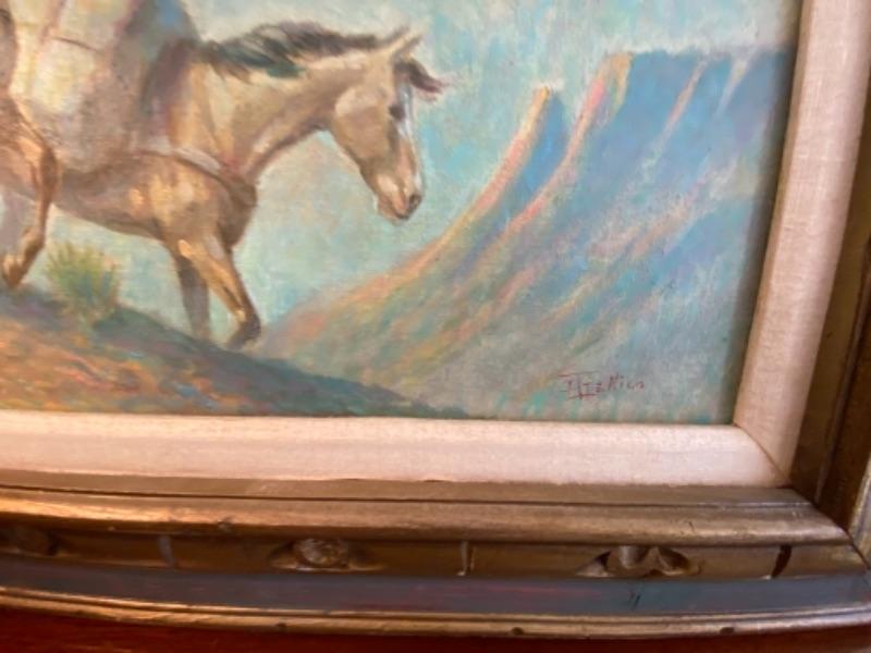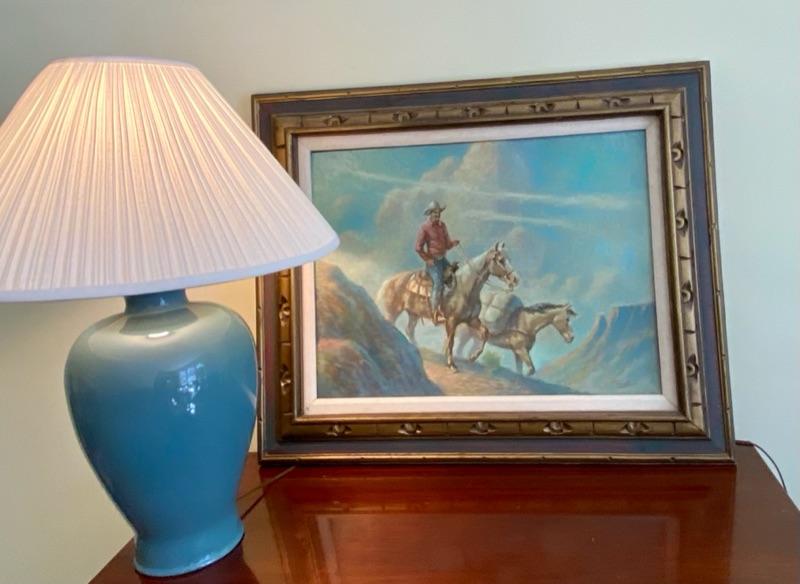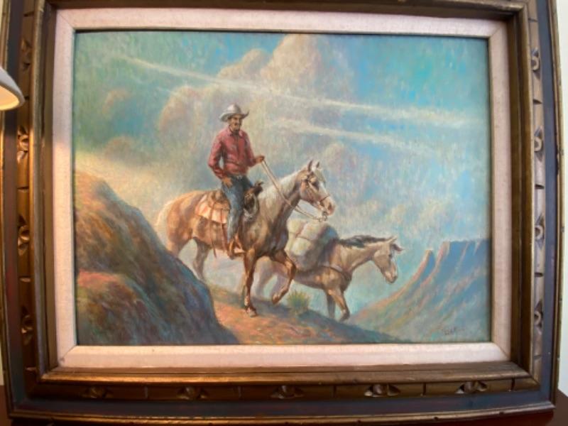 Large classic Western Cowboy painting , seems to be oil on canvas panel , titled New Mexico Pastoral by John Jellico of New Mexico. John Jellico was a famed western artist, art teacher, and the founder of the Art Institute of Colorado, located in historic, downtown Denver.