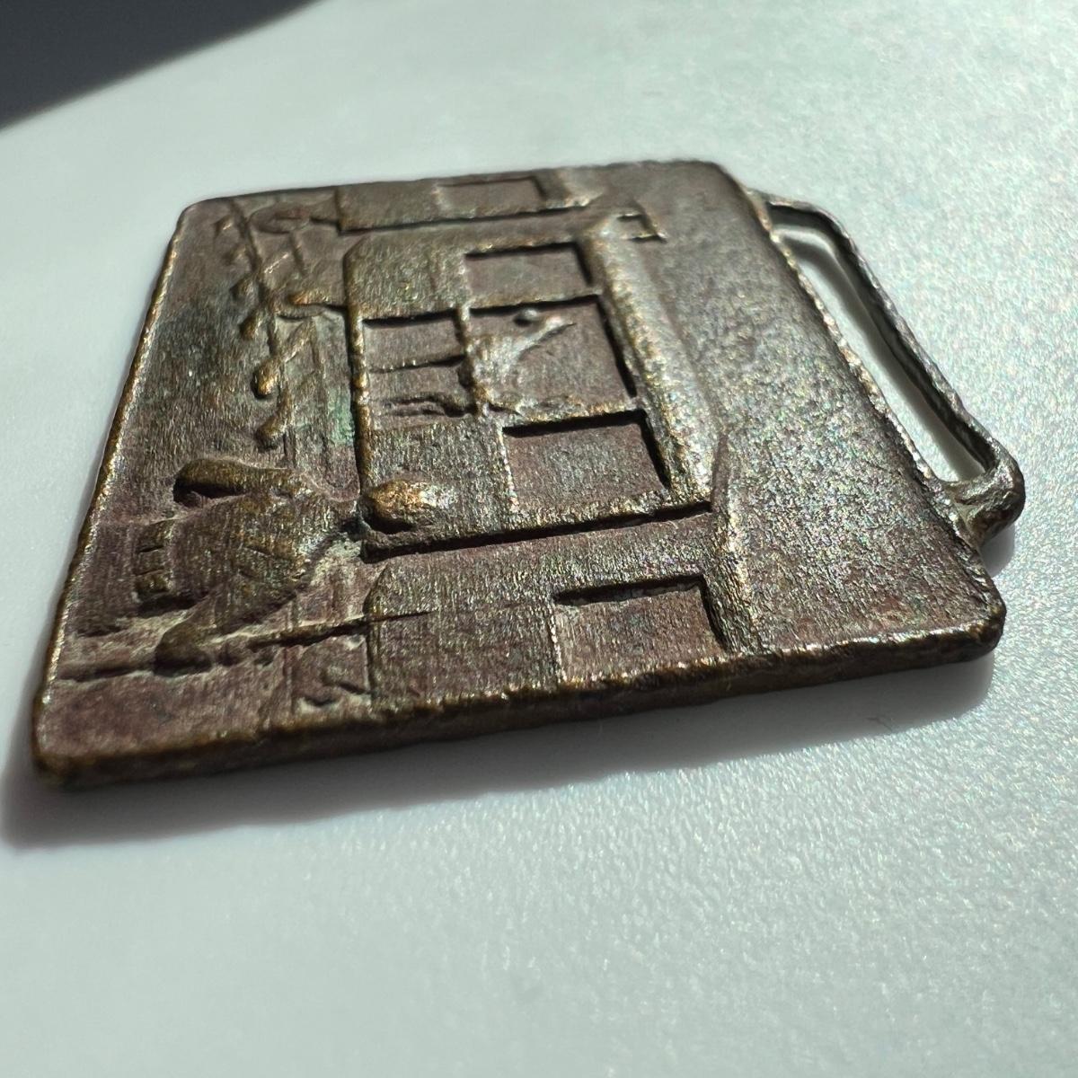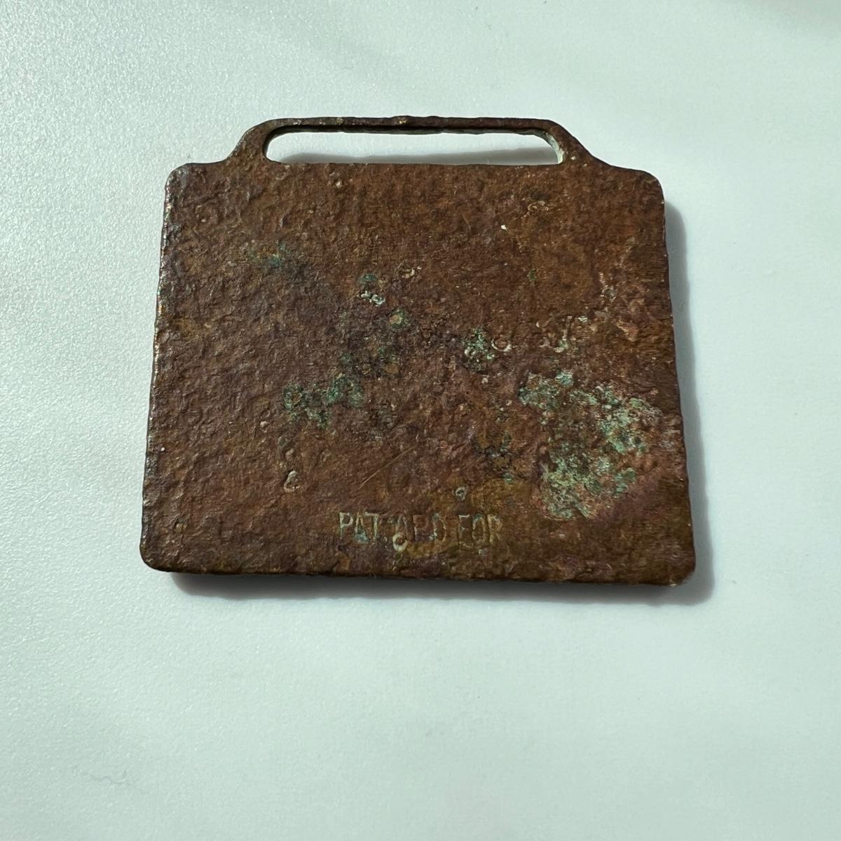 Antique WWI World War One metal fob. It features a French Poilu looking at a wooden railroad boxcar with a horse and soldier in the doorway and with a sign on the side that reads, “40 Hommes/8“