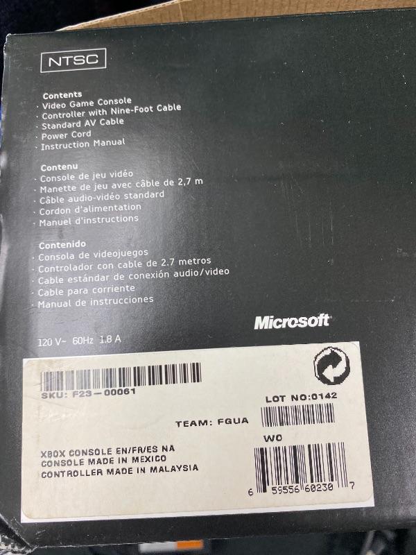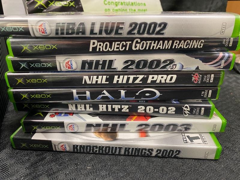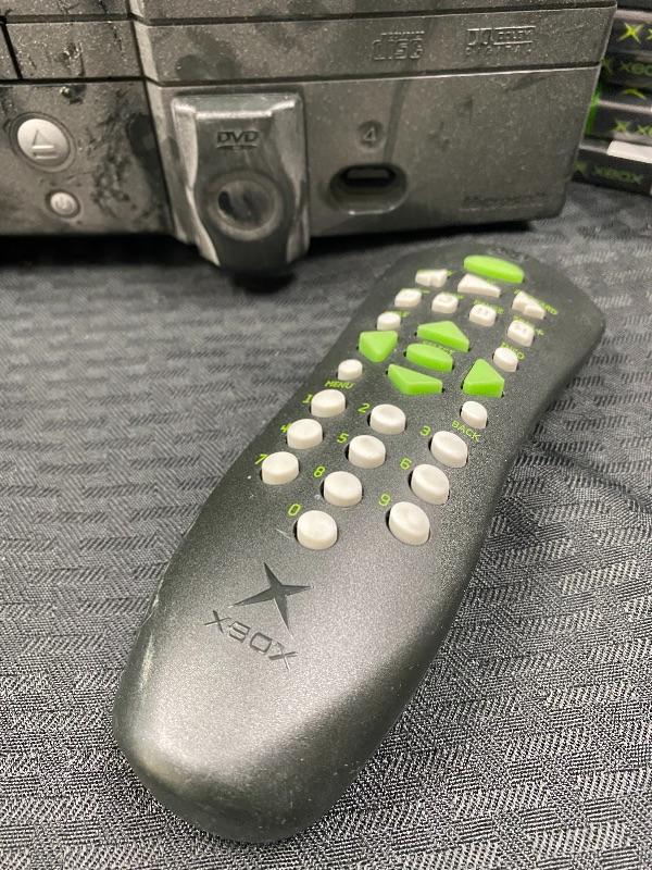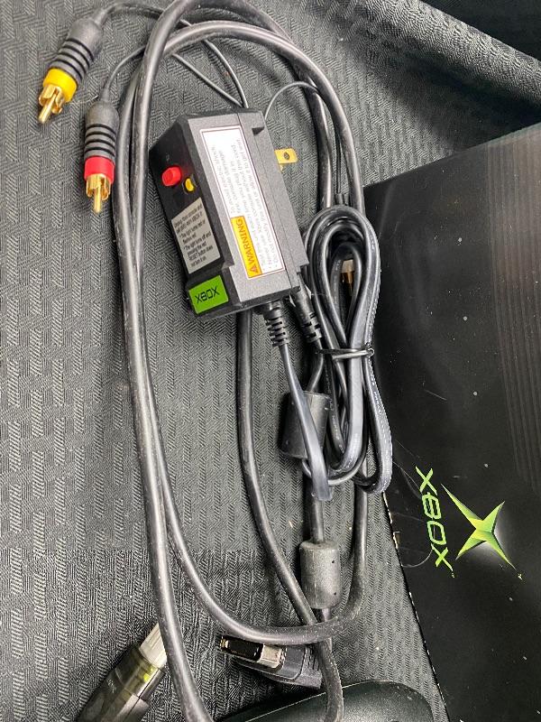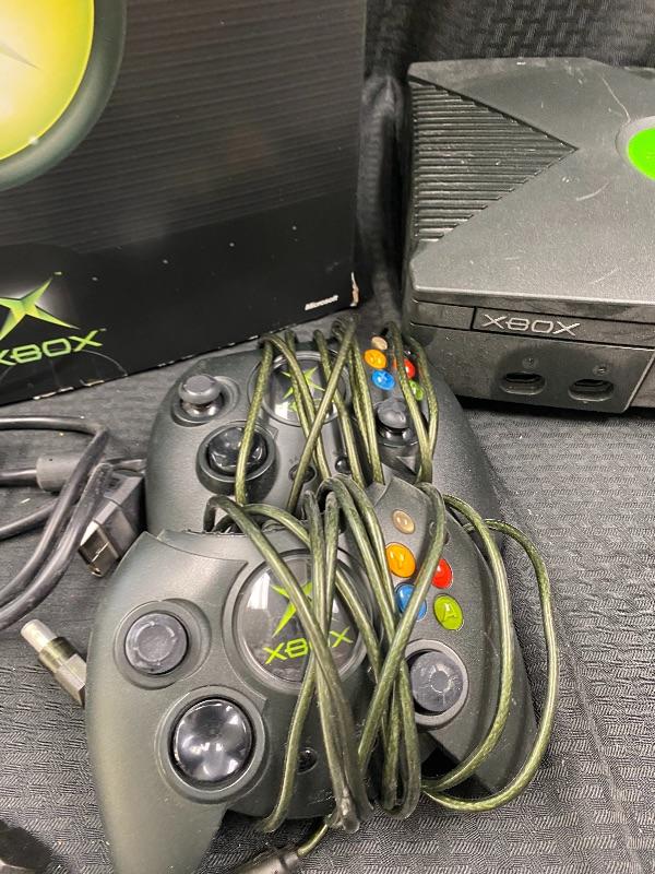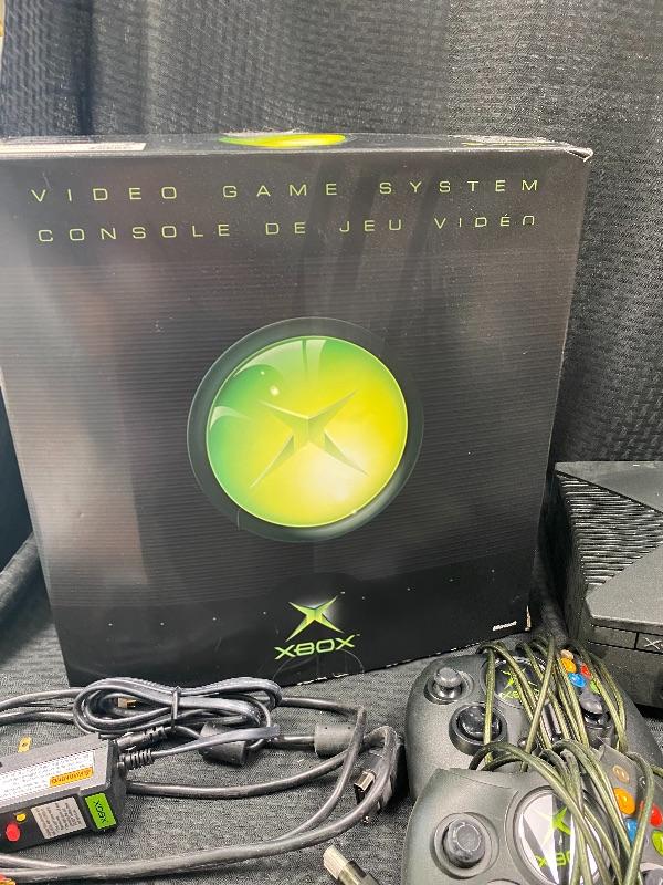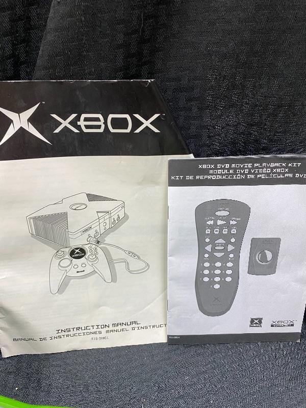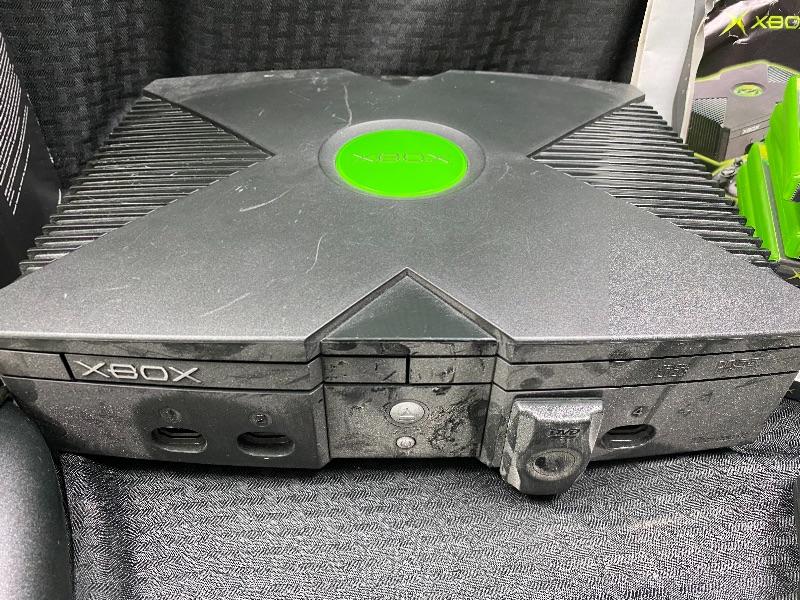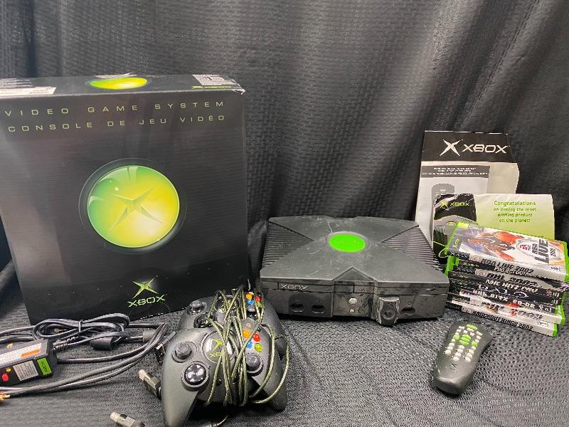 Original XBOX console with controllers and games. Console turns on and sounds good when running, did not connect to a TV, does not use HDMI, uses A/V cable. Games are in fair to good condition, some smudges and spots. Comes in original box with instructions. Has remote and DVD playback adapter.