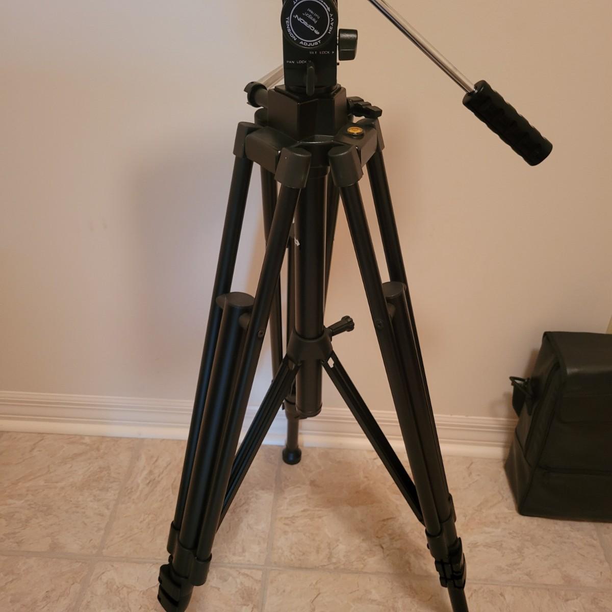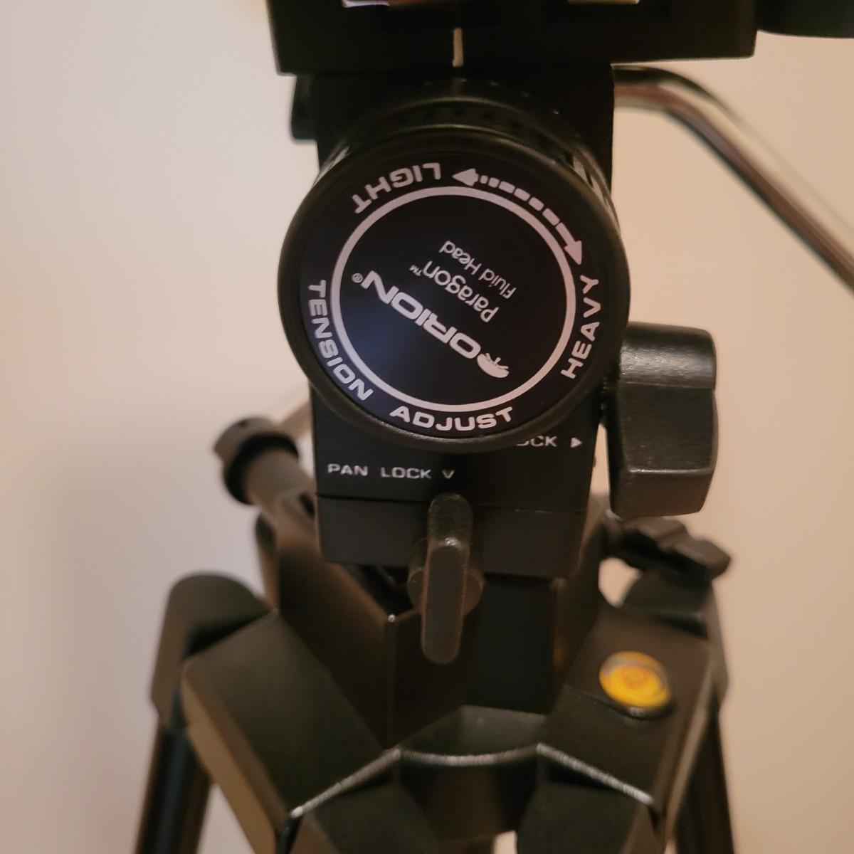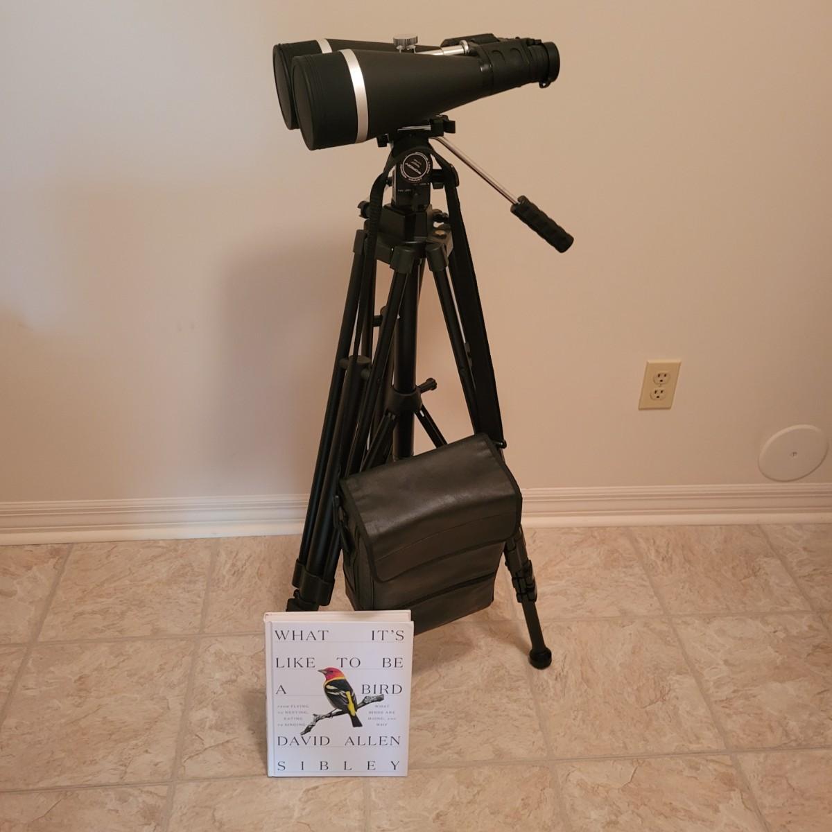 A pair of Orion binoculars with an Orion tripod and a book on birds. The binoculars are 20x80 with 168' at 1000 yards. They come with a carrying case and lens covers. The Orion Paragon tripod has adjustable height legs with tilt and pan functions and built in leveling bubble. The binoculars measure approximately 13.5" x 9" x 4". Also included is a book titled " What It's Like To Be a Bird". Local pickup only