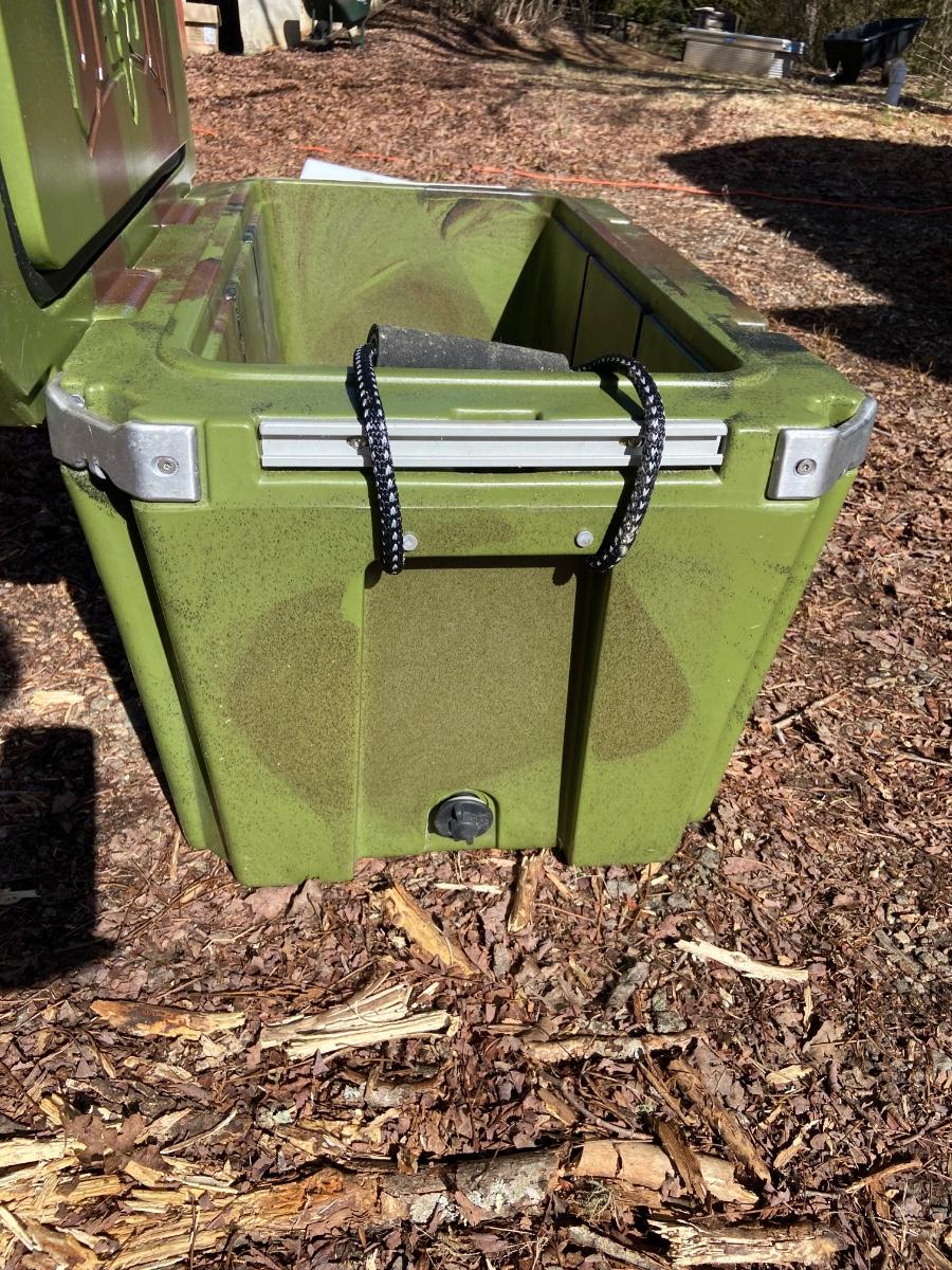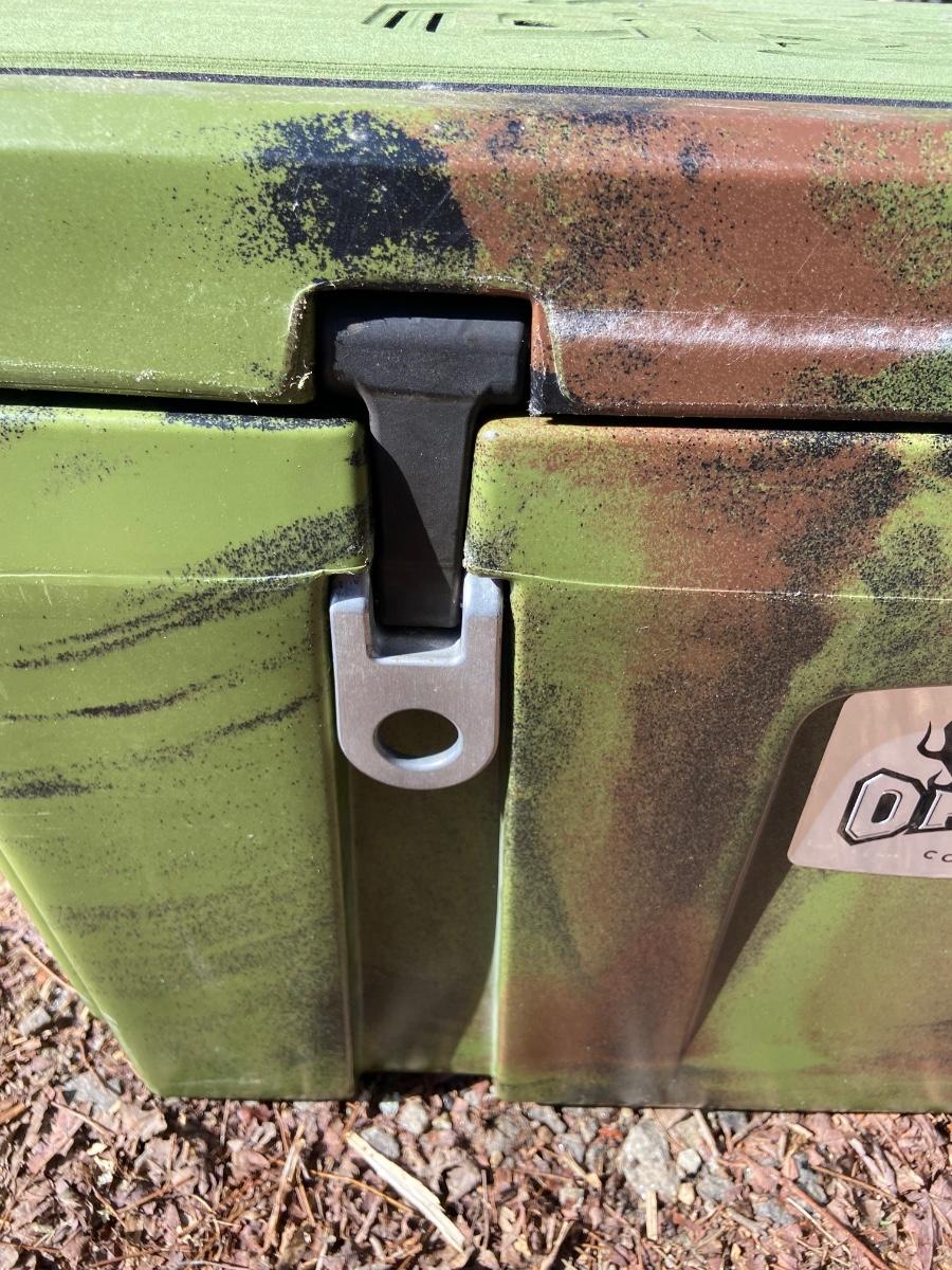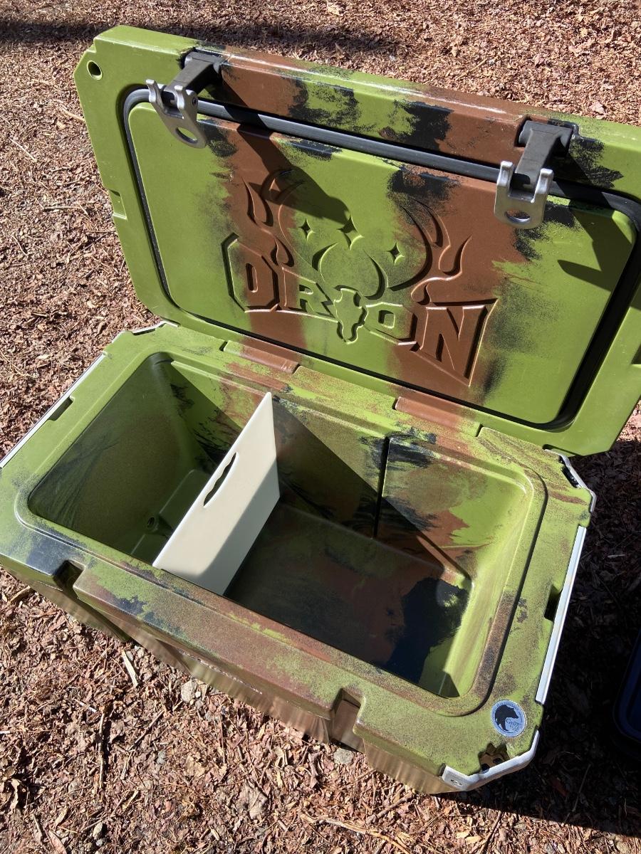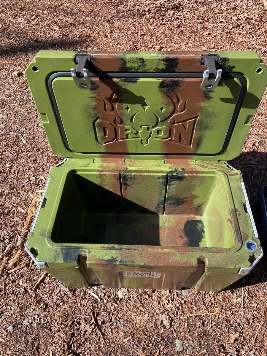 This lot is an Orion heavy duty 65 quart insulated outdoor cooler. It measures 32” x 18.5 x 18”H. It is a forest green color and has a “Certified Bear Resistant” stamp on the inside. This premium cooler comes with two plastic tote inserts and a plastic cutting board that seconds as a divider. The clasps appear to be plastic and metal and each corner has a bottle opener built in. Local pick up only.
