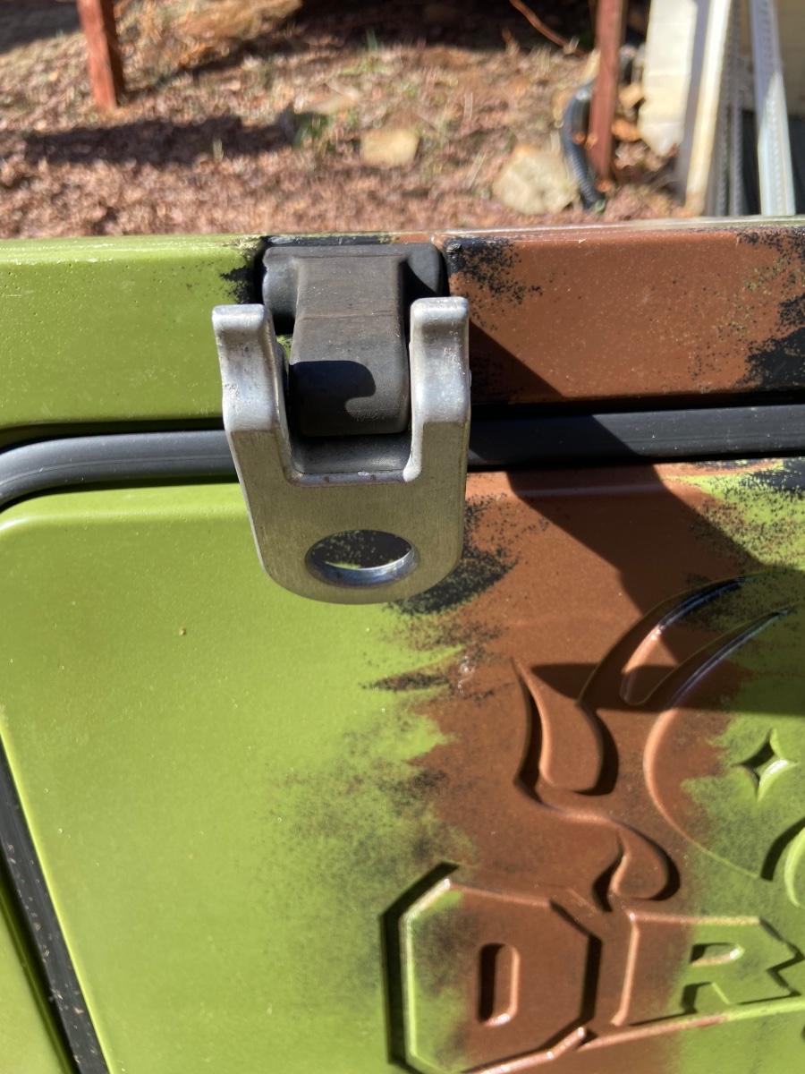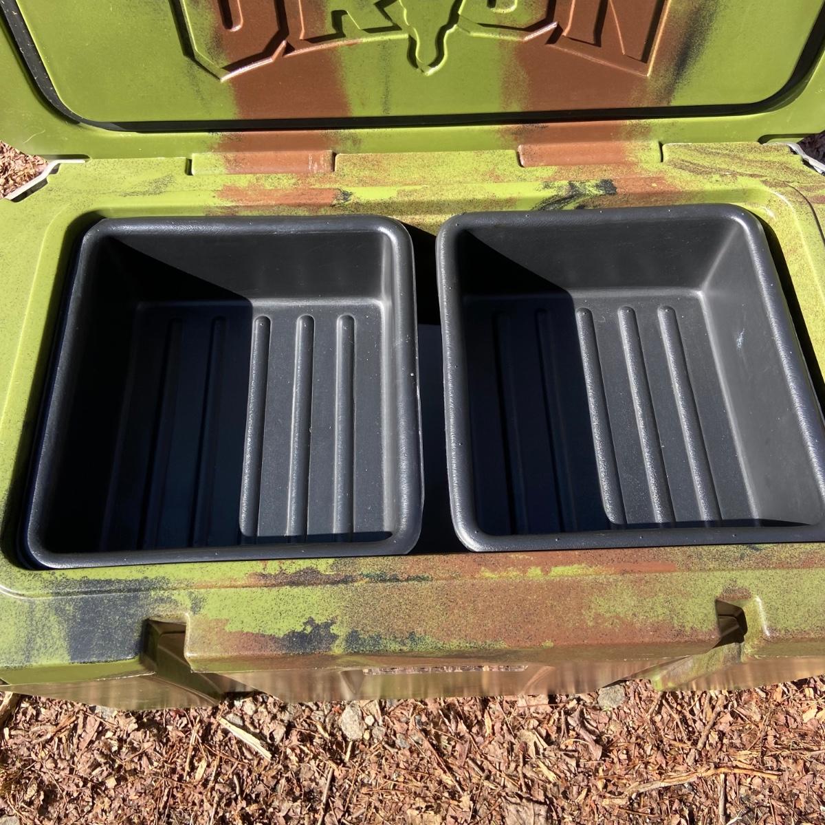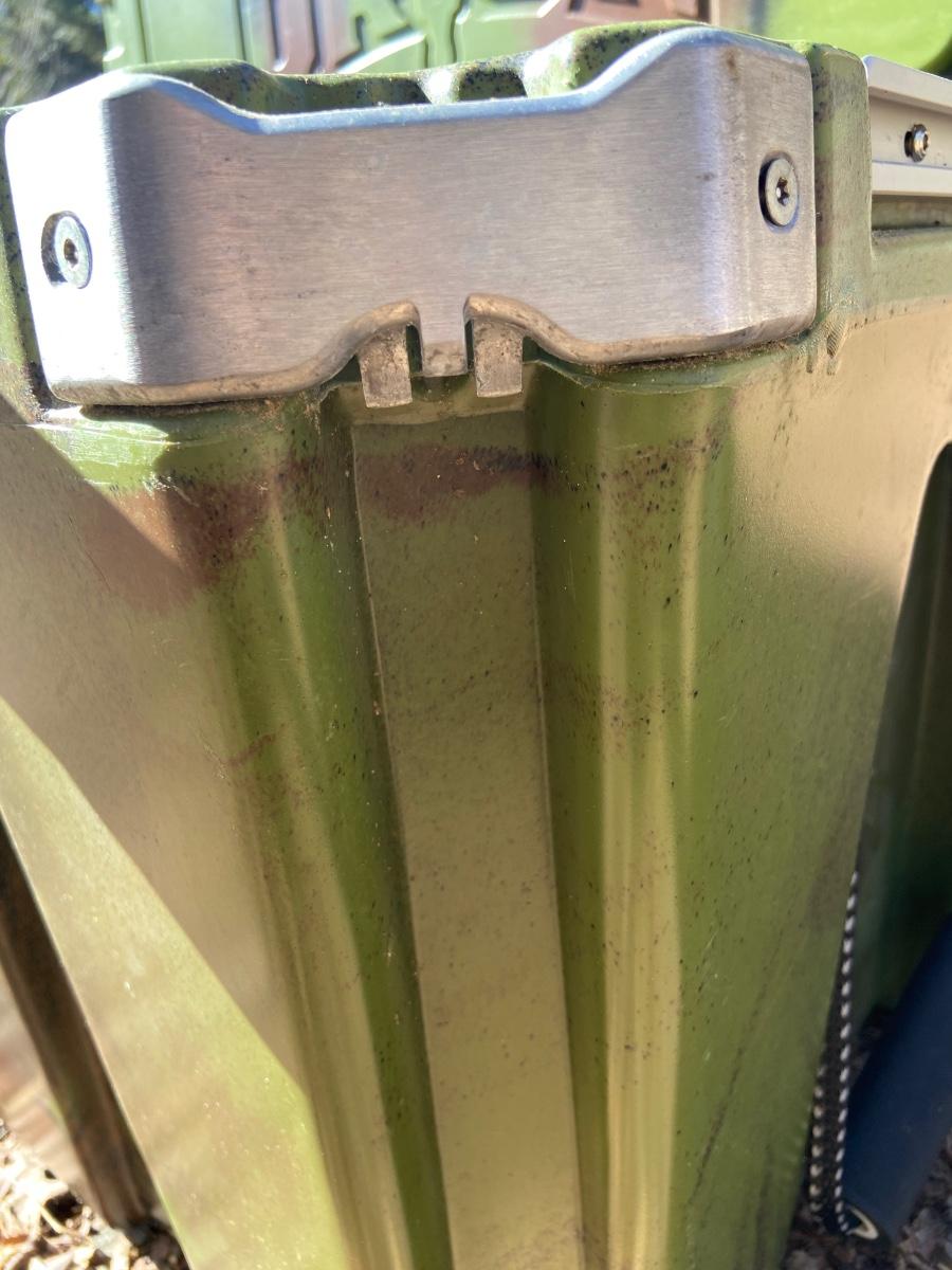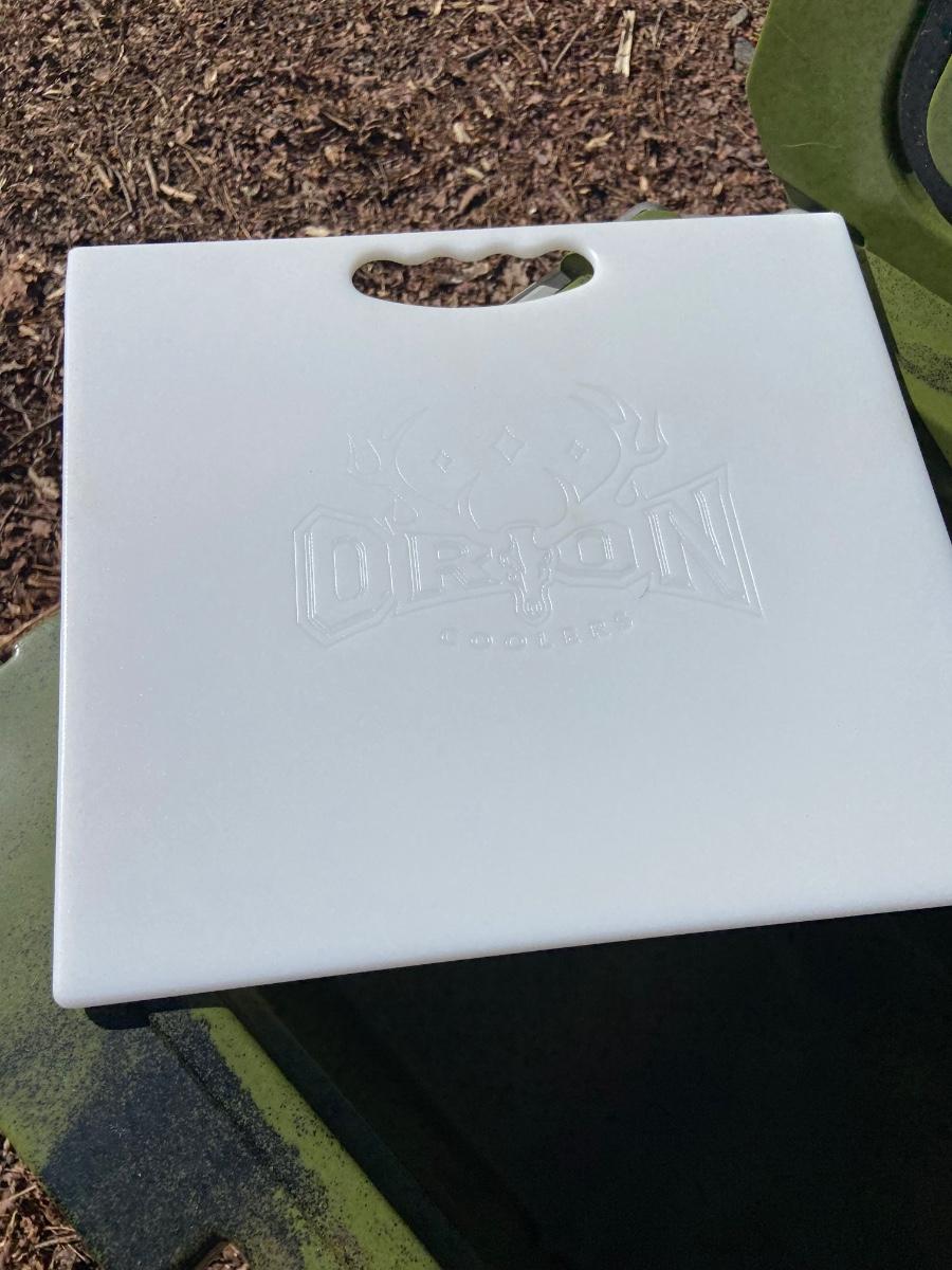This lot is an Orion heavy duty 65 quart insulated outdoor cooler. It measures 32” x 18.5 x 18”H. It is a forest green color and has a “Certified Bear Resistant” stamp on the inside. This premium cooler comes with two plastic tote inserts and a plastic cutting board that seconds as a divider. The clasps appear to be plastic and metal and each corner has a bottle opener built in. Local pick up only.