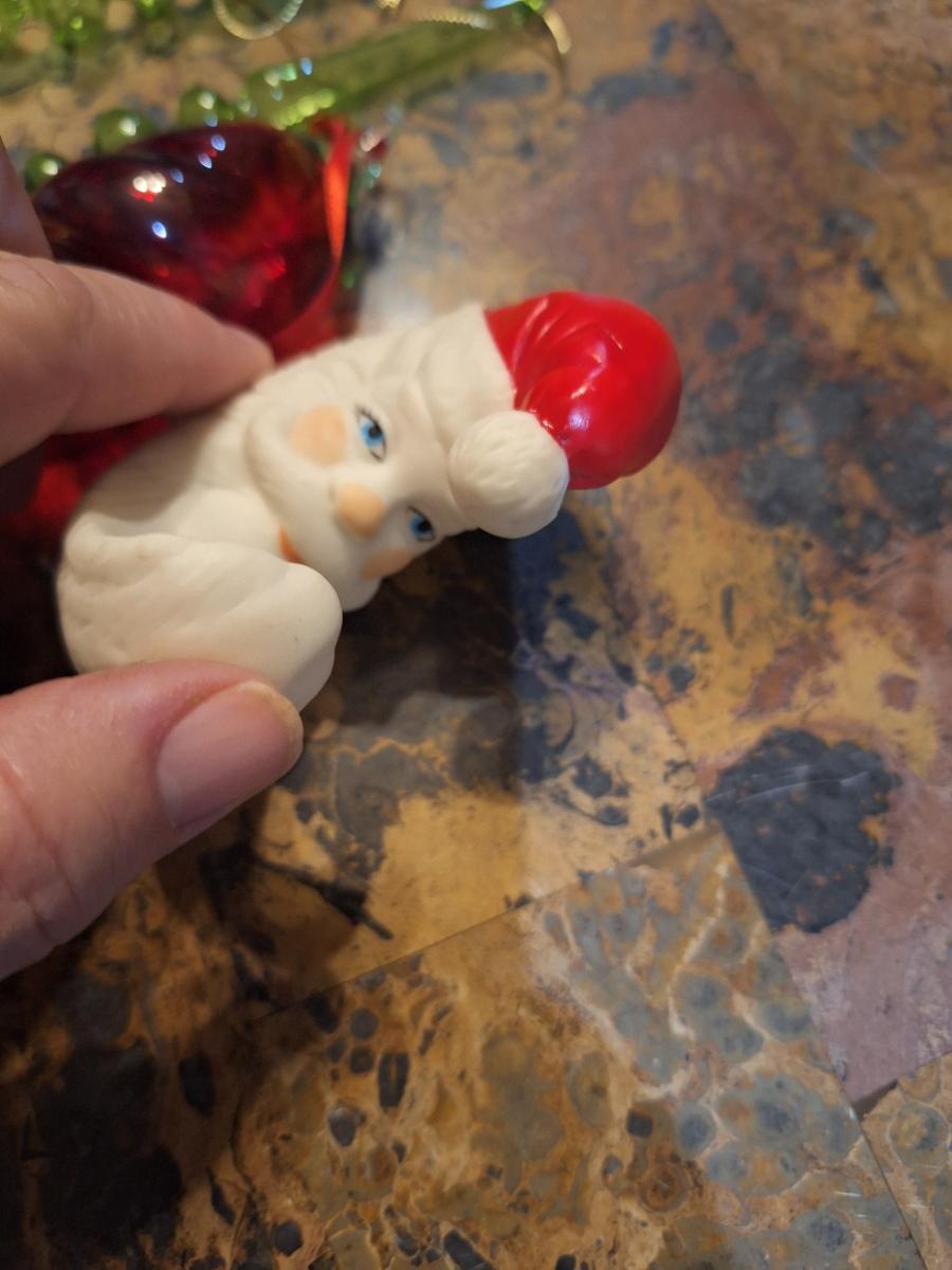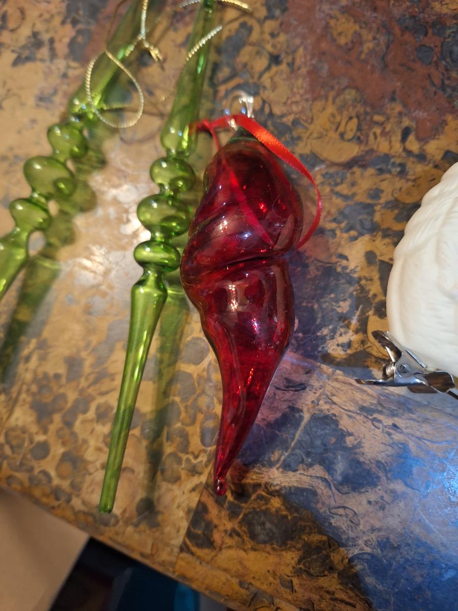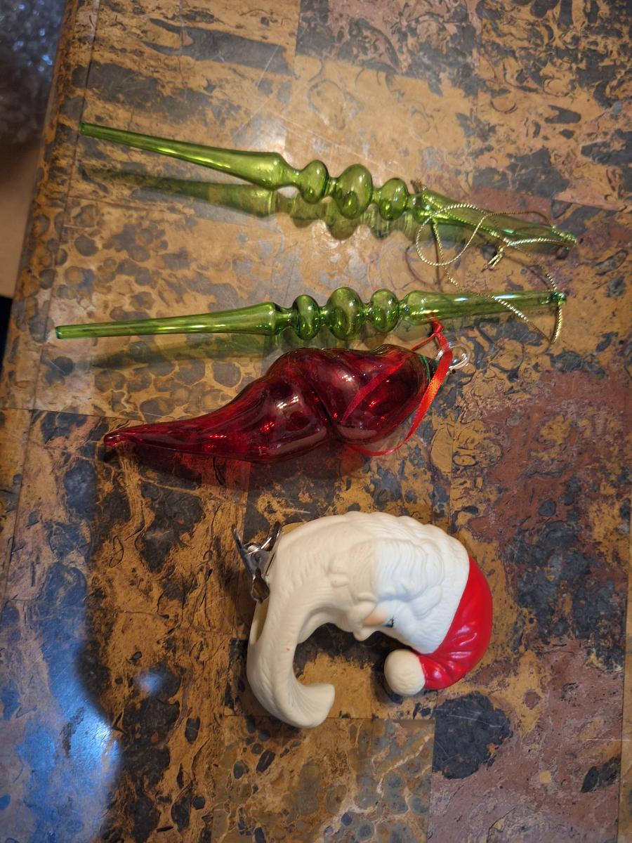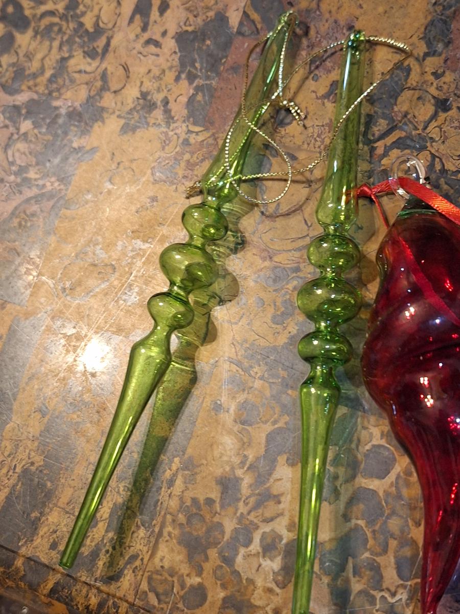 the green and red ones are blown glass, Santa appears to be ceramic or similar.