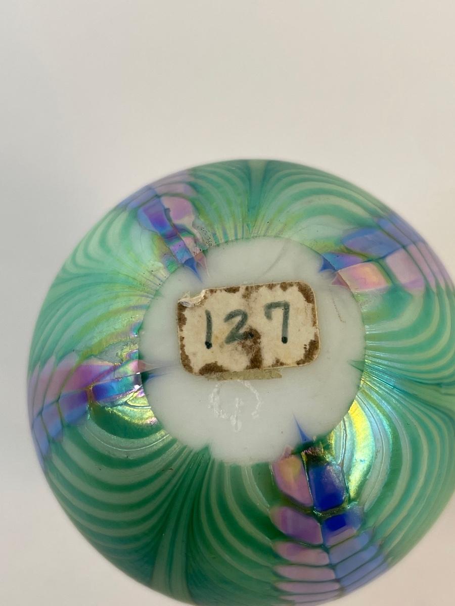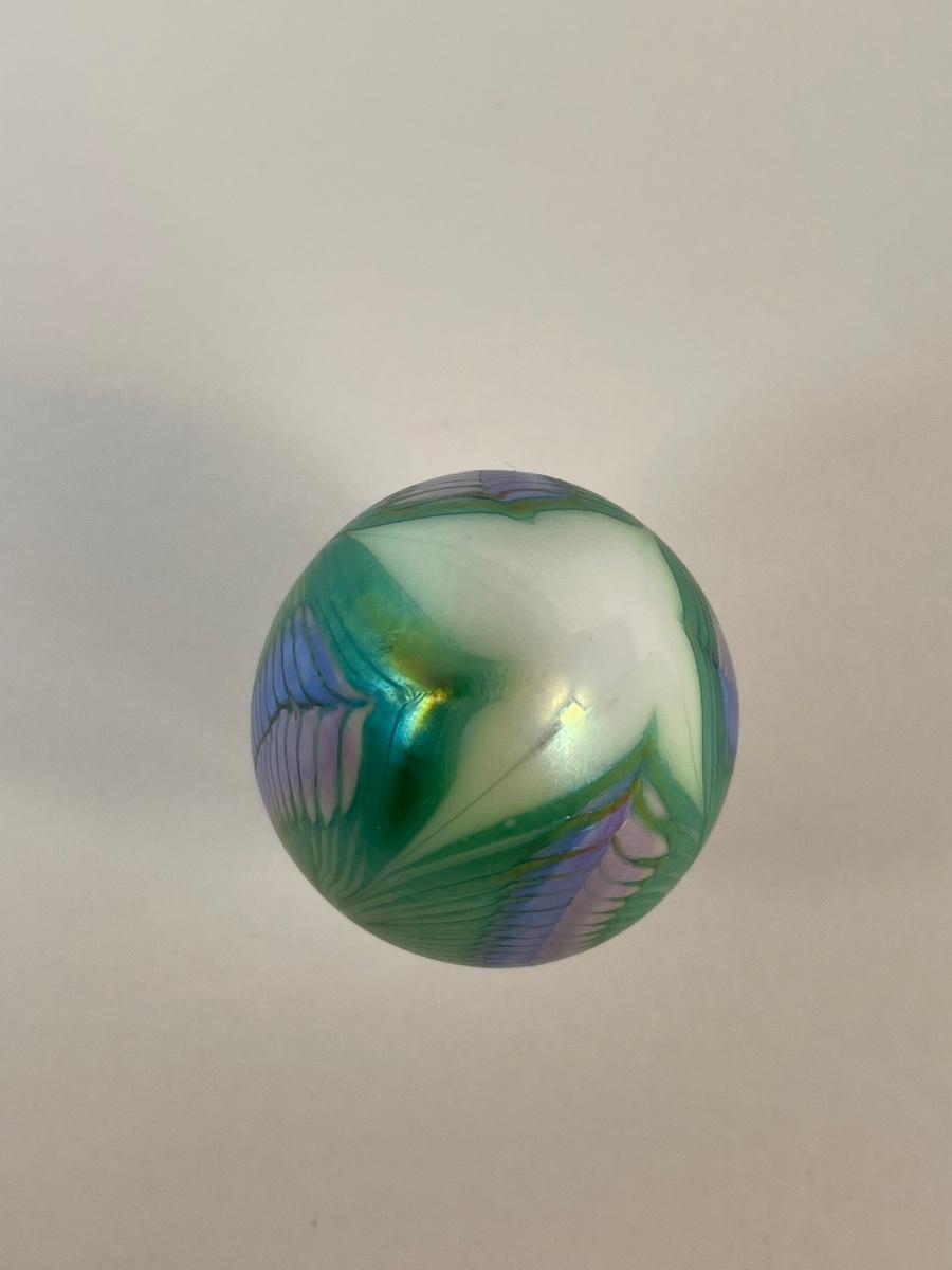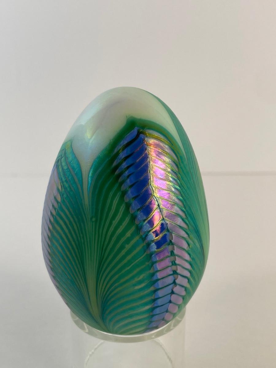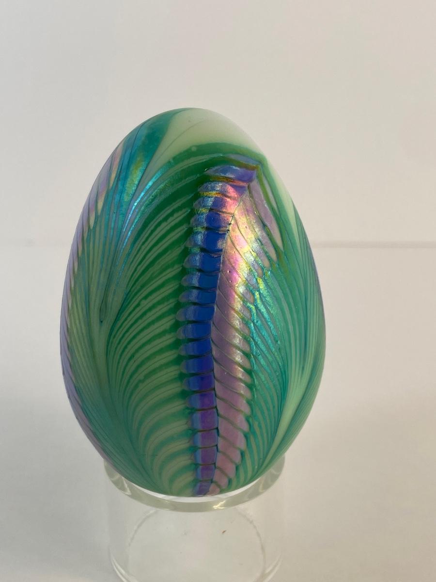 Oregon Blown Glass (OBG etched on the bottom, but obscured by label) egg shaped iridescent blue and green pulled feather pattern on opaque white paperweight, 2" x 3"