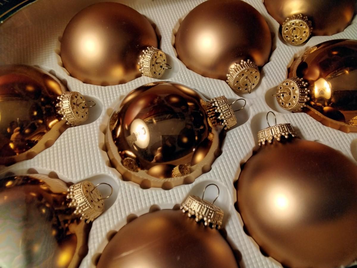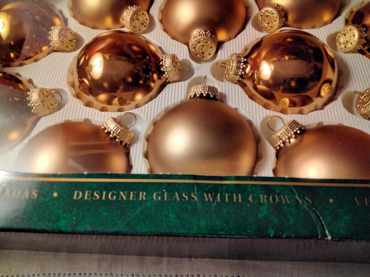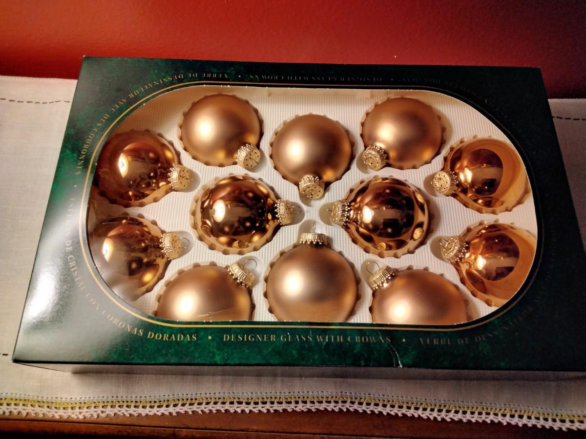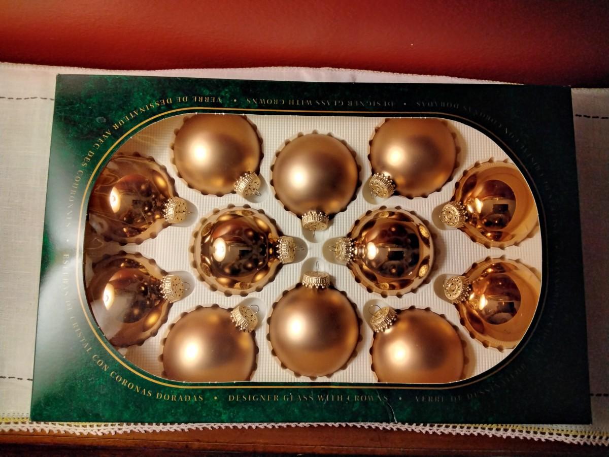 12 gold ornaments that are new in box. They were bought at Toys R Us.