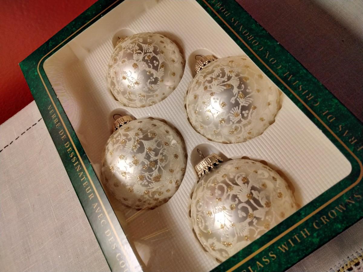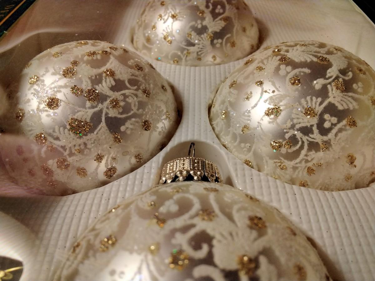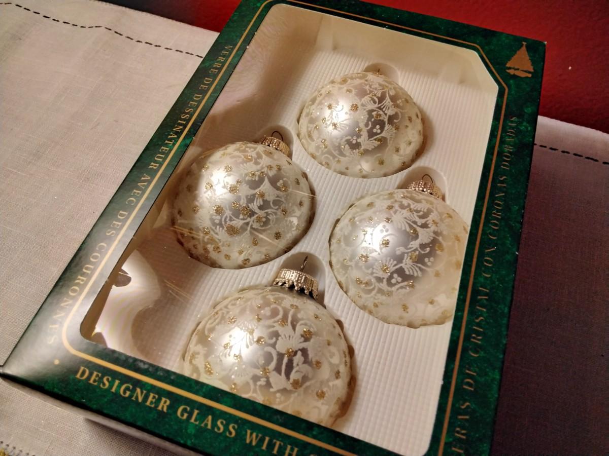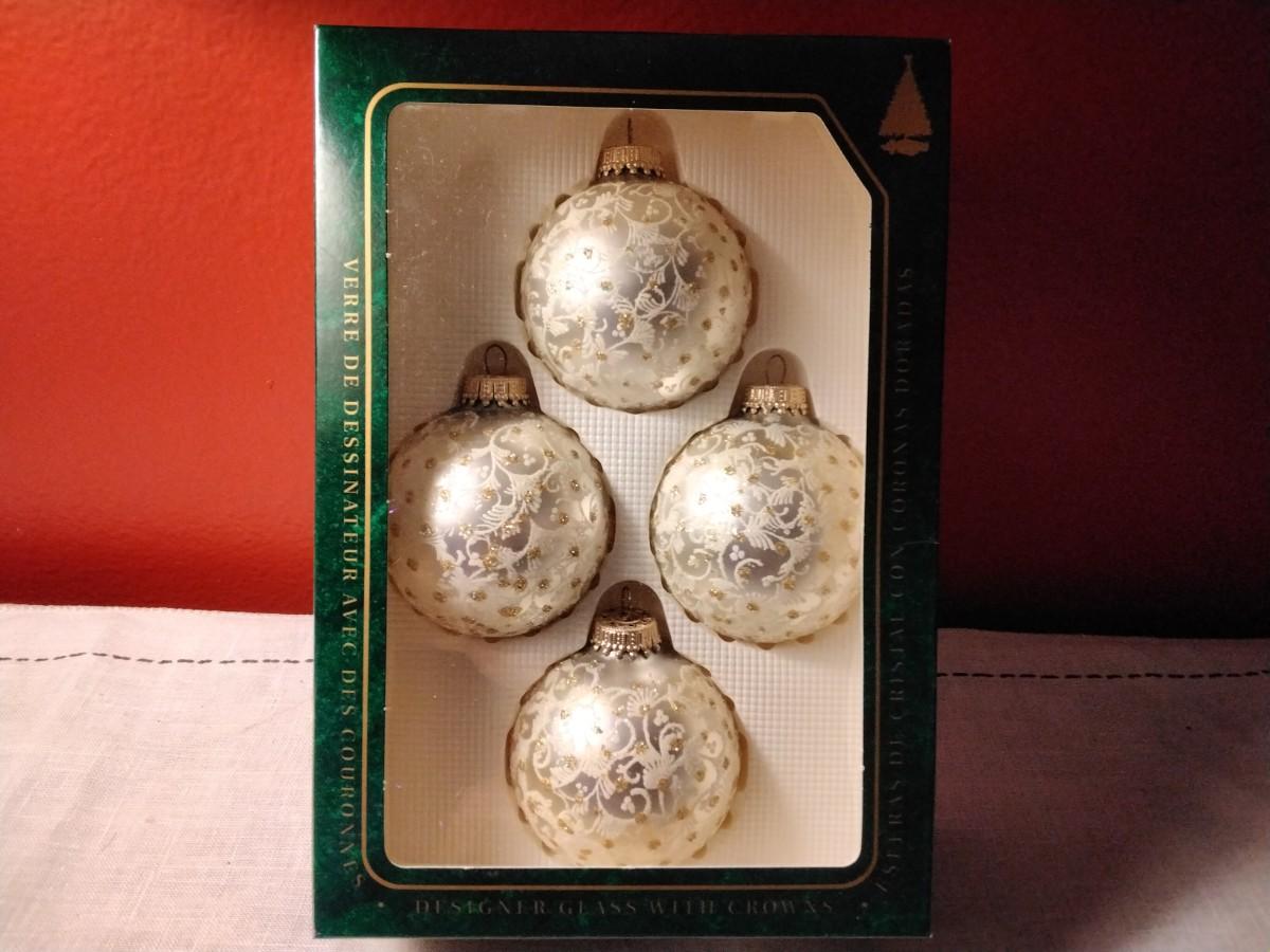 4 glass white ornaments that are new in box. They were bought at Toys R Us.