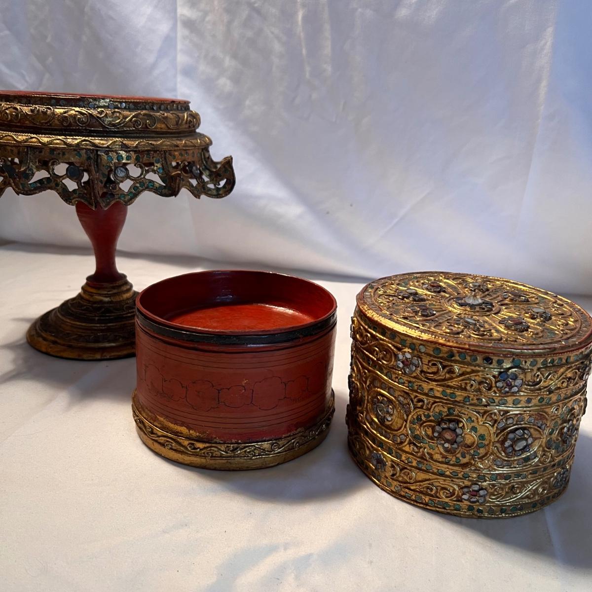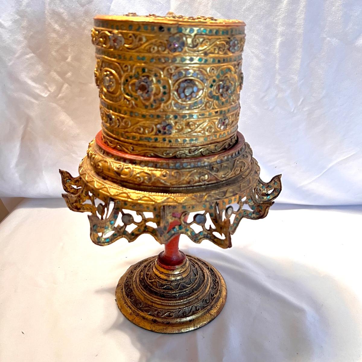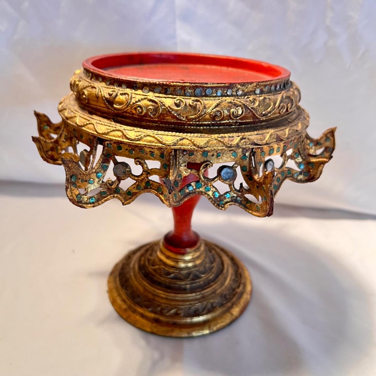 A glittery and unique ornate wooden betel box with matching stand.