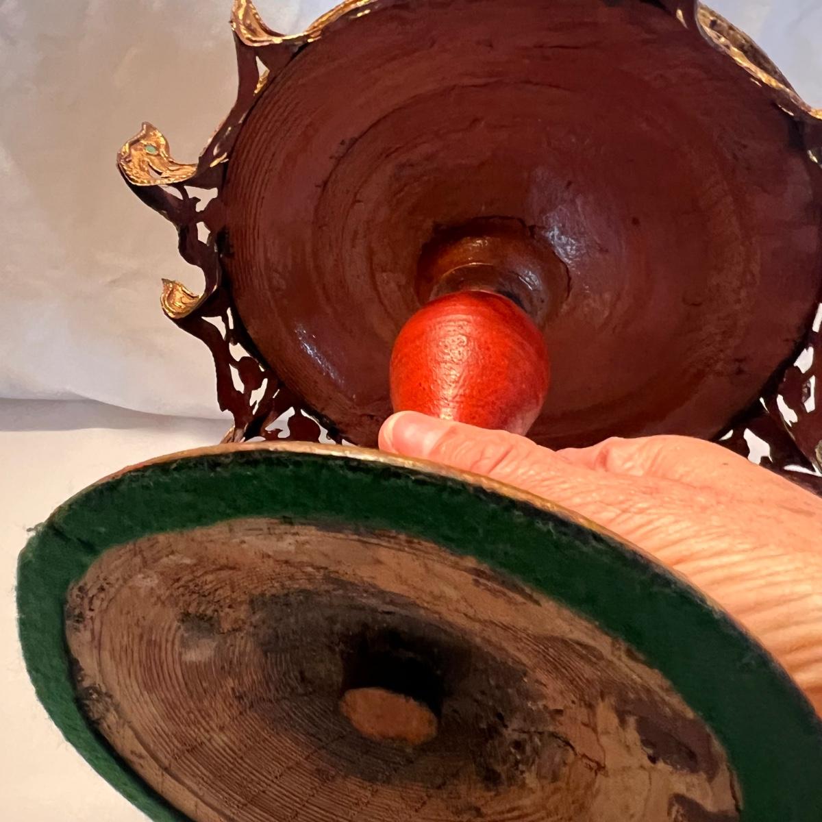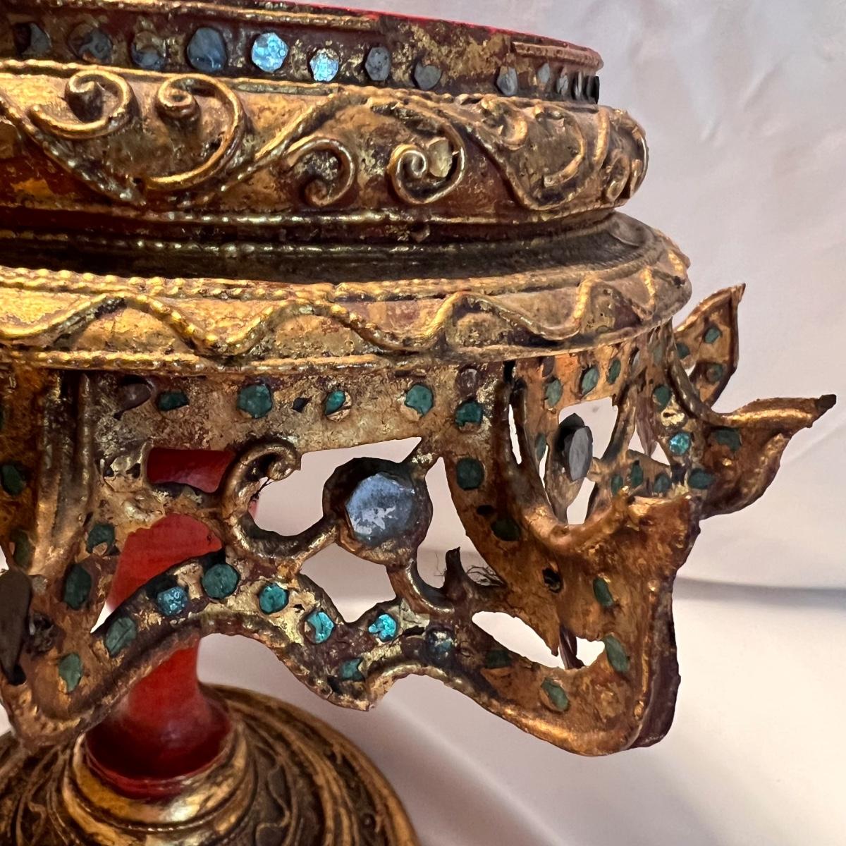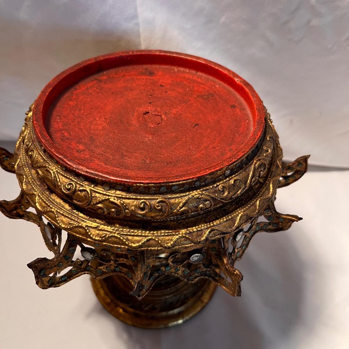 A glittery and unique ornate wooden betel box with matching stand.