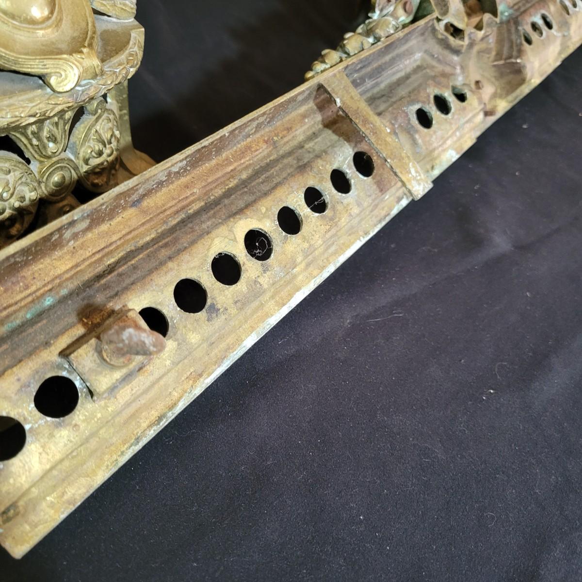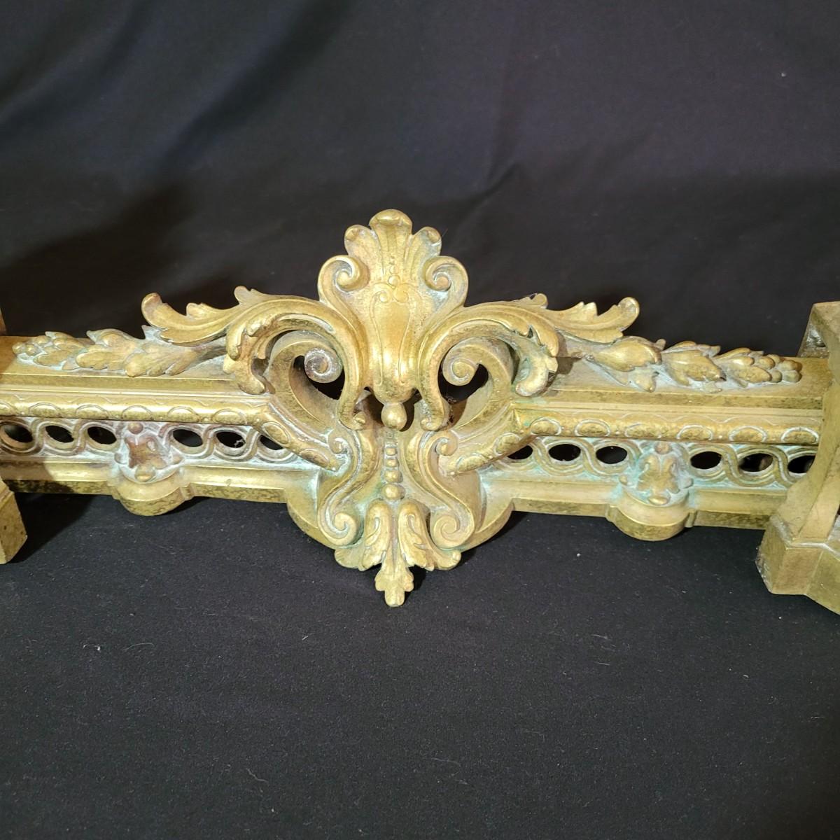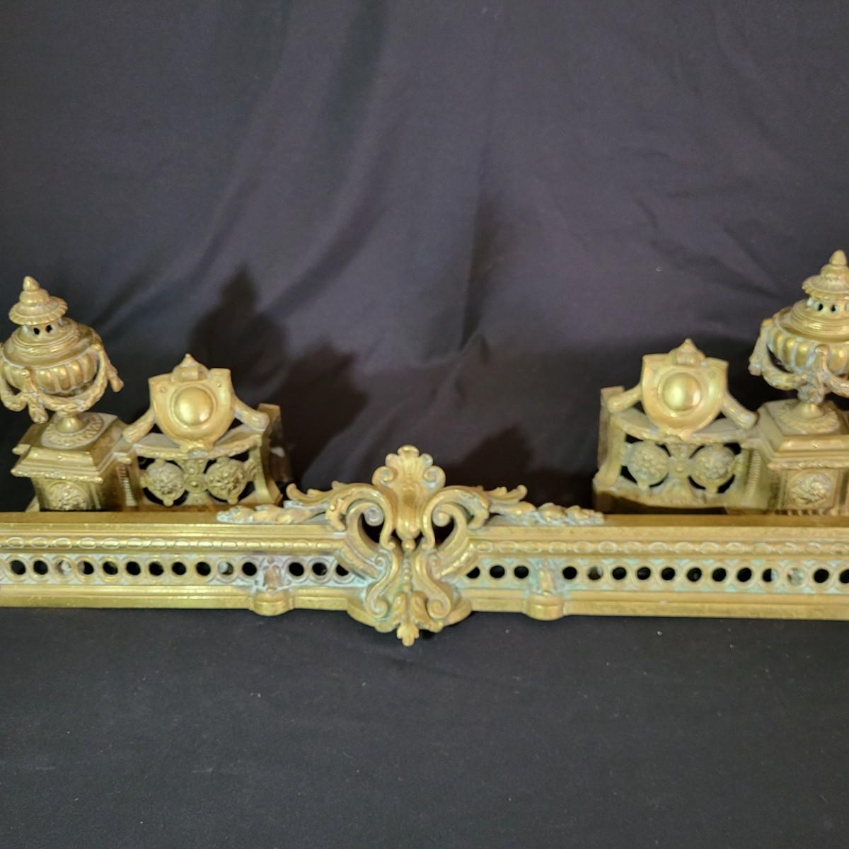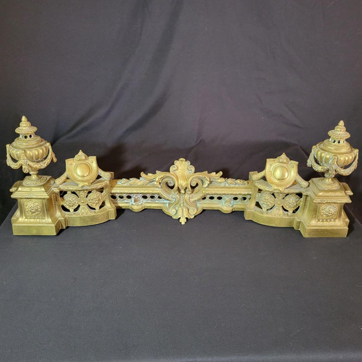 An ornate brass hearth guard in good condition with some patina. This piece has a heavy Old Europe flair with urns, sheids and other details. This comes in three pieces allowing it to be adjustable to different fireplace openings and is substantial enough to stop a rolling log. Measures approximately 31" x 5" x 10.5". Local Pick up only.