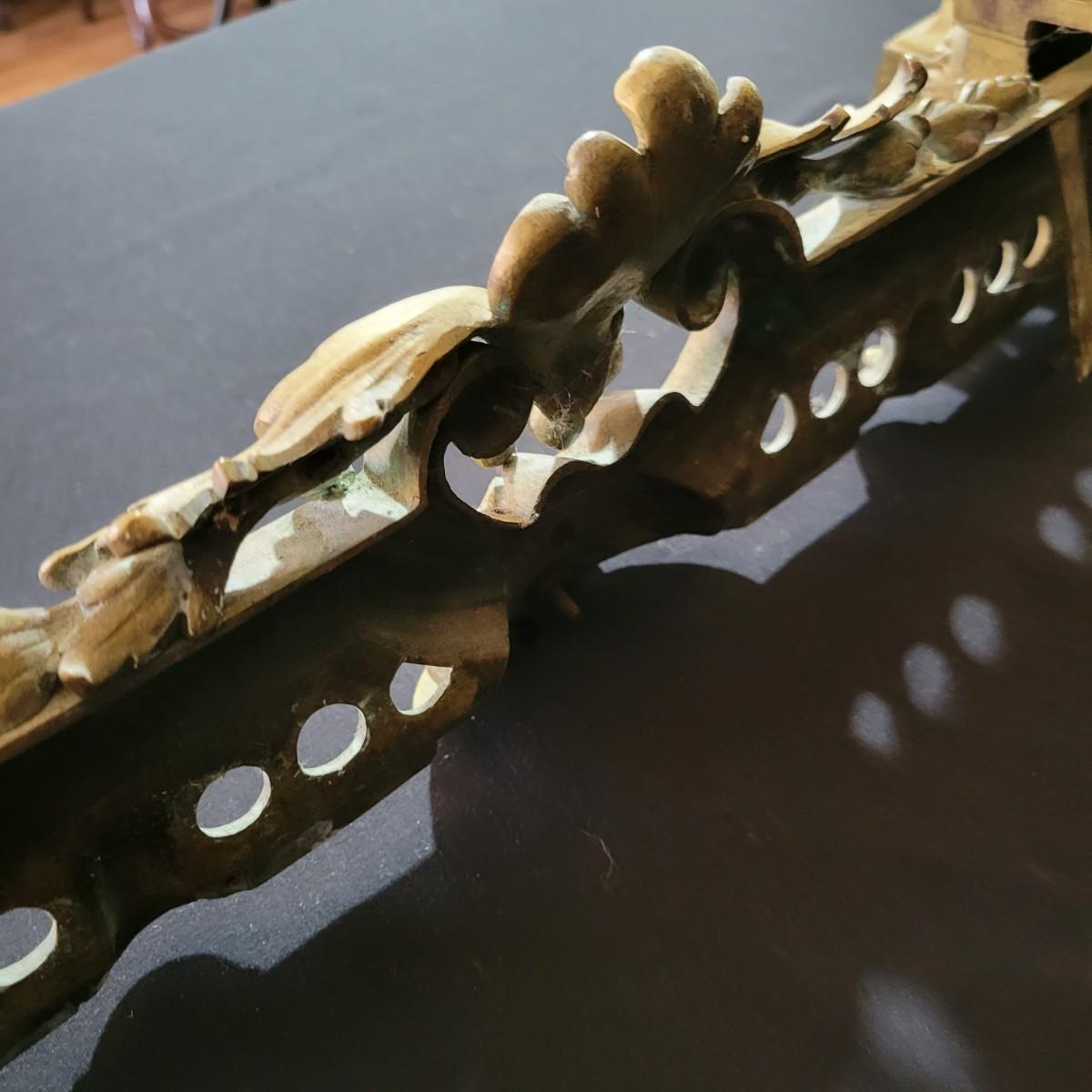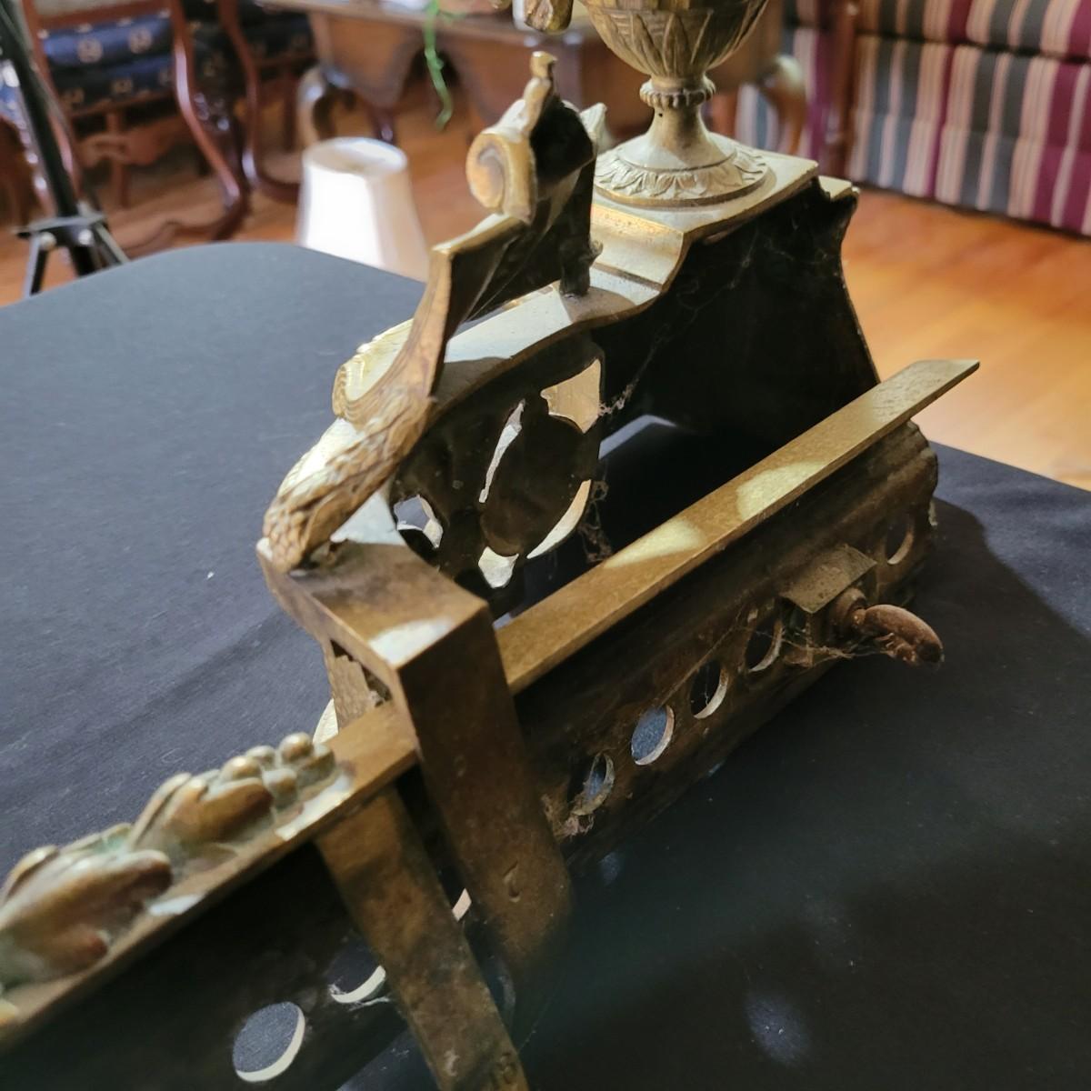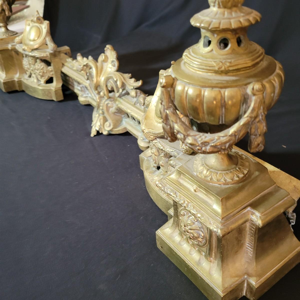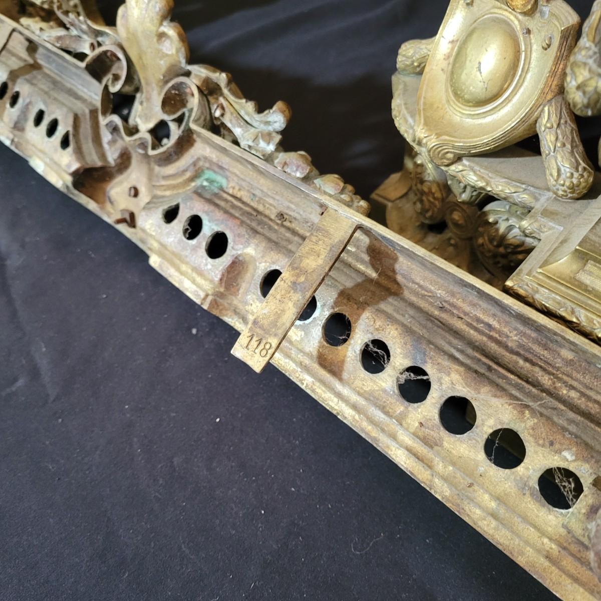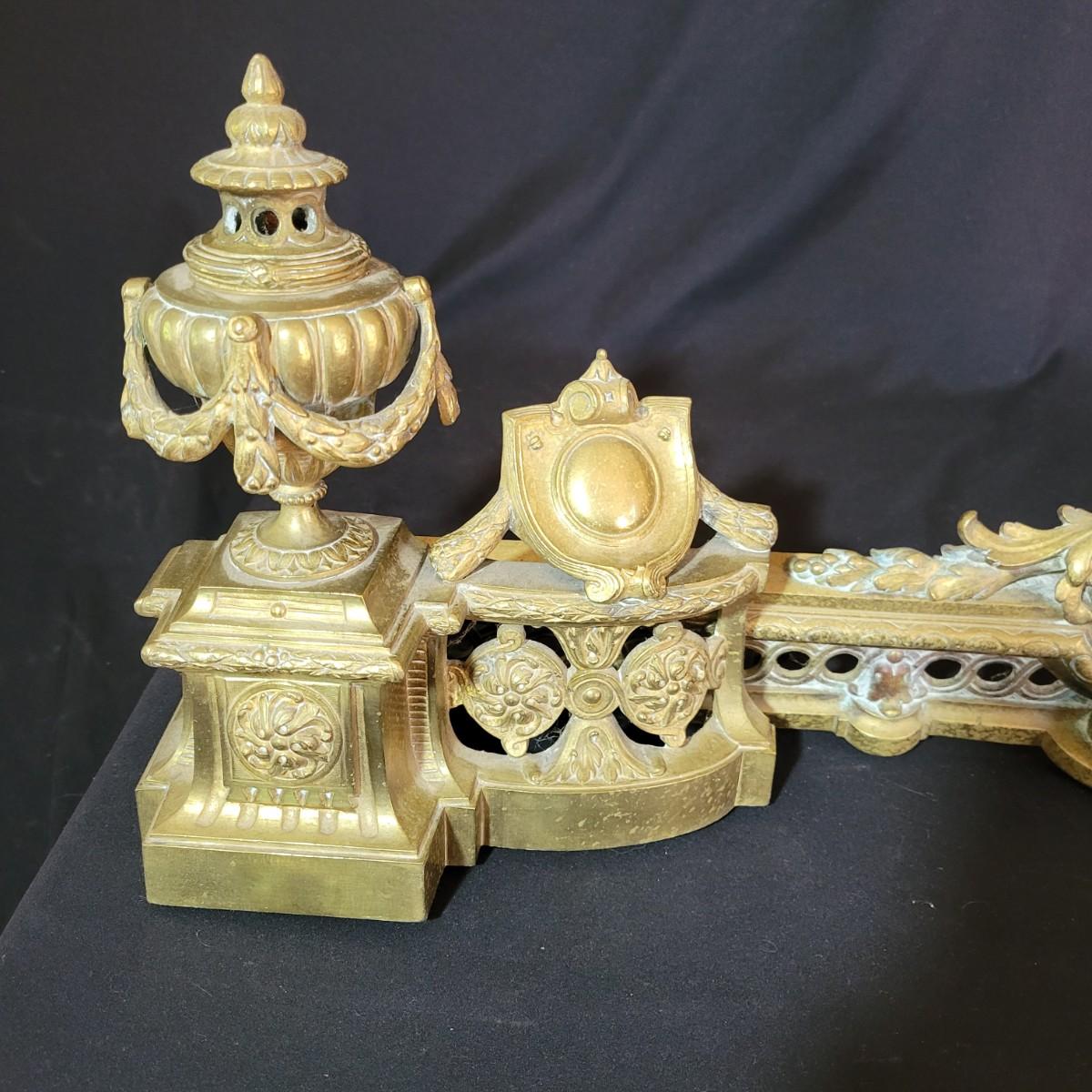 An ornate brass hearth guard in good condition with some patina. This piece has a heavy Old Europe flair with urns, sheids and other details. This comes in three pieces allowing it to be adjustable to different fireplace openings and is substantial enough to stop a rolling log. Measures approximately 31" x 5" x 10.5". Local Pick up only.