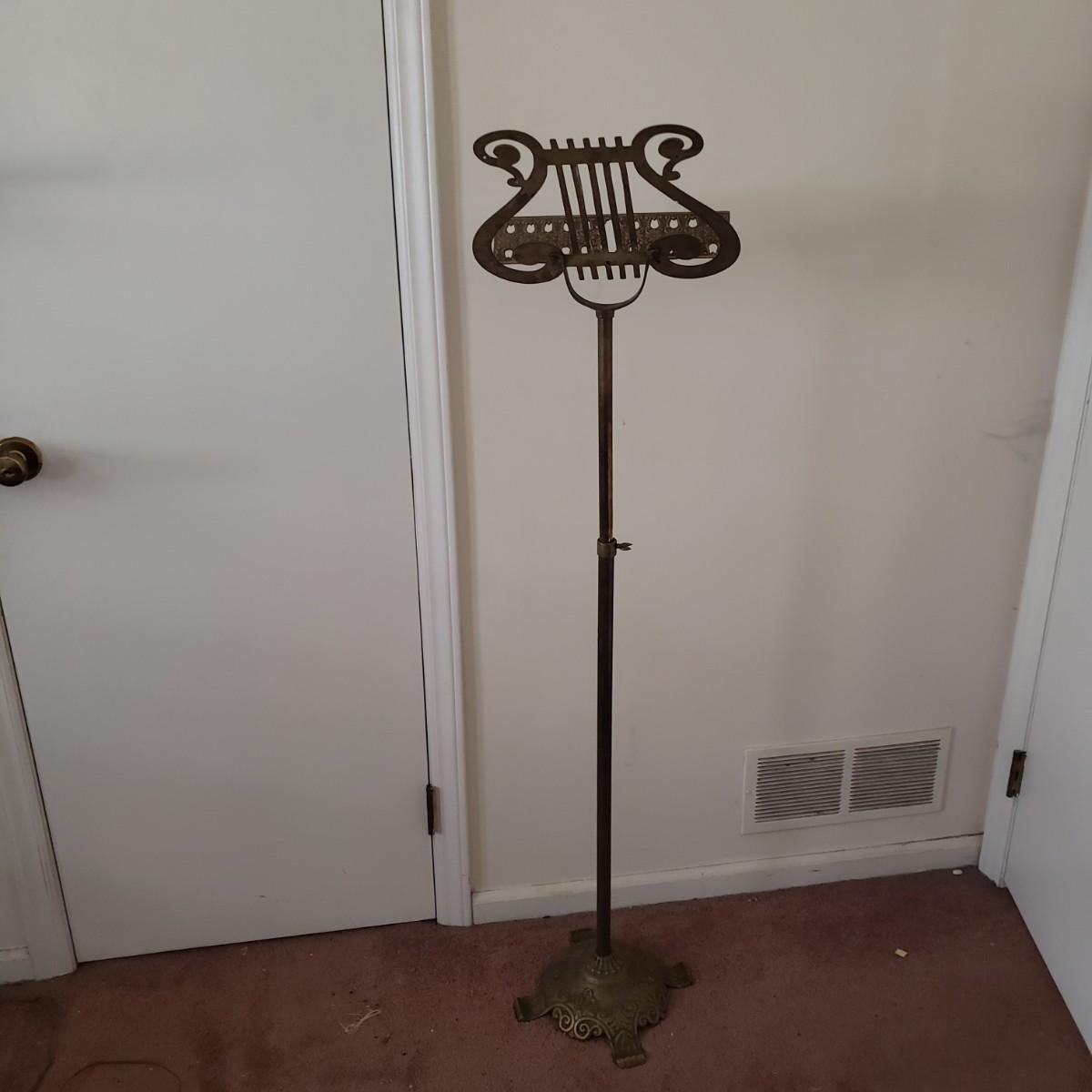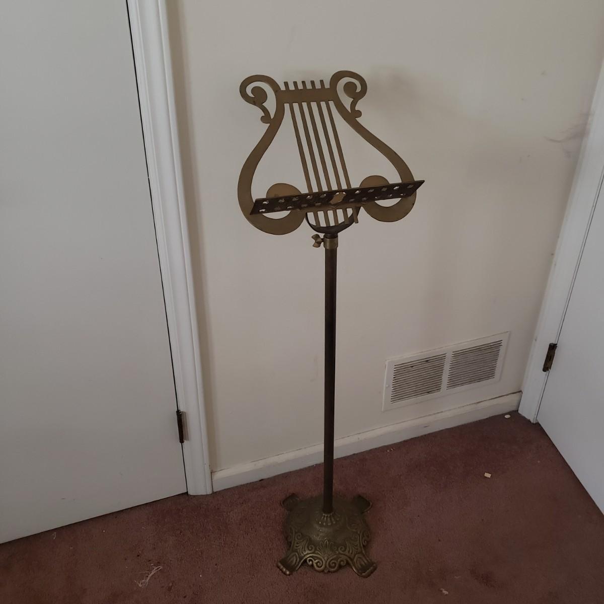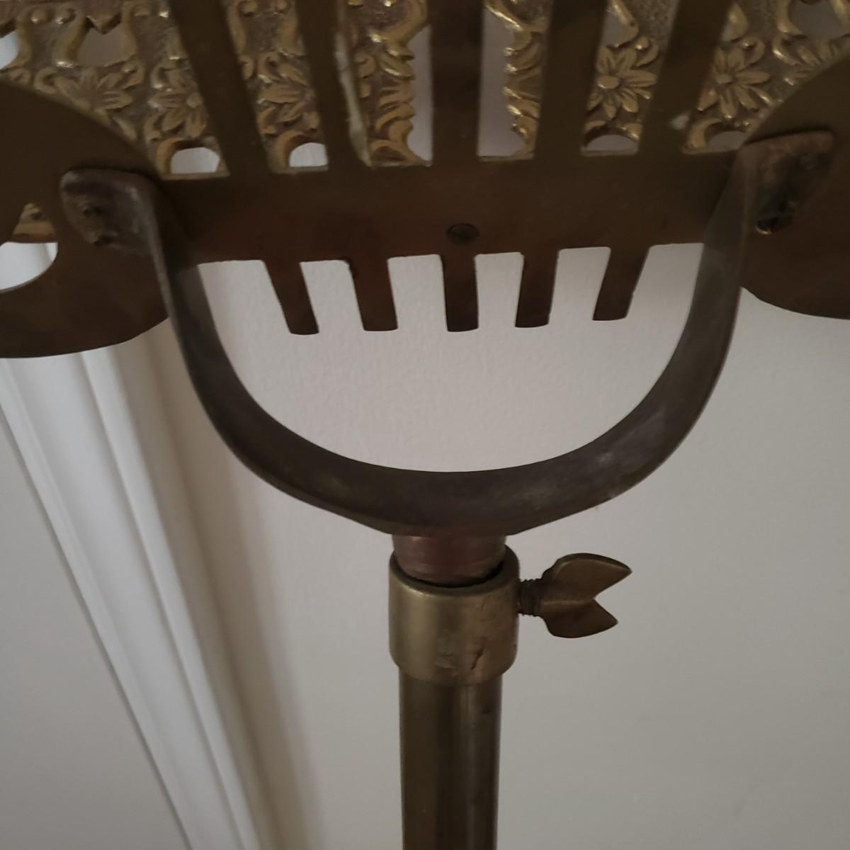 This brass music stand (12" x 13" x 42"H) features ornate craftmanship on the base and ledge for holding music sheets. The stand is adjustable and can reach 55"H and the lowest is 42"H.
