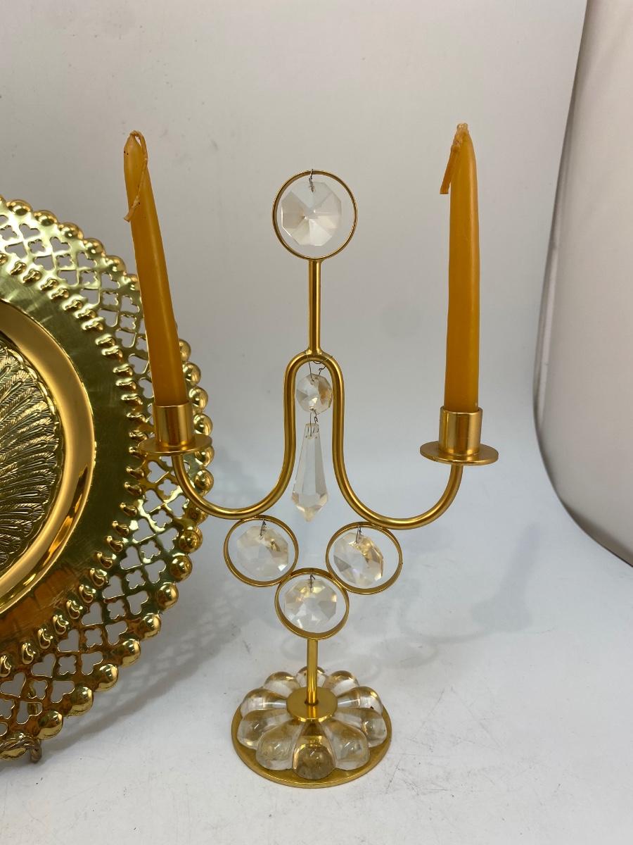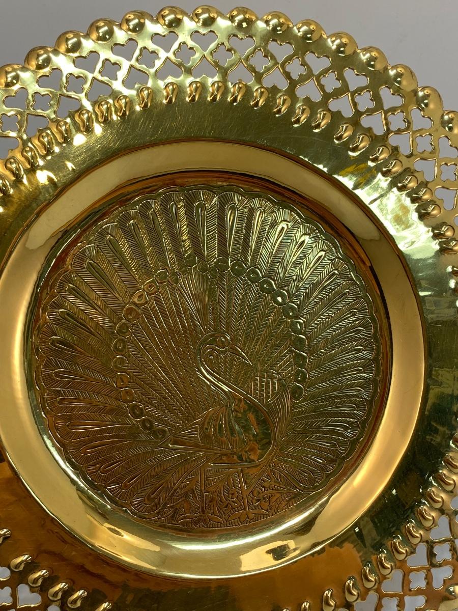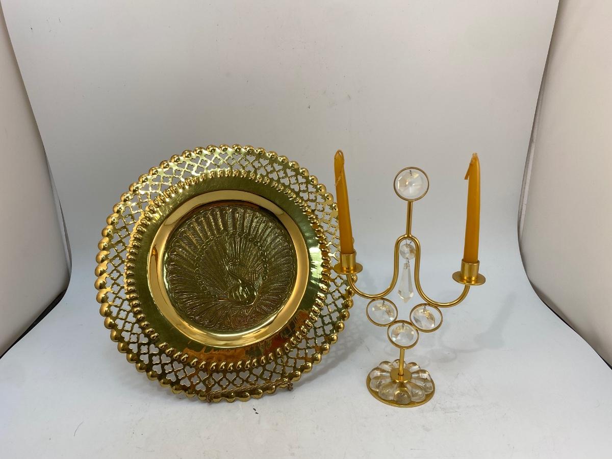 Ornate Brass Peacock Wall Plate & Midcentury Lovsjo Sweden Gold Plate Candle Holder