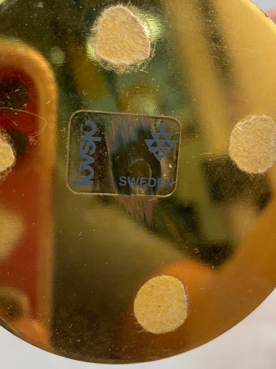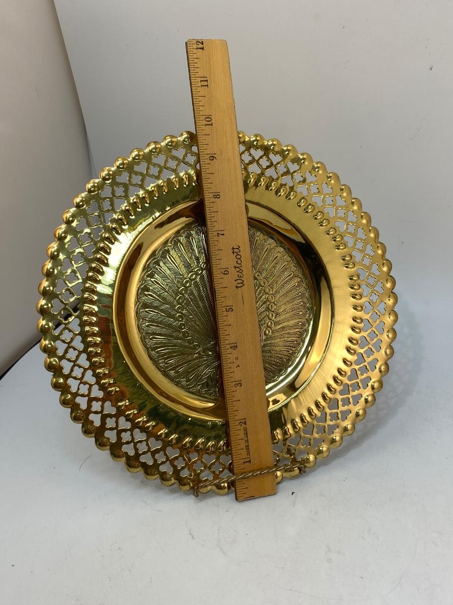 Ornate Brass Peacock Wall Plate & Midcentury Gold Plate Candle Holder. Both in very good condition. Candle holder has original maker sticker on the bottom, Made in Sweden by Lovsjo, about 8.5" tall. Wall hanging plate has open work edge and stamped peacock design in the center, about 10" size.