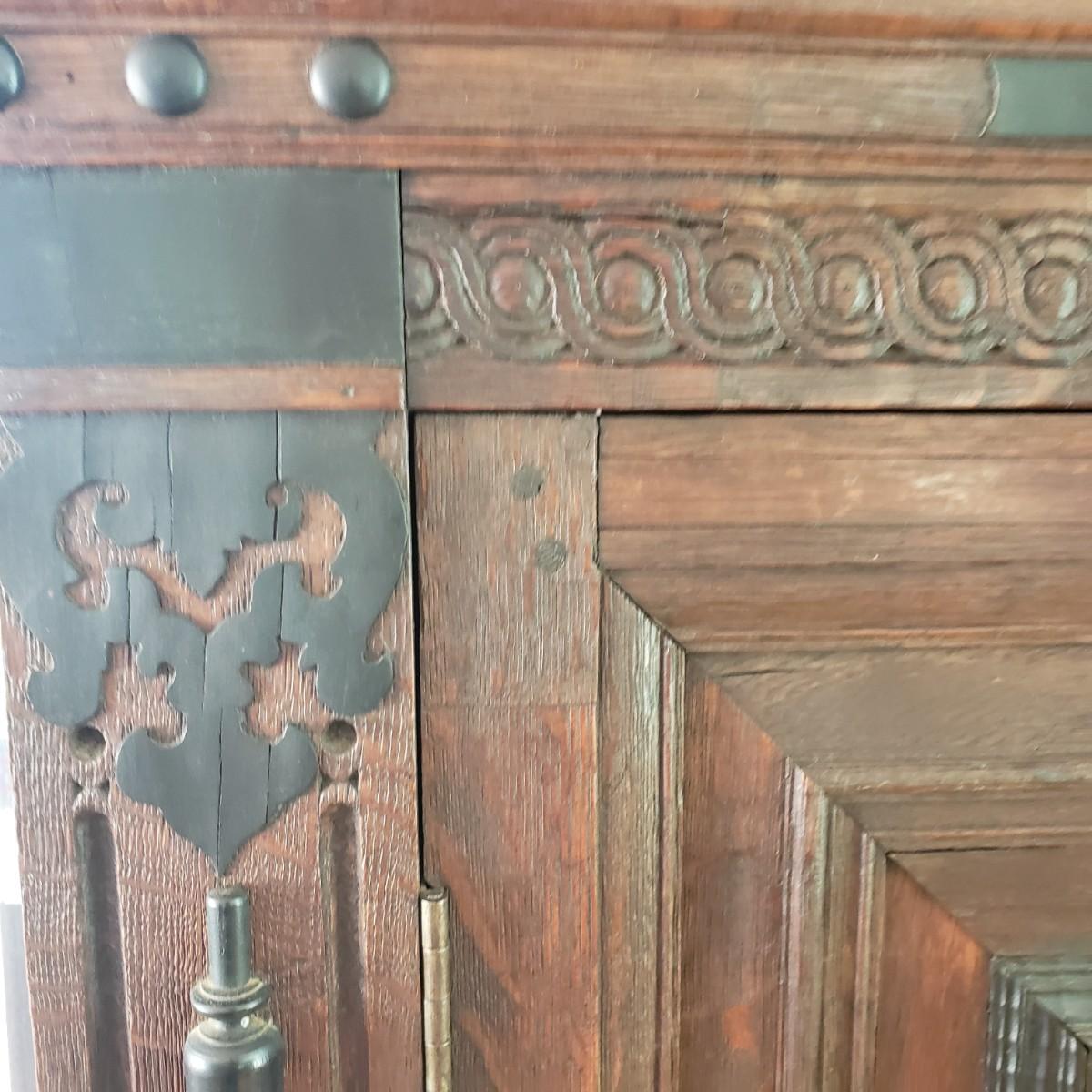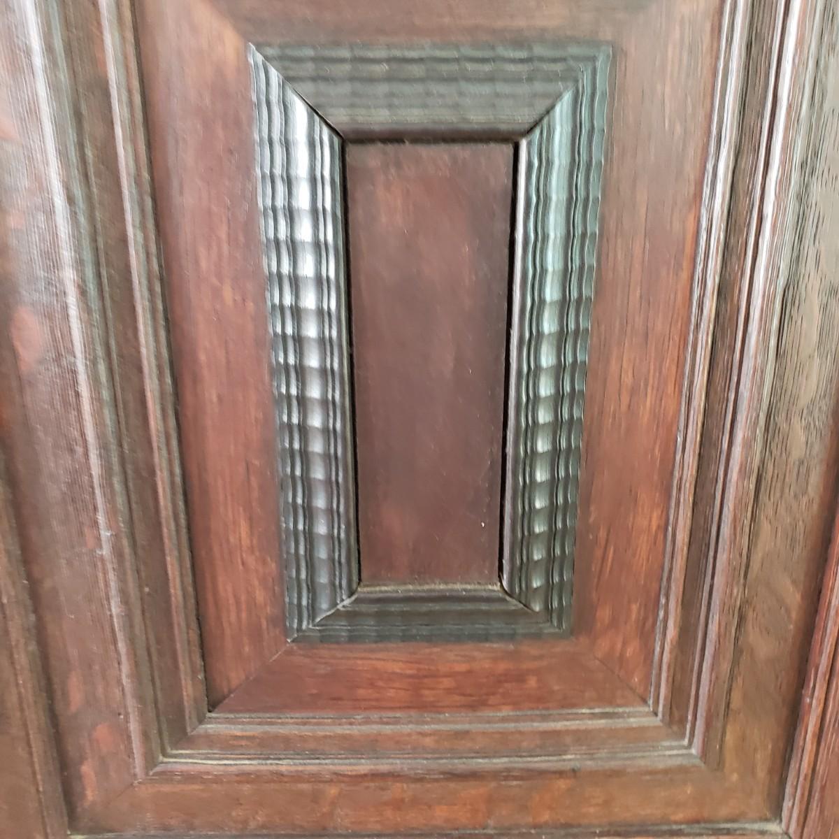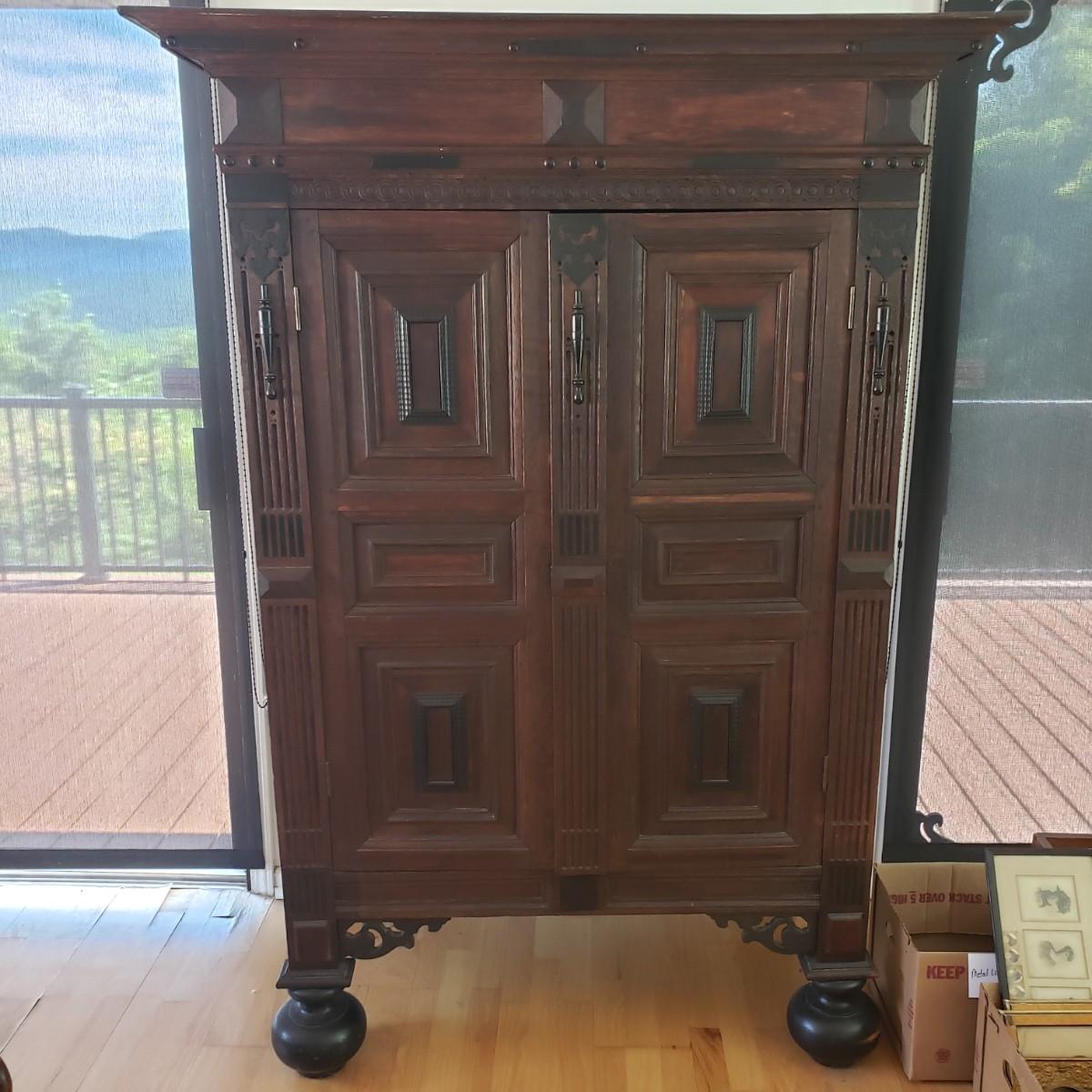 This fine crafted cabinet measures 41" x 22" x 70"H. The doors each have locking mechanism on them. note photographs of joint in drawer. Square ornament above doors is wood. There is no key. There is a drawer inside that measures 22" x 3". The latch with the hidden keyhole once closed is hard to open, take note when closing it.