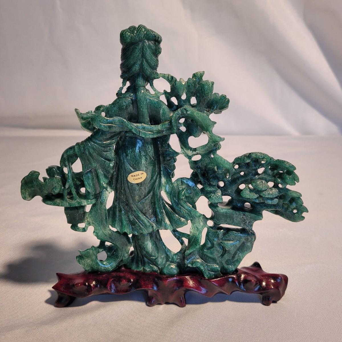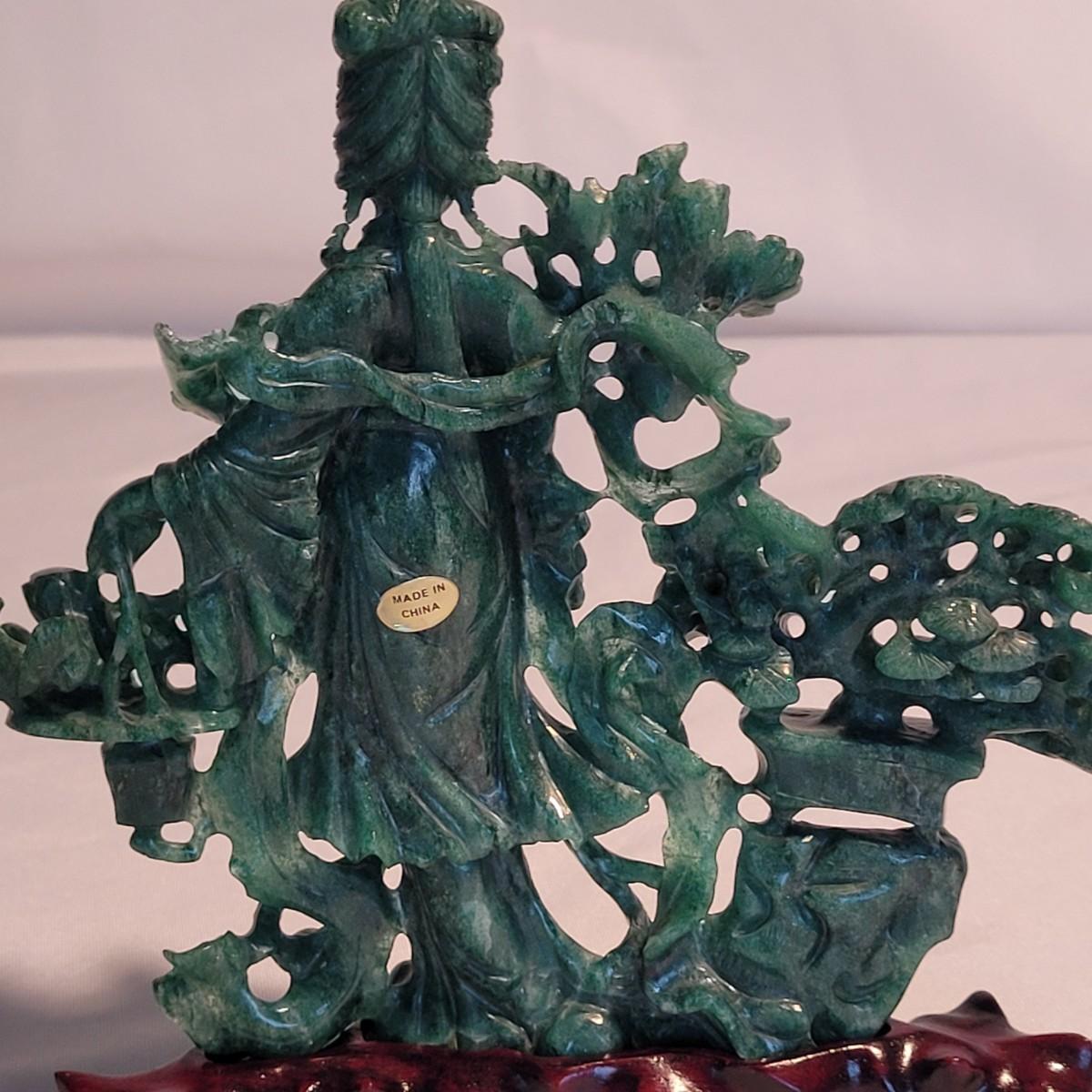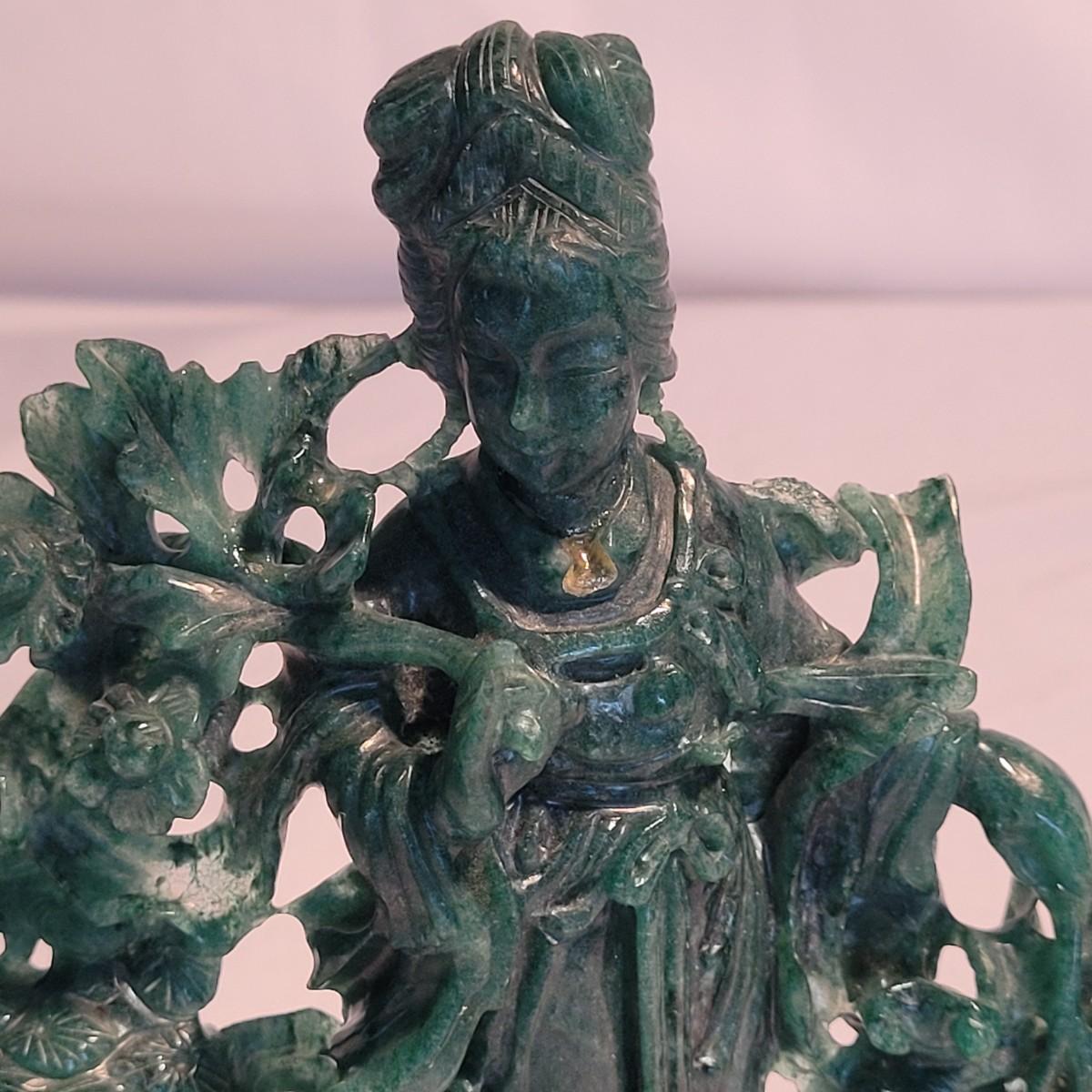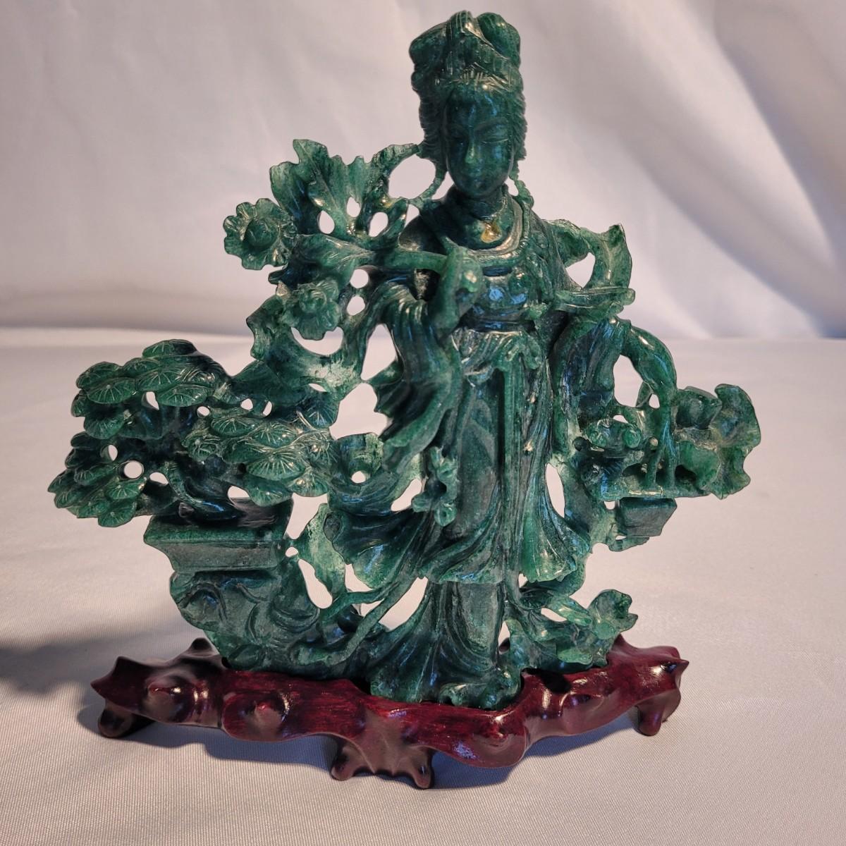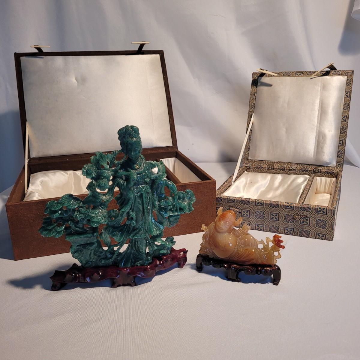 This lot includes two unique carved stone statues depicting prominent Buddhist figures. The first and largest statue appears to depict Guan Yin or Kwanyin, the Buddhist goddess of mercy. It appears to be made of a jade-like stone and sits atop a wooden stand. It measures 8" x 2" x 8.5"H. It has a couple small chips (see photos). The second statue is of a Buddha or similar diety and appears to be made from carnelian agate. He is rested on a wooden stand. Buddha measures 5" x 2" x 4"H. Both statues include original decorative padded storage boxes.