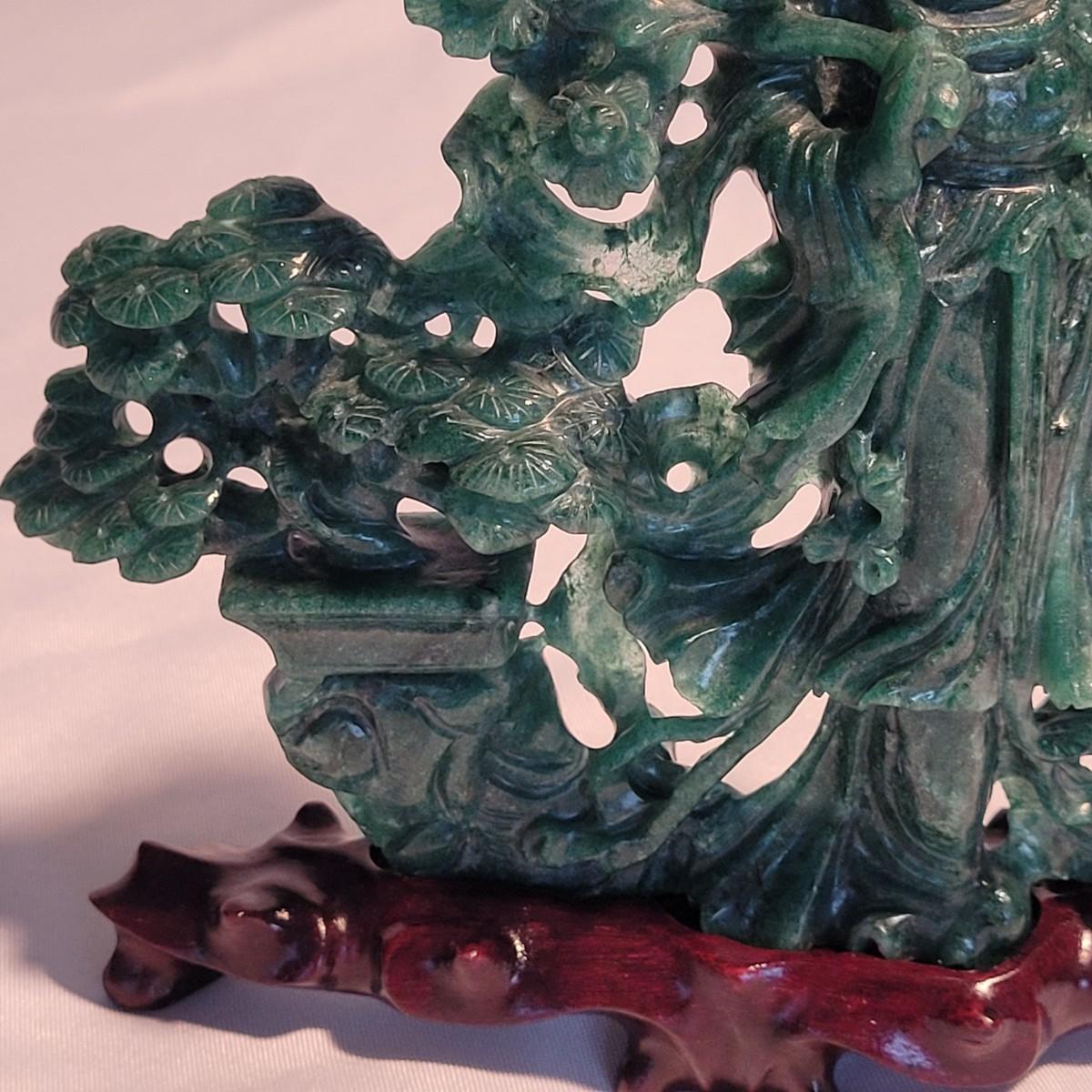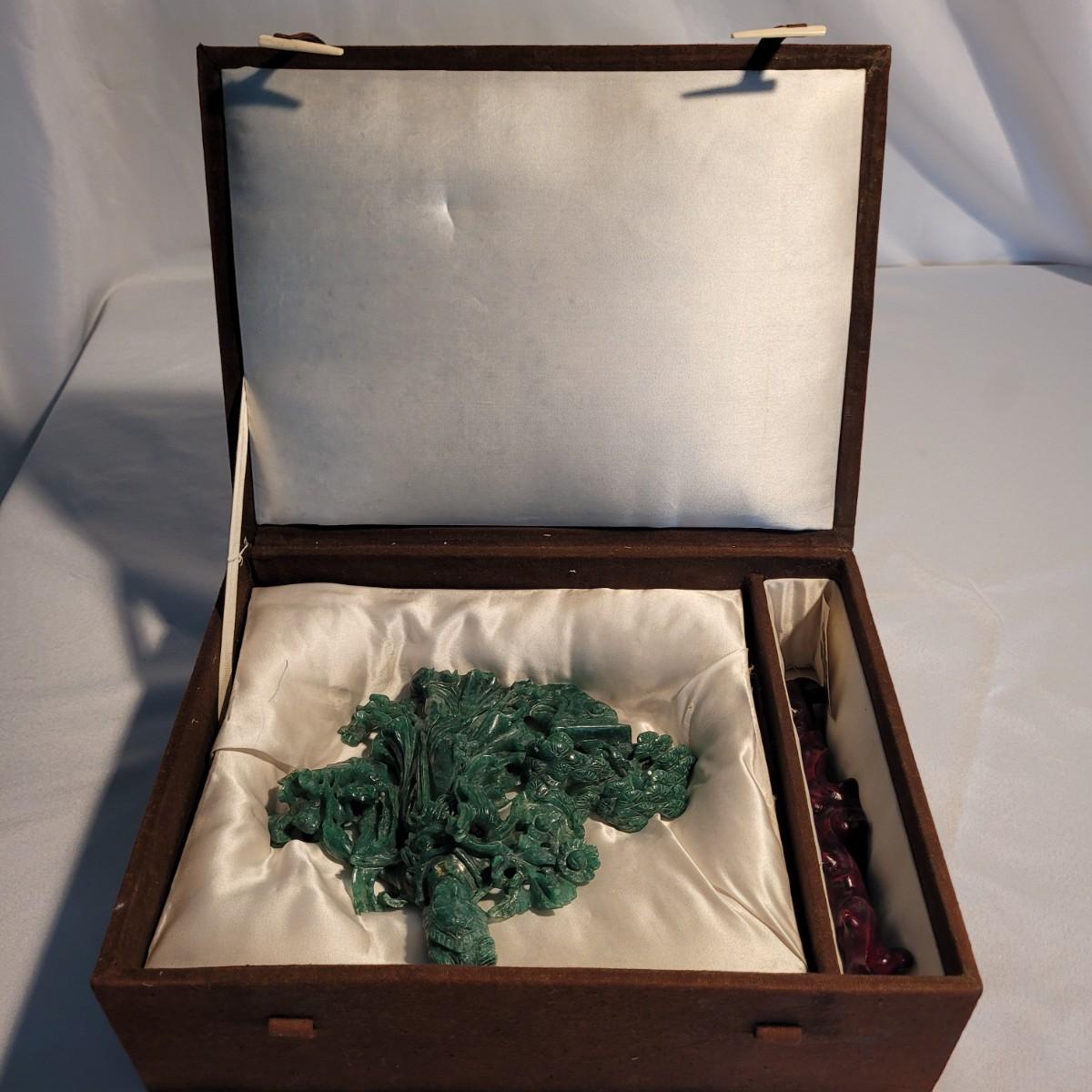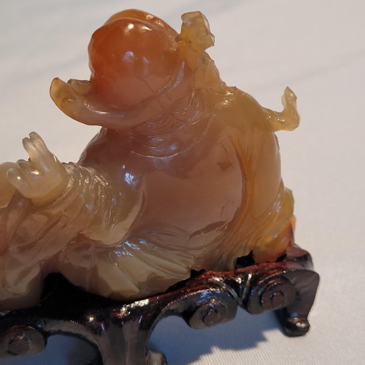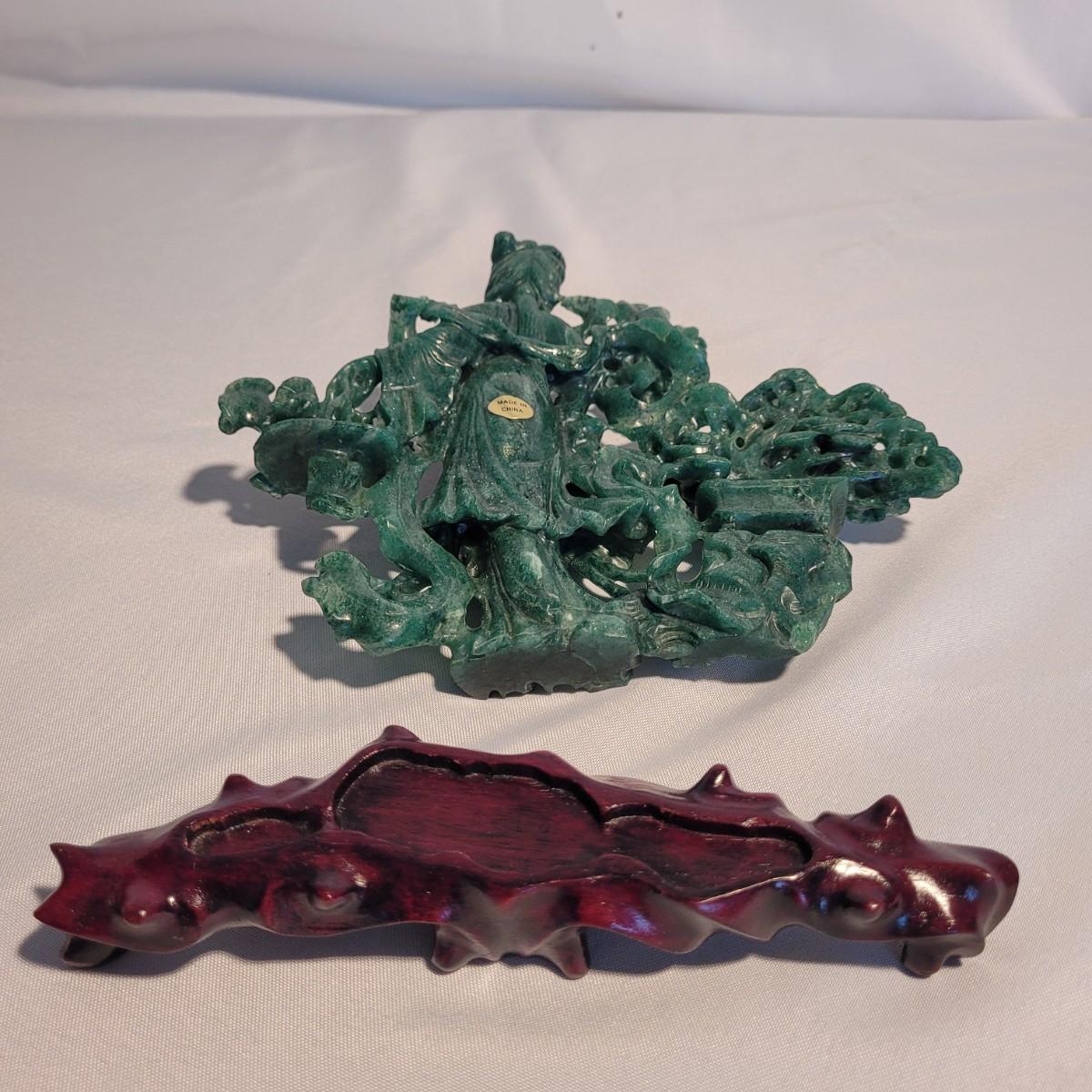 This lot includes two unique carved stone statues depicting prominent Buddhist figures. The first and largest statue appears to depict Guan Yin or Kwanyin, the Buddhist goddess of mercy. It appears to be made of a jade-like stone and sits atop a wooden stand. It measures 8" x 2" x 8.5"H. It has a couple small chips (see photos). The second statue is of a Buddha or similar diety and appears to be made from carnelian agate. He is rested on a wooden stand. Buddha measures 5" x 2" x 4"H. Both statues include original decorative padded storage boxes.