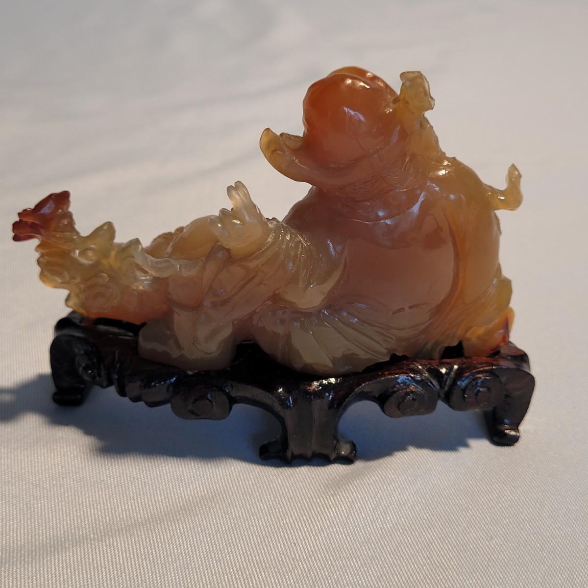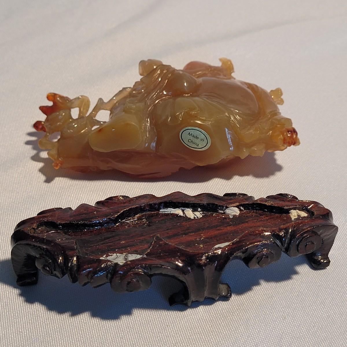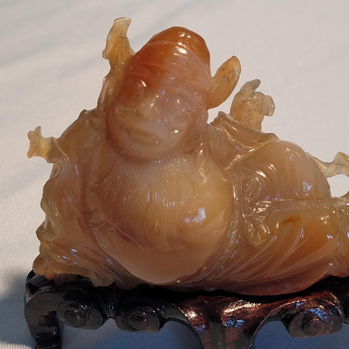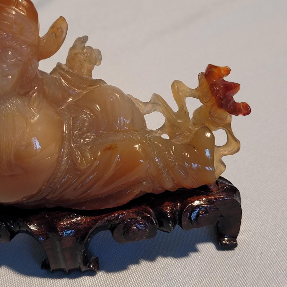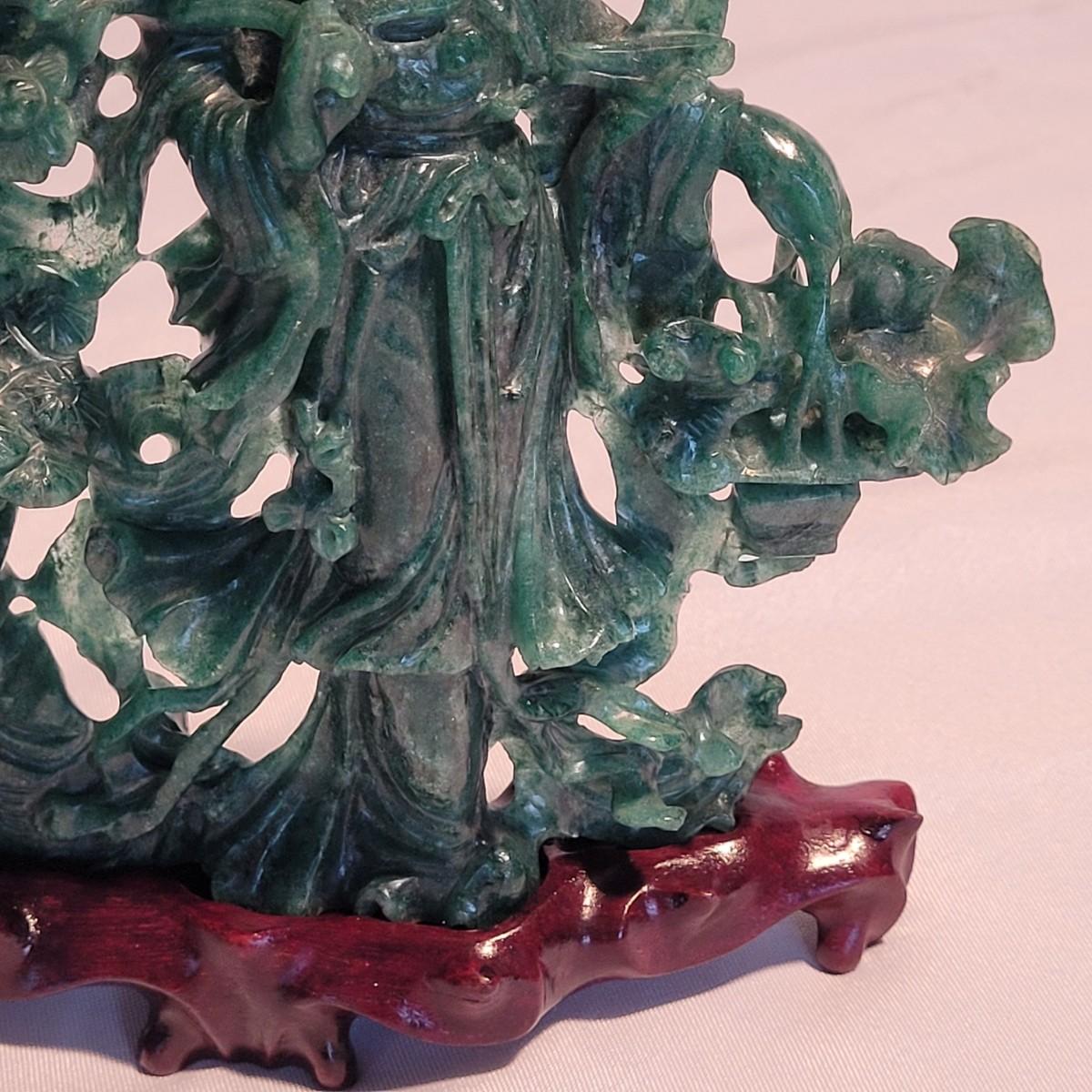 This lot includes two unique carved stone statues depicting prominent Buddhist figures. The first and largest statue appears to depict Guan Yin or Kwanyin, the Buddhist goddess of mercy. It appears to be made of a jade-like stone and sits atop a wooden stand. It measures 8" x 2" x 8.5"H. It has a couple small chips (see photos). The second statue is of a Buddha or similar diety and appears to be made from carnelian agate. He is rested on a wooden stand. Buddha measures 5" x 2" x 4"H. Both statues include original decorative padded storage boxes.
