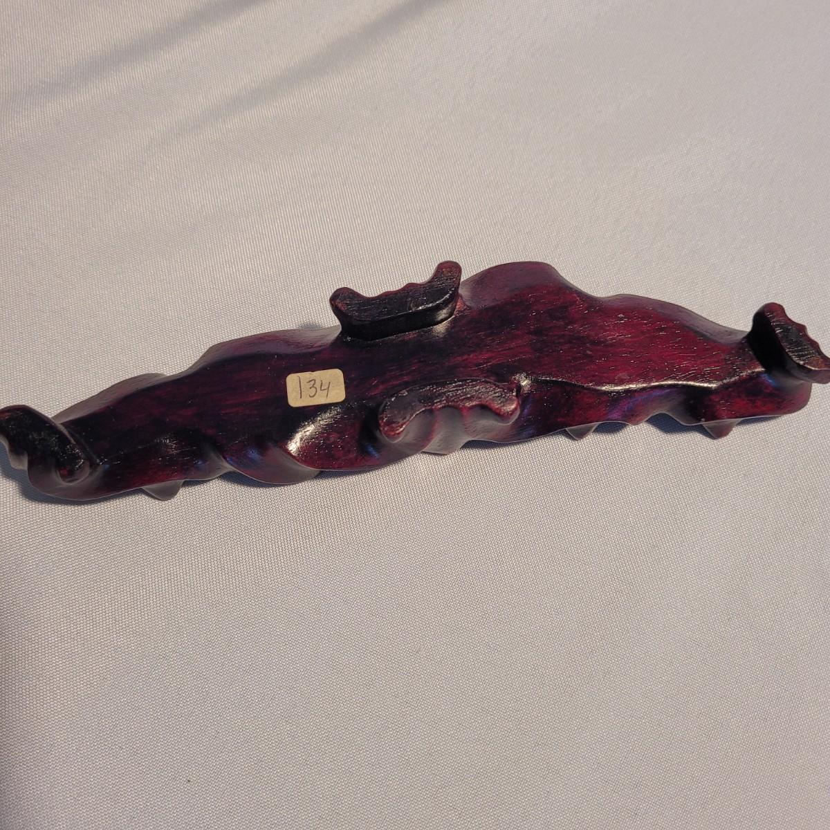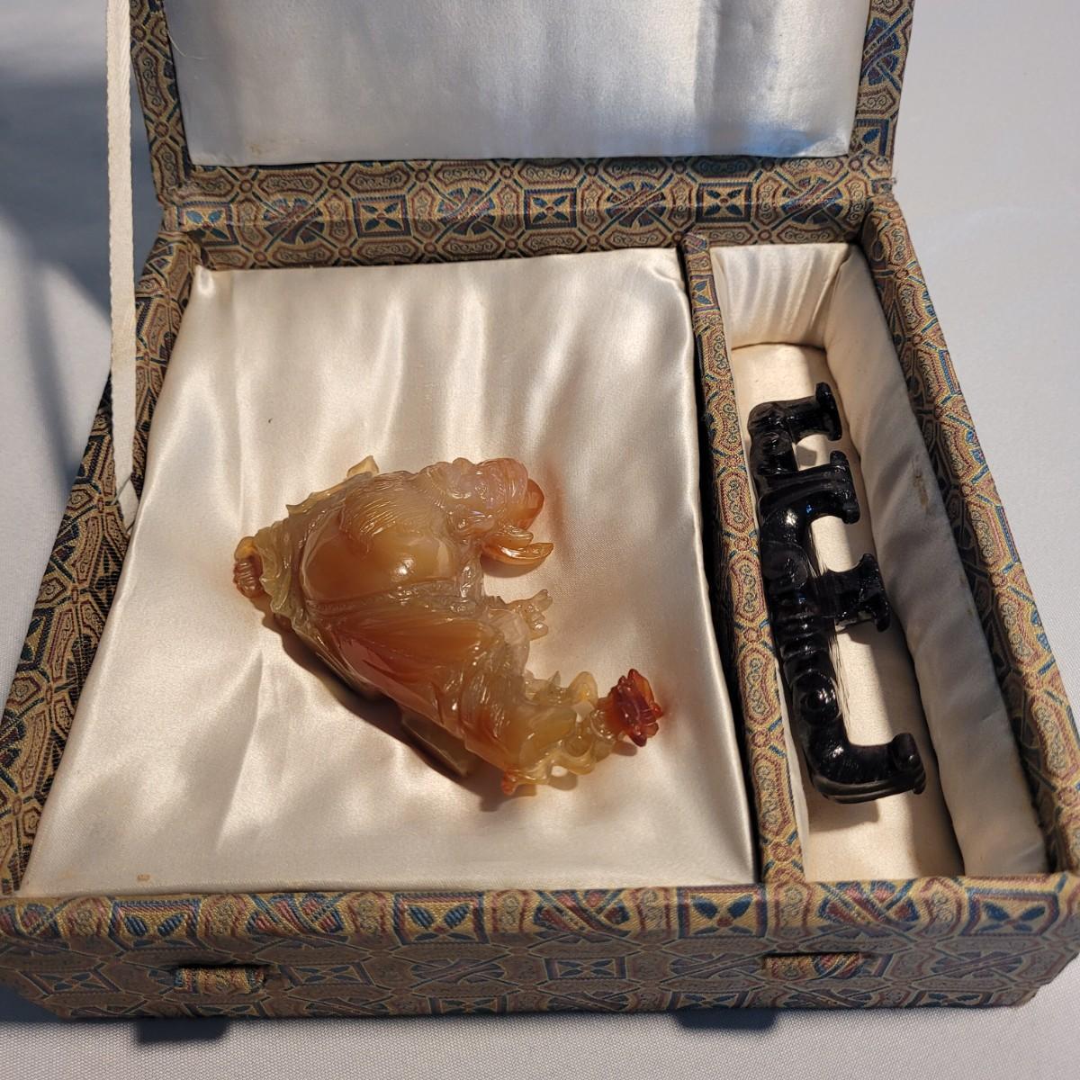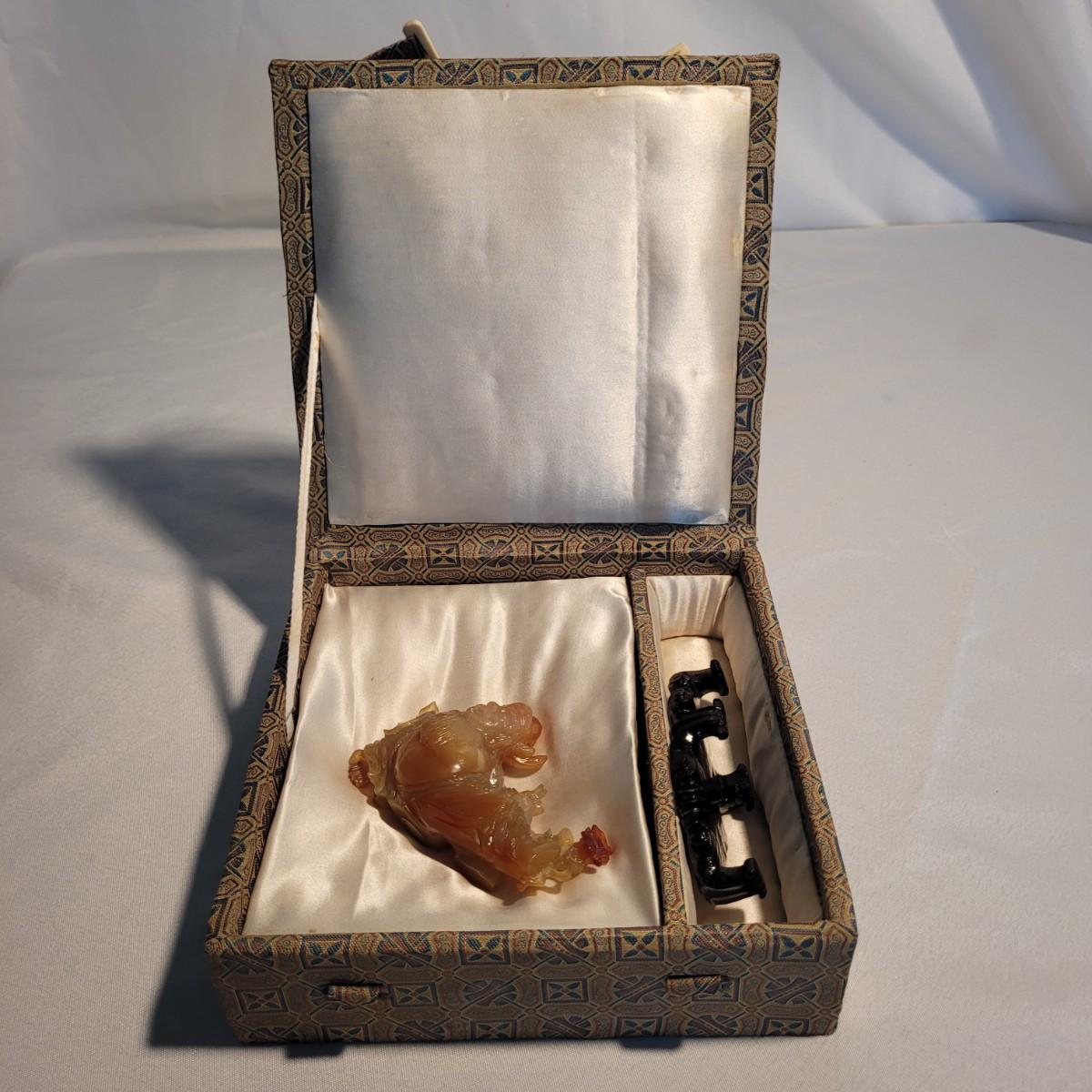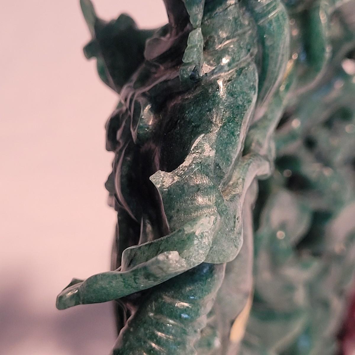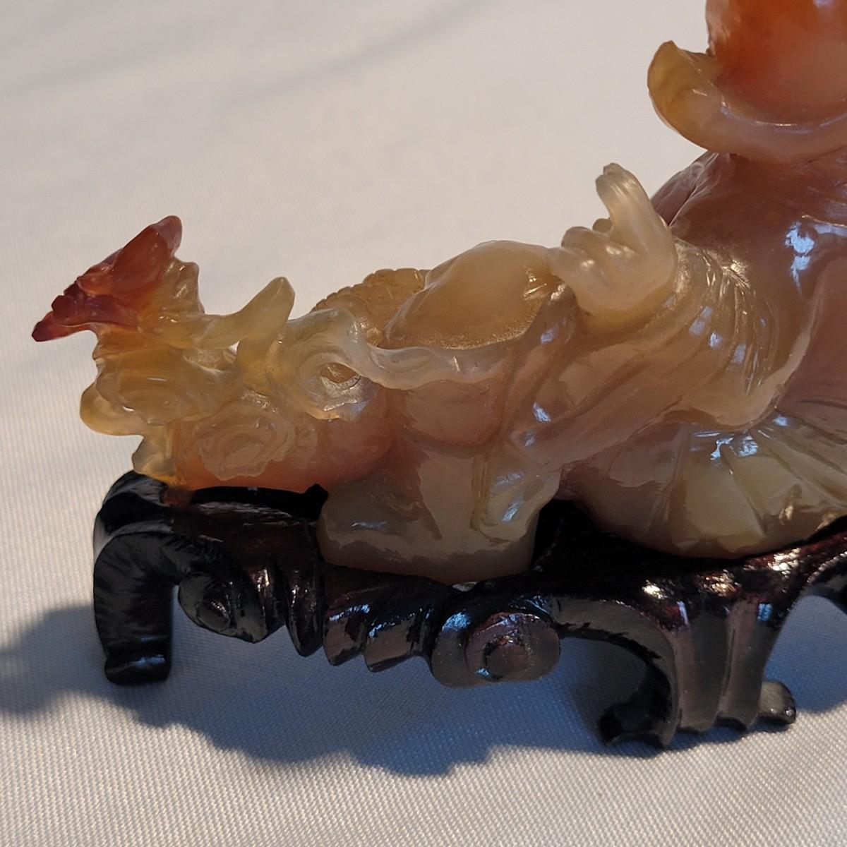 This lot includes two unique carved stone statues depicting prominent Buddhist figures. The first and largest statue appears to depict Guan Yin or Kwanyin, the Buddhist goddess of mercy. It appears to be made of a jade-like stone and sits atop a wooden stand. It measures 8" x 2" x 8.5"H. It has a couple small chips (see photos). The second statue is of a Buddha or similar diety and appears to be made from carnelian agate. He is rested on a wooden stand. Buddha measures 5" x 2" x 4"H. Both statues include original decorative padded storage boxes.