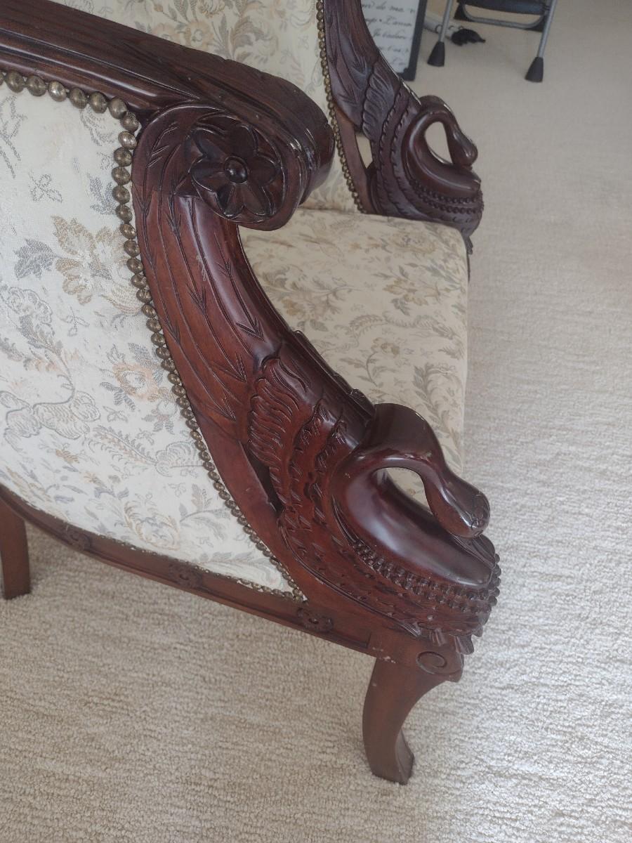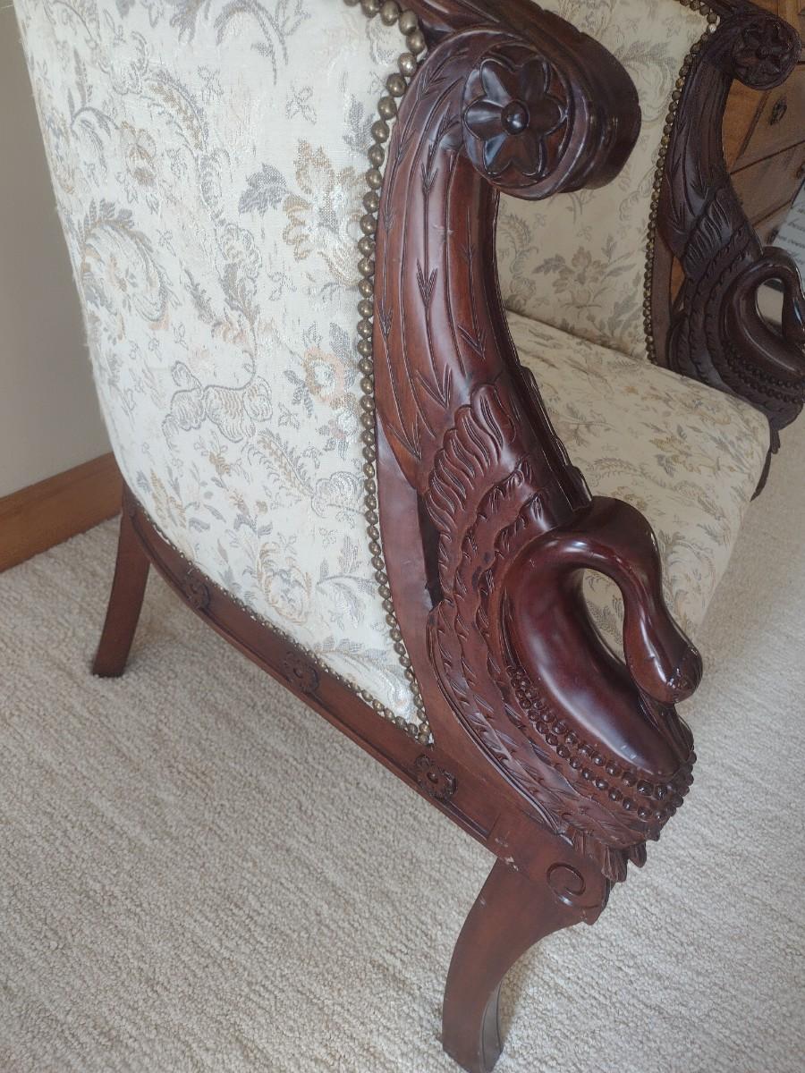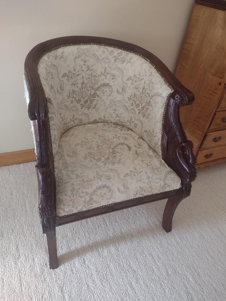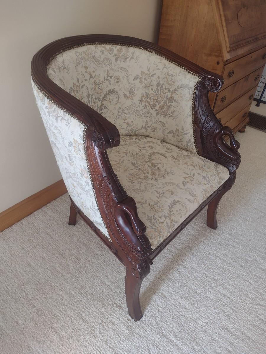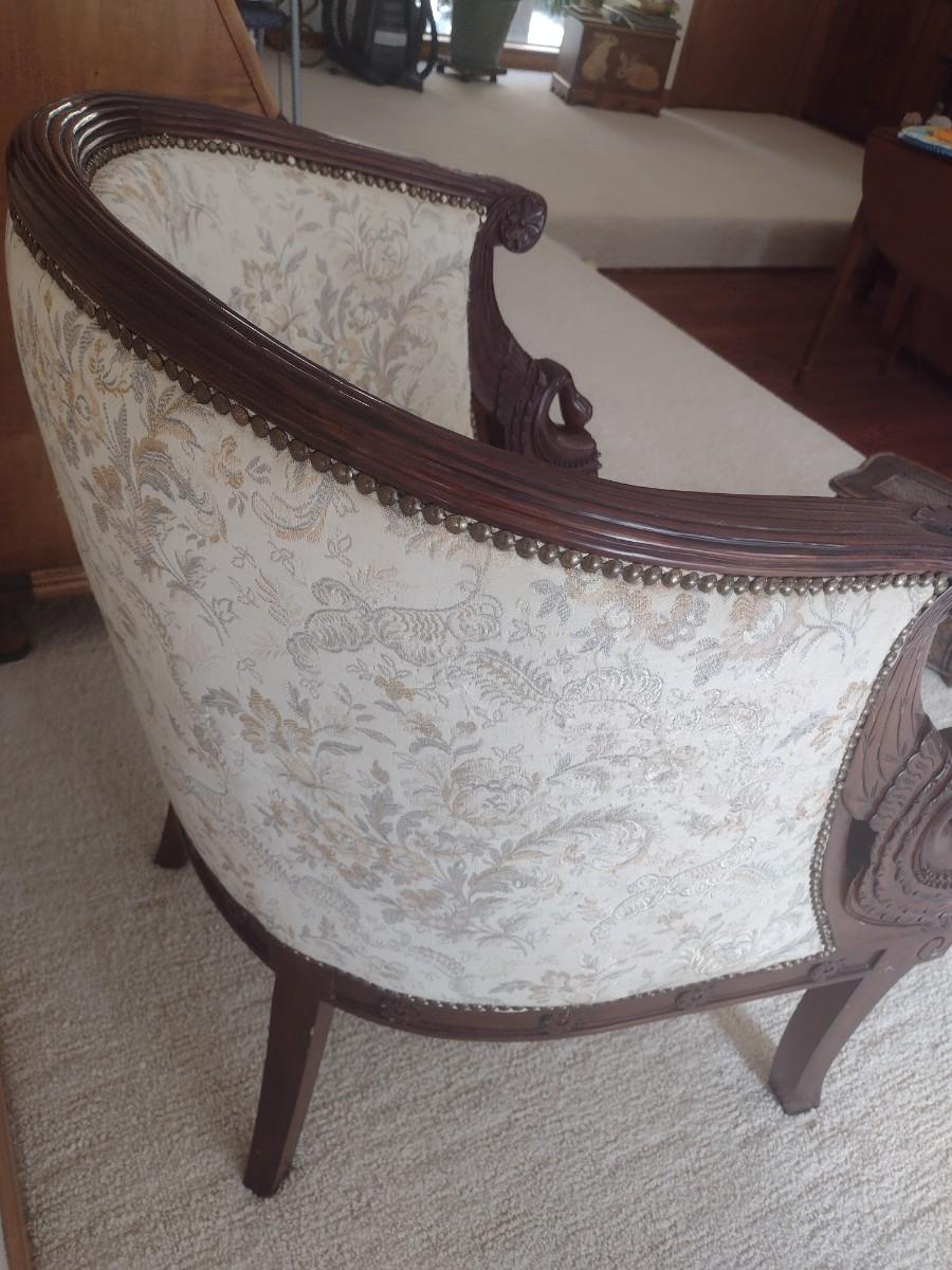 Ornate Carved Swan Neck Barrell Chair. Upholstery has some worn and tattered places as shown. Some picking on fabric as pictured.