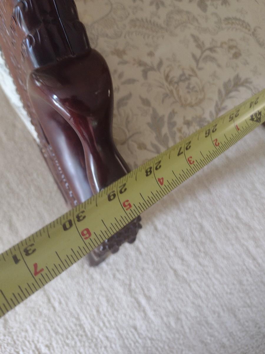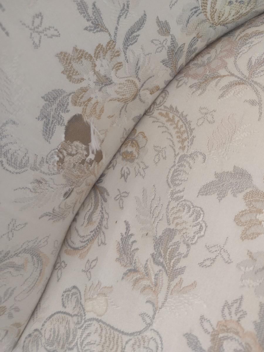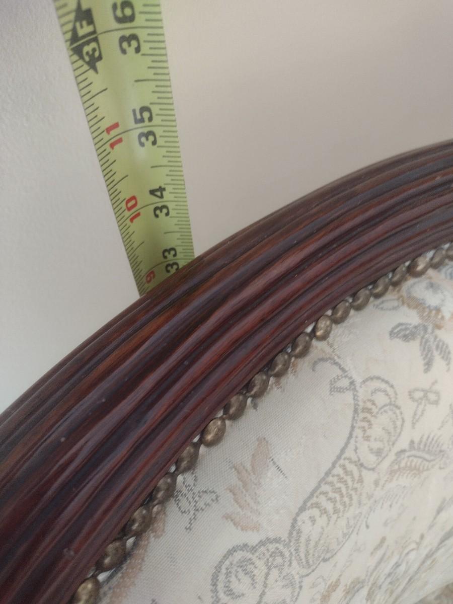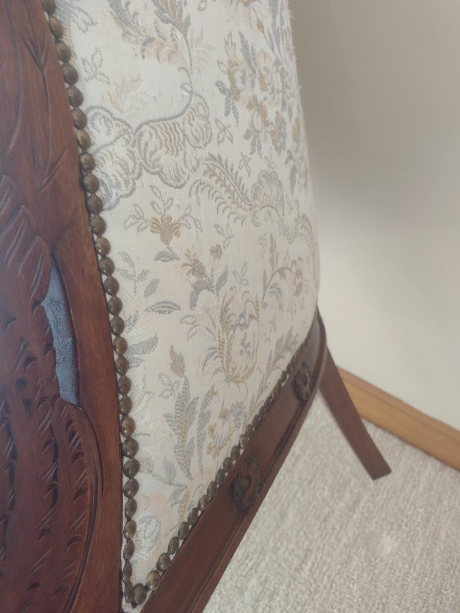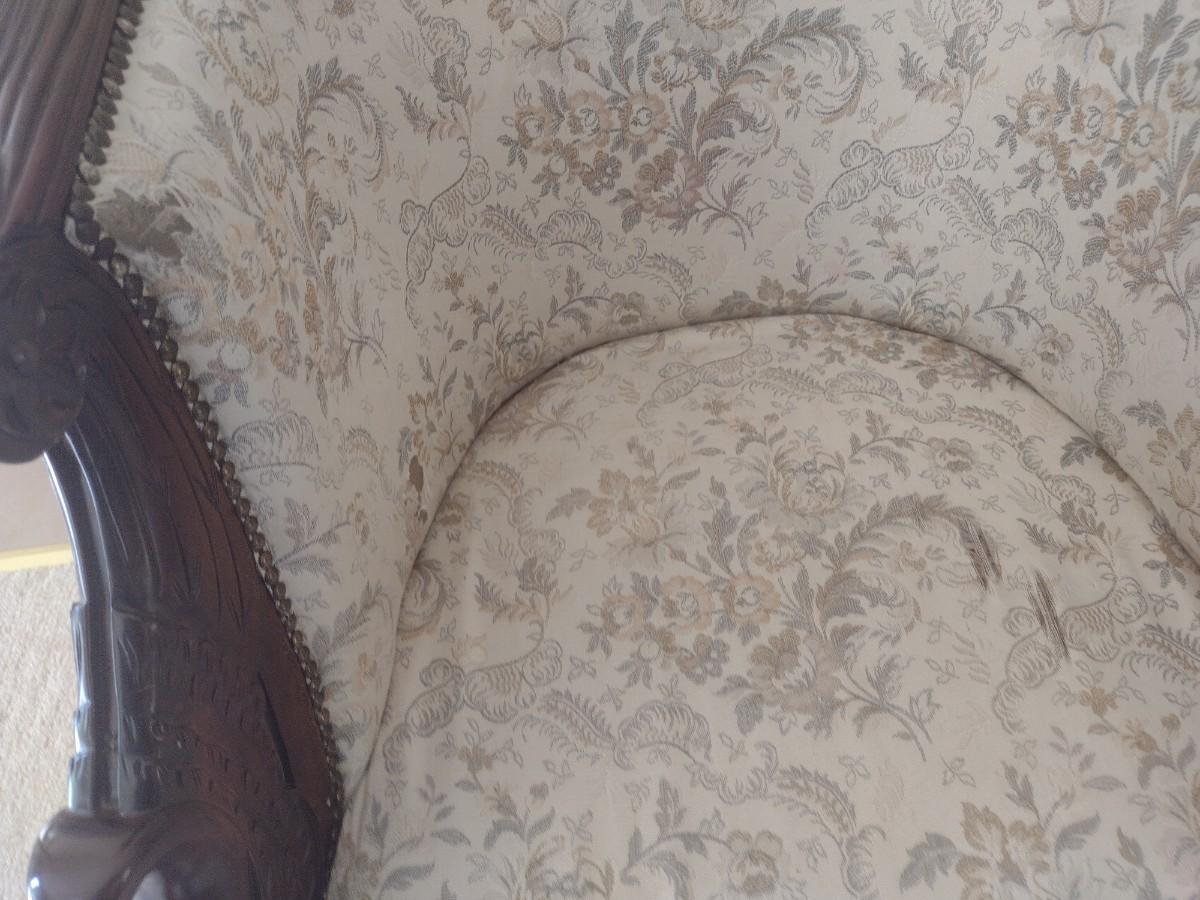 Ornate Carved Swan Neck Barrell Chair. Upholstery has some worn and tattered places as shown. Some picking on fabric as pictured.