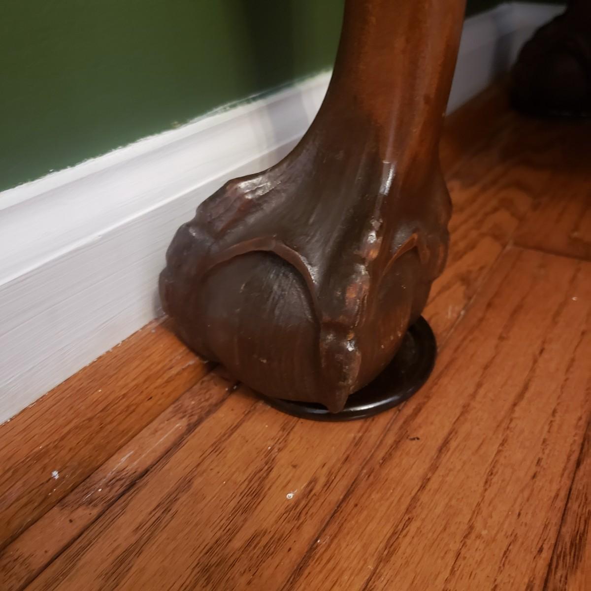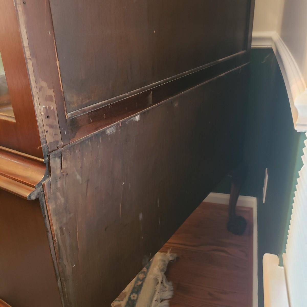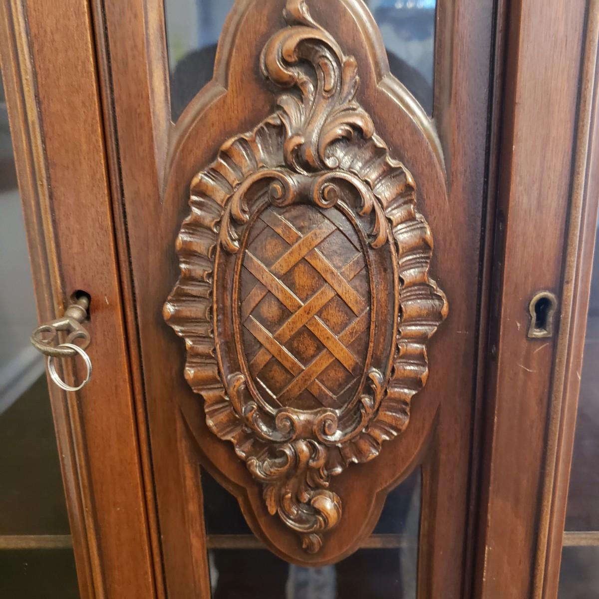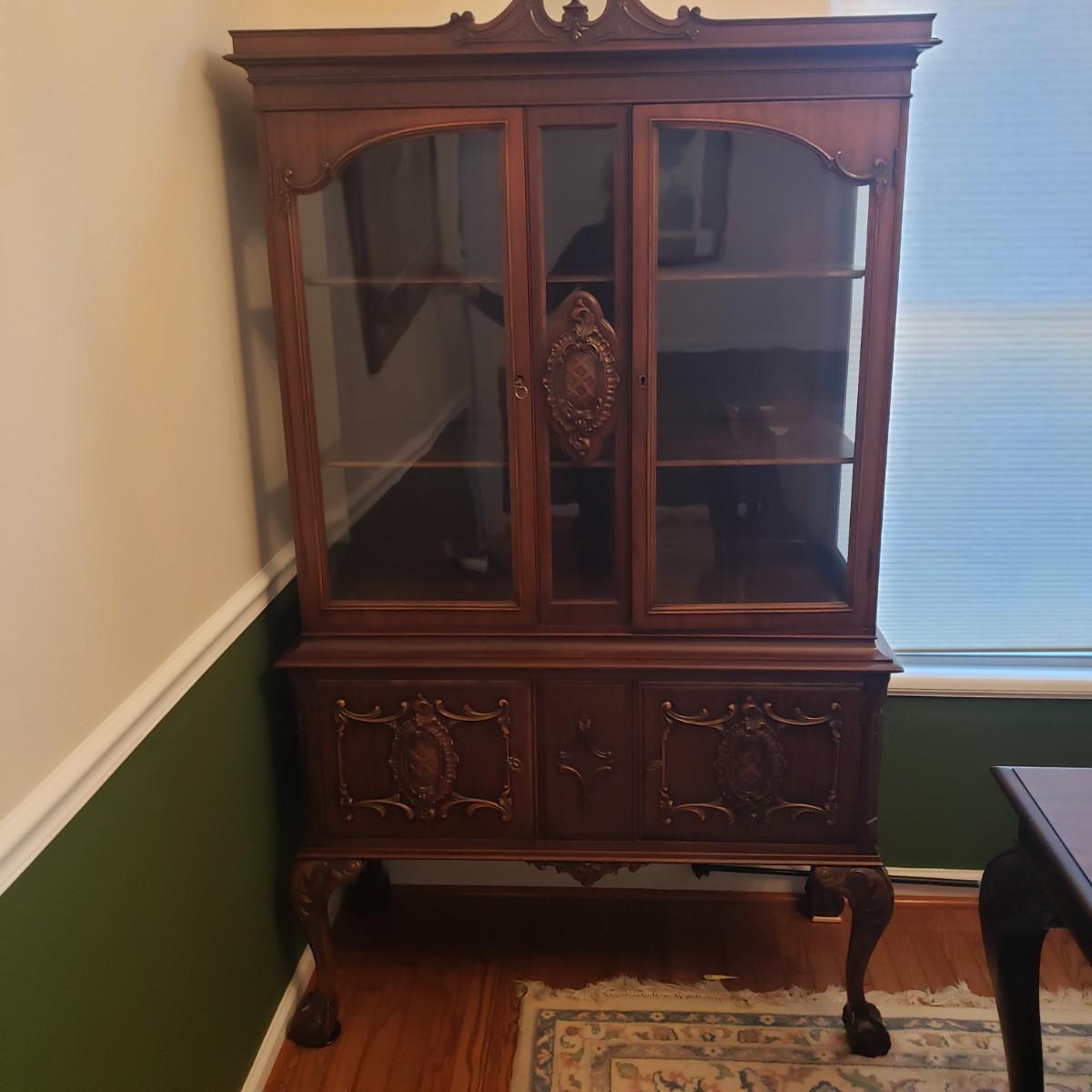 This ornate clawfoot china cabinet the most beautiful craftsmanship. The cabinet measures 41.5" x 18" x 72"H. For its age, it appears to be in great condition. The seller states that this was her great grandmother's, and she said it was over 100 years old. The cabinet has a matching table and buffet in other lots in this auction. The cabinet has two shelves with intentions to hold plates. The lower two-door cabinet has a smaller shelf inside. Comes with wheels that were taken off. Cabinet is one whole piece, the top does not come off.