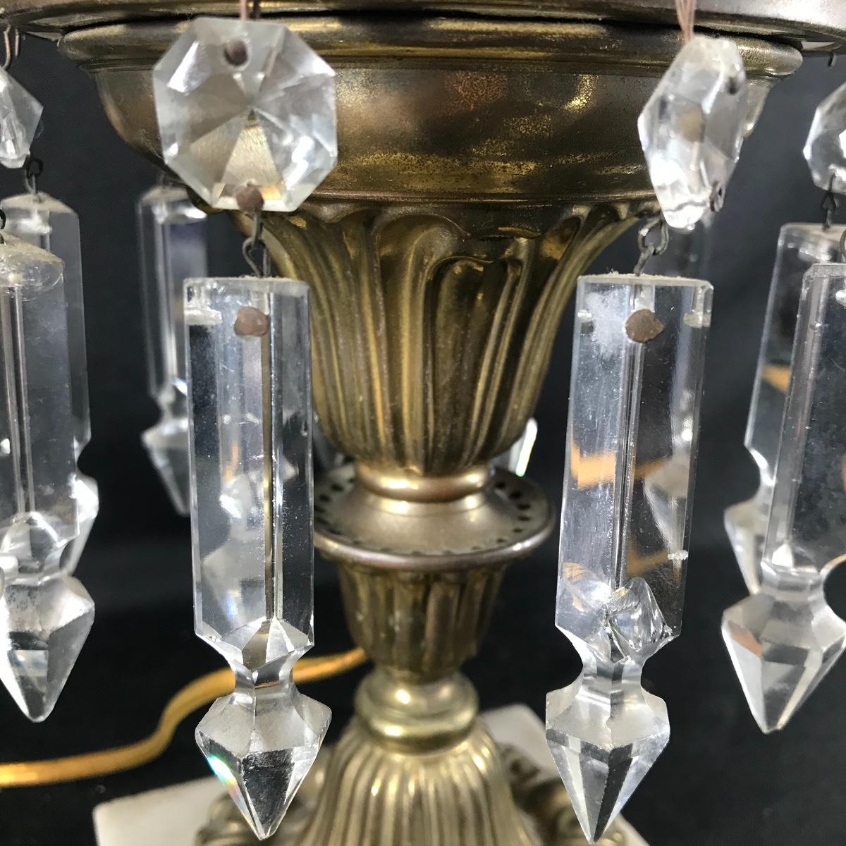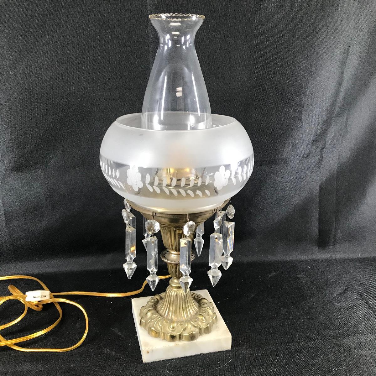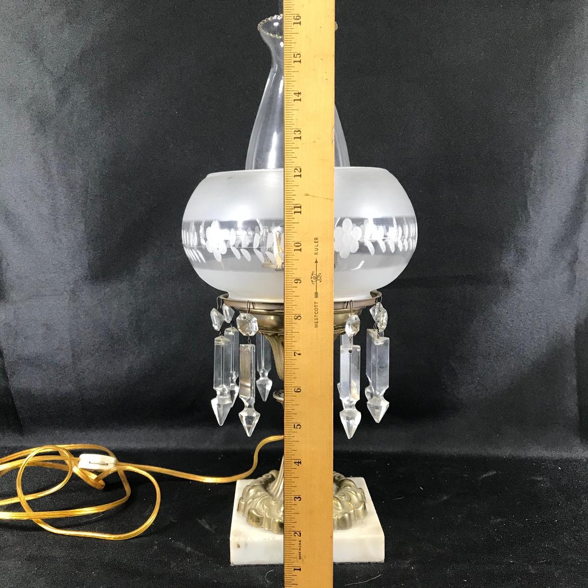 Up for auction is an ornate pedestal lamp. It has a crystal globe and bowl, metal shaft, on a marble base. Item has some patina and has not been tested; see pictures.