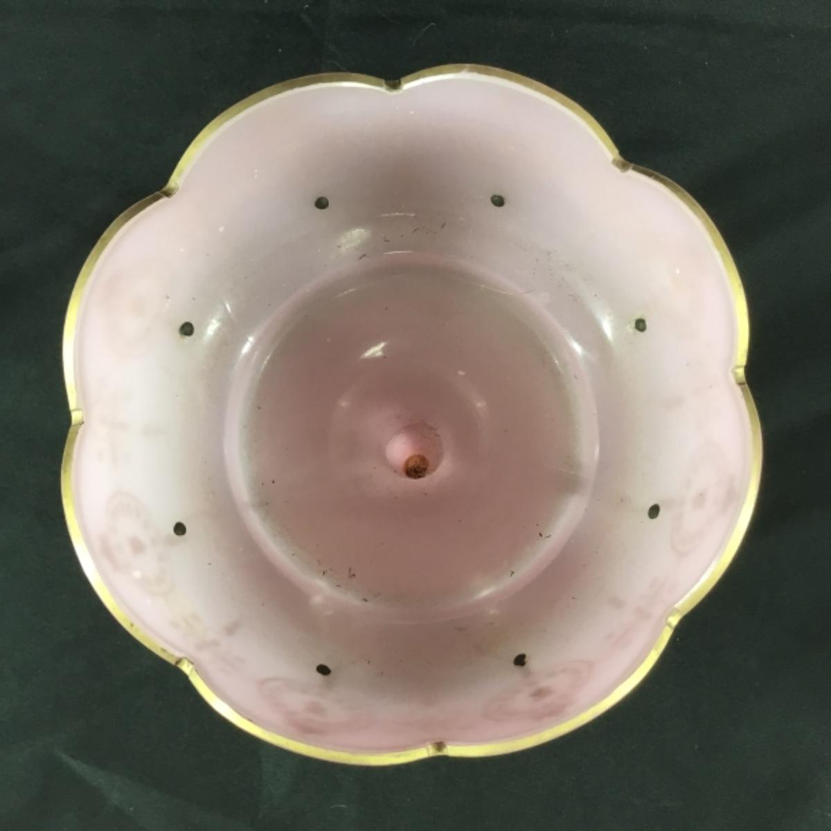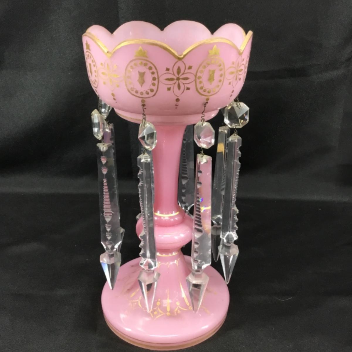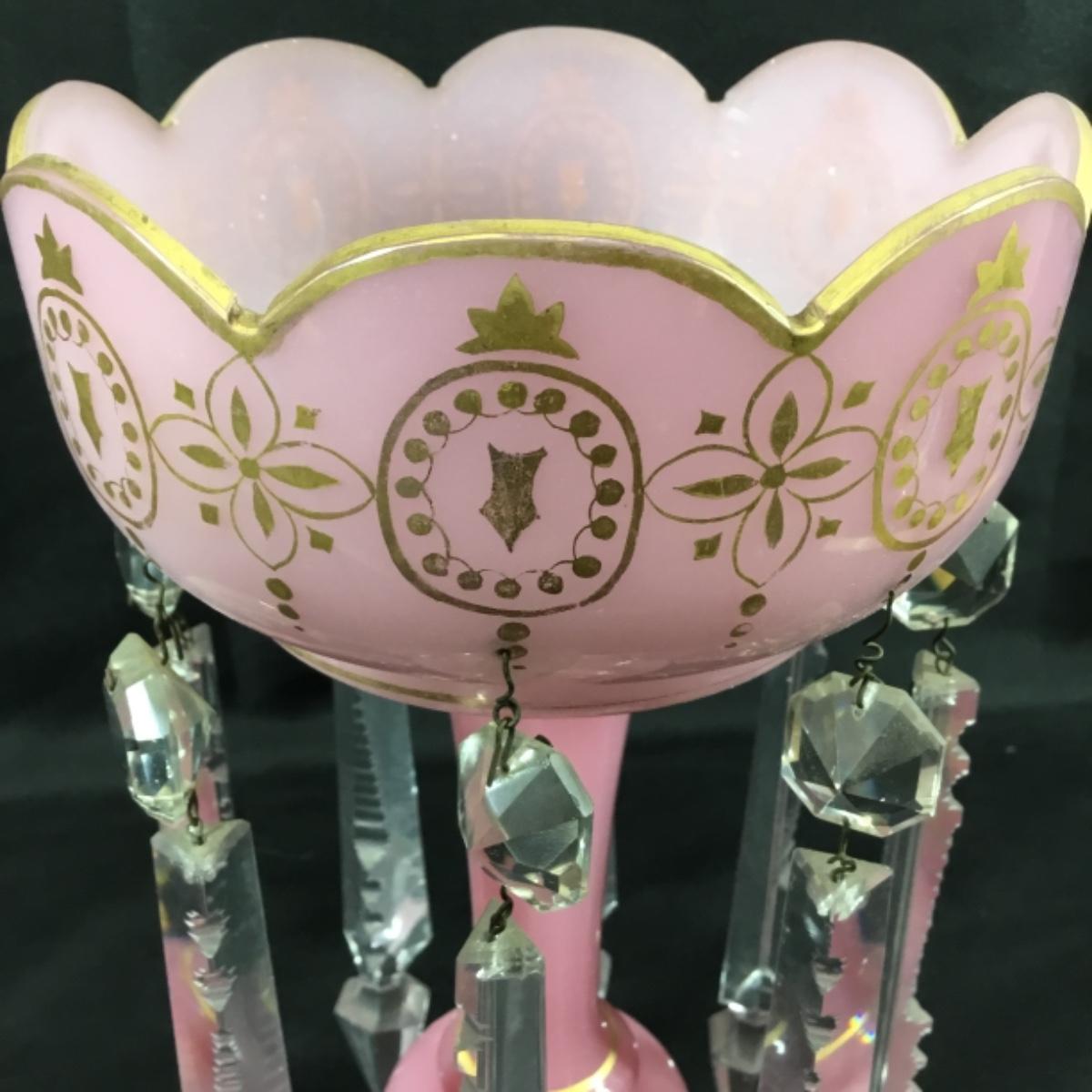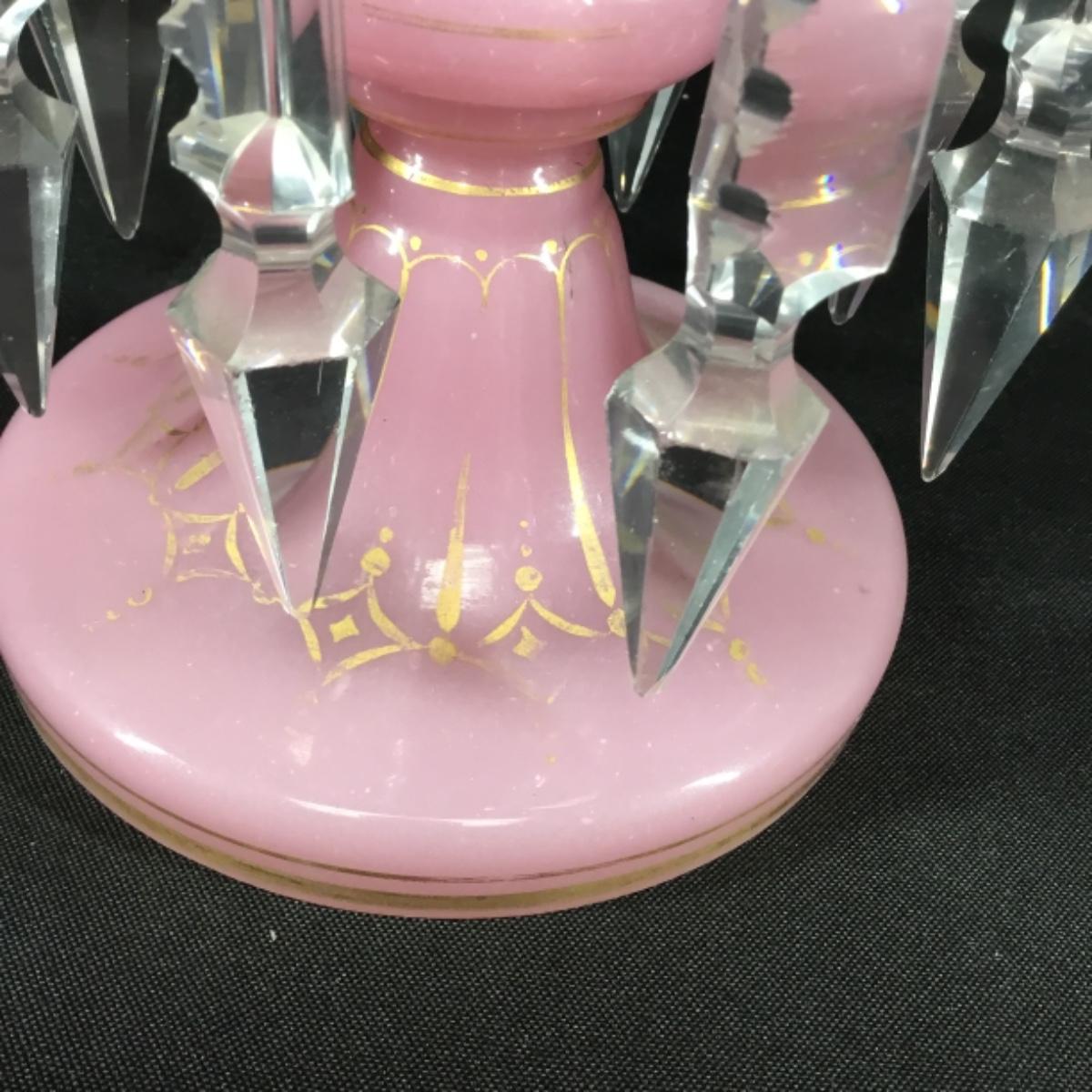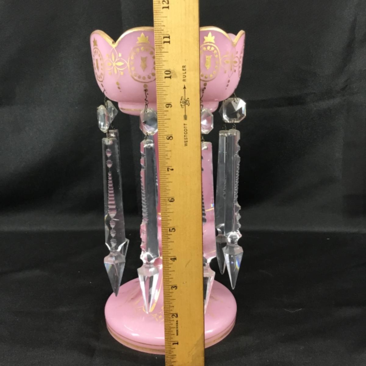 Pink bohemian style mantle lustre. About 11" tall with 7" crystals. Excellent condition overall. The gold paint exhibits wear in most places; see pictures.