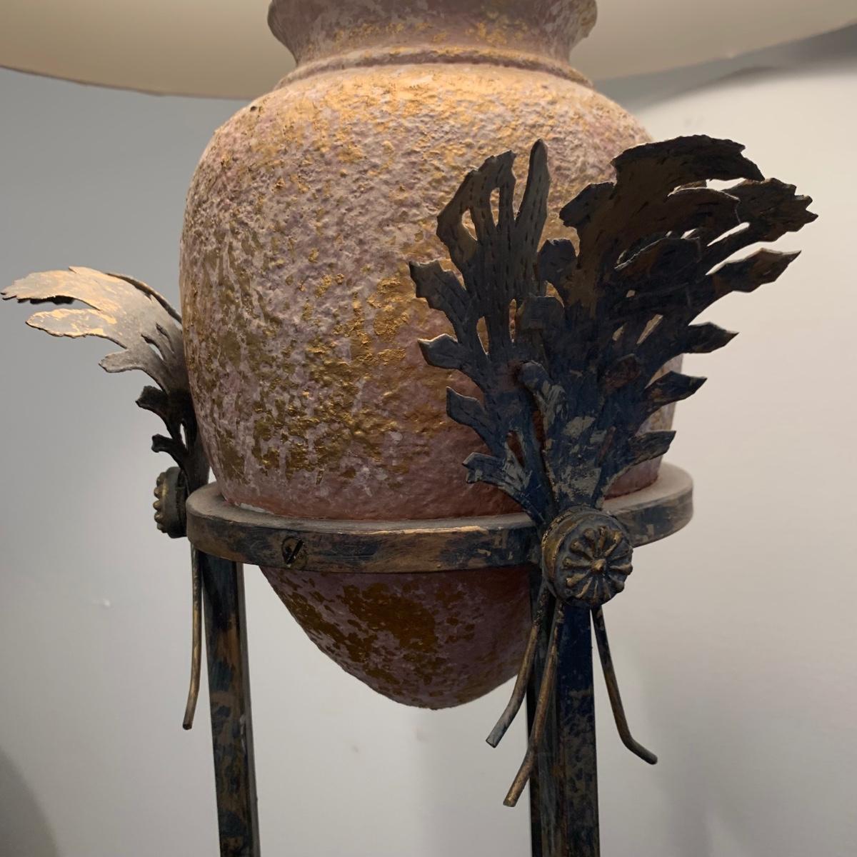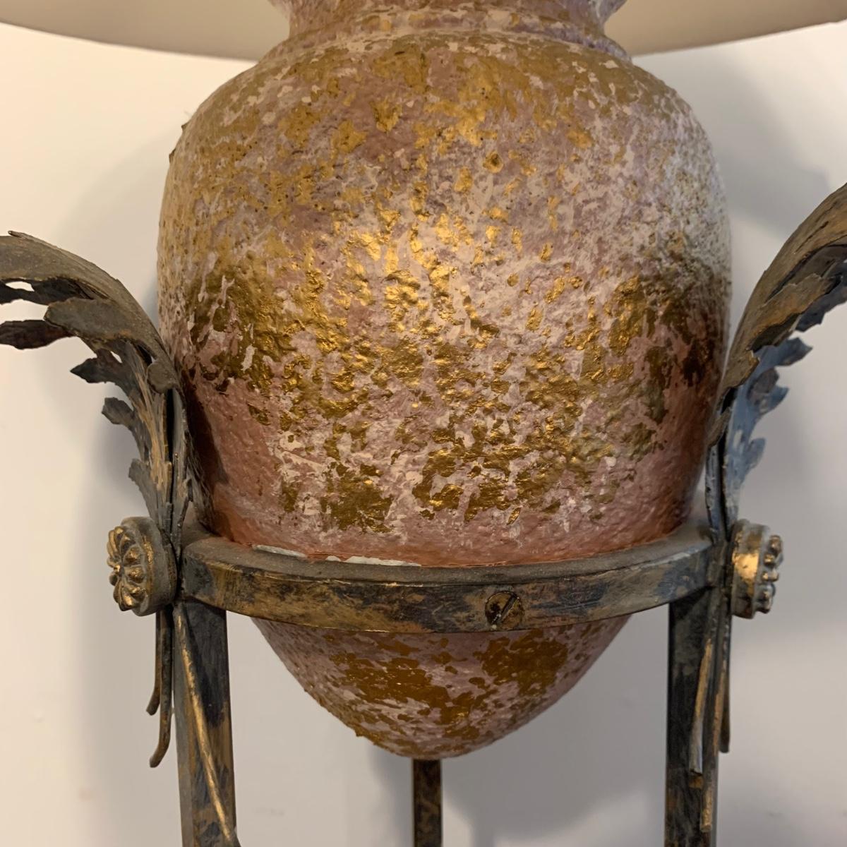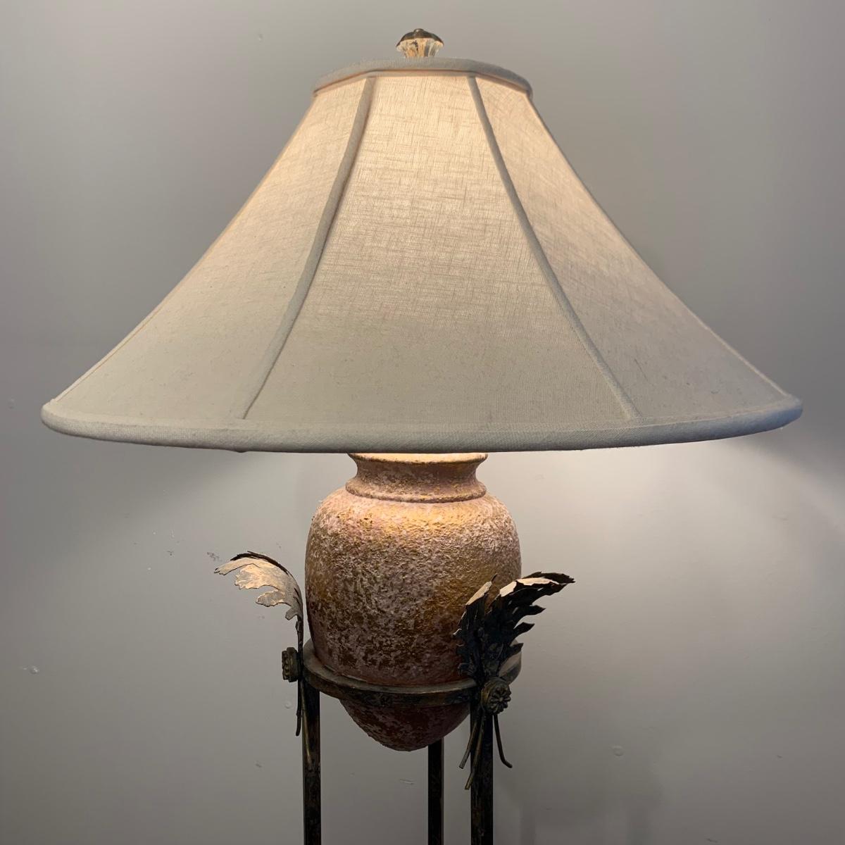 Unique ornate floor lamp with a three-footed metal stand and urn-like ceramic body. Gold leaf covers the dark bronze colored stand and the peachy-mauve colored body. The three-way lamp powered on when plugged in. To the top of the finial it is about 60” tall. The widest part of the ivory lampshade that appears to be linen is about 22”.
