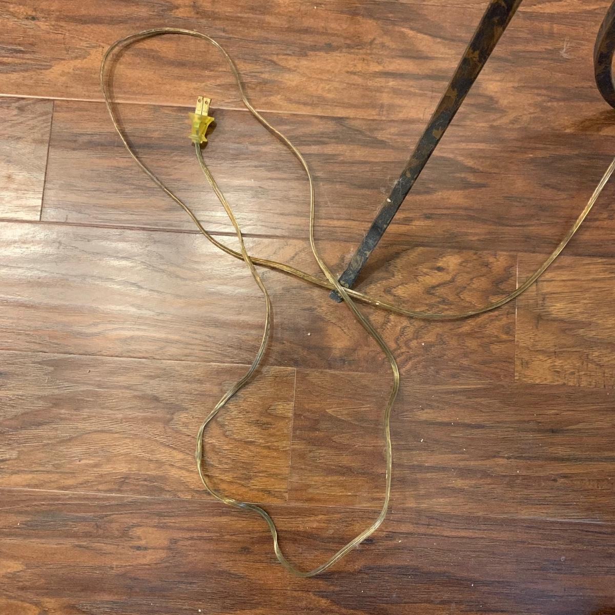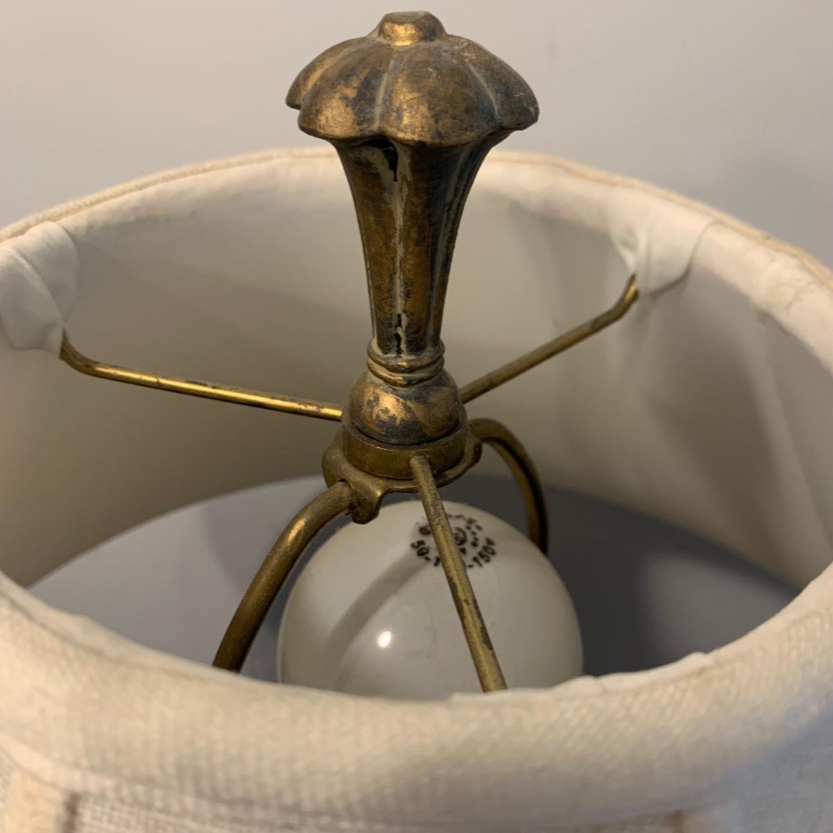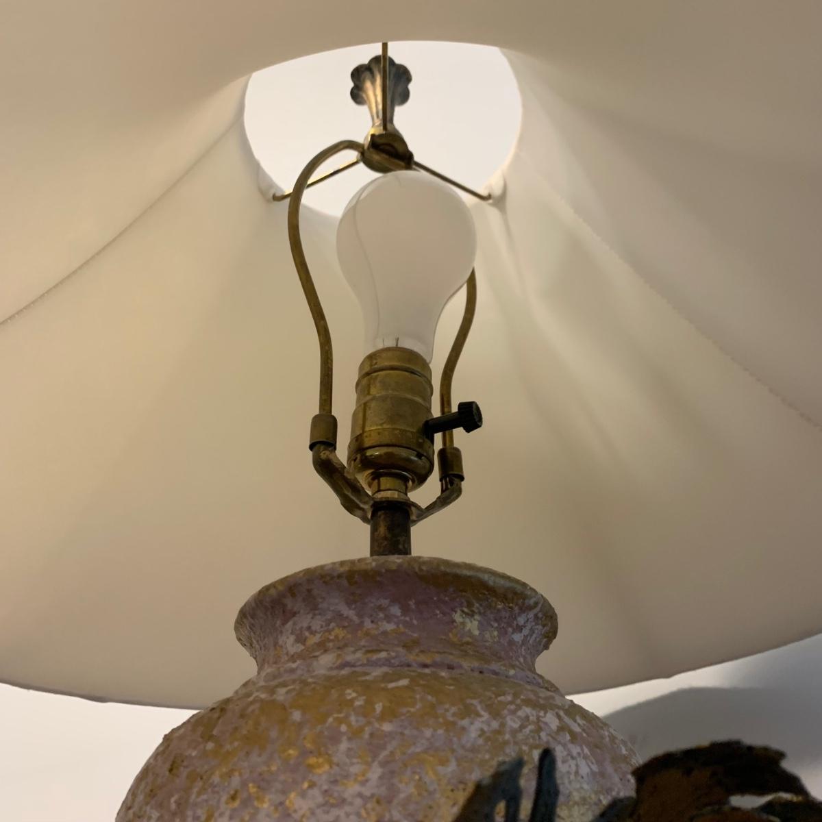 Unique ornate floor lamp with a three-footed metal stand and urn-like ceramic body. Gold leaf covers the dark bronze colored stand and the peachy-mauve colored body. The three-way lamp powered on when plugged in. To the top of the finial it is about 60” tall. The widest part of the ivory lampshade that appears to be linen is about 22”.