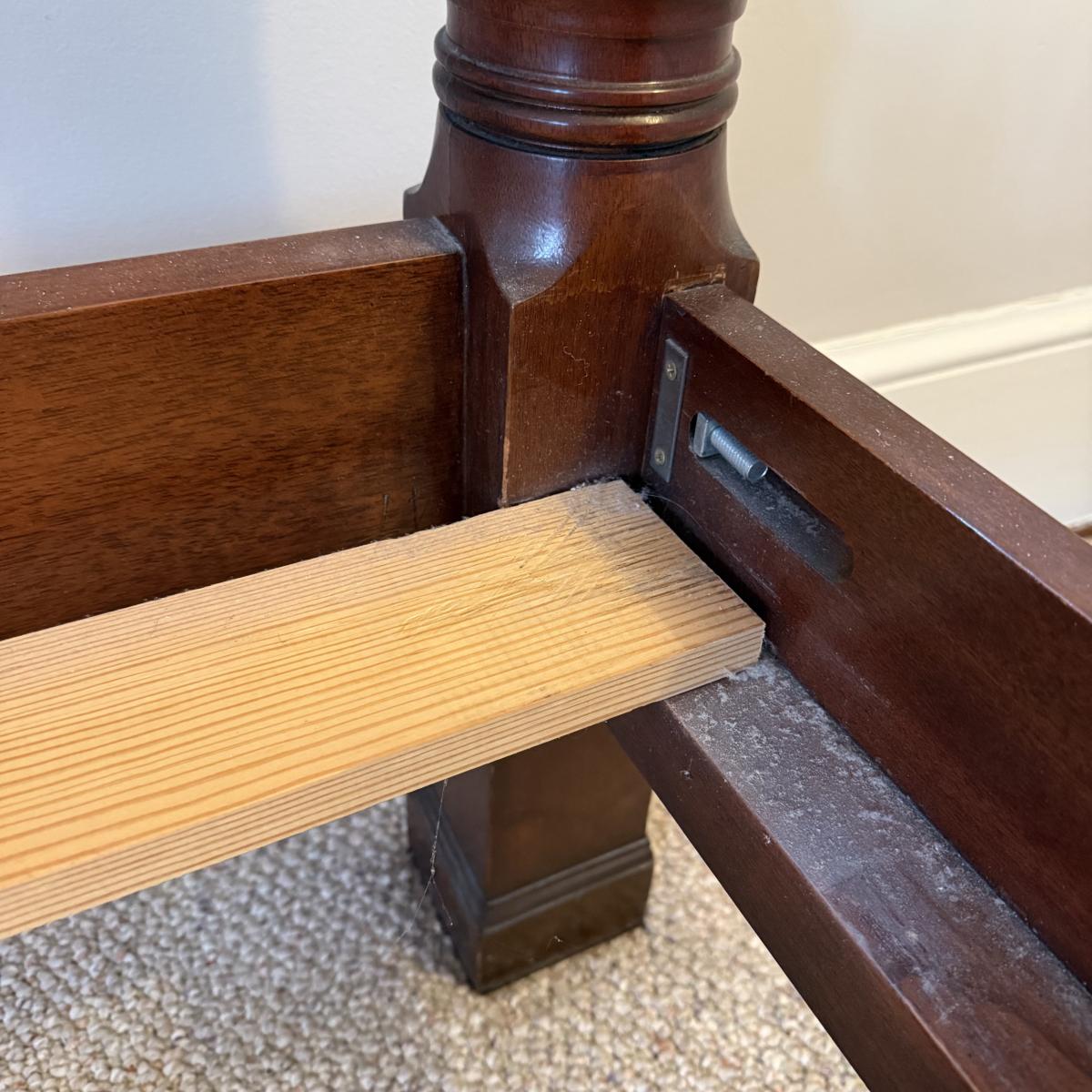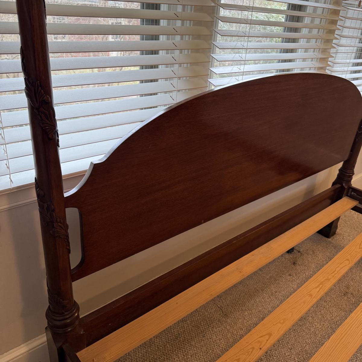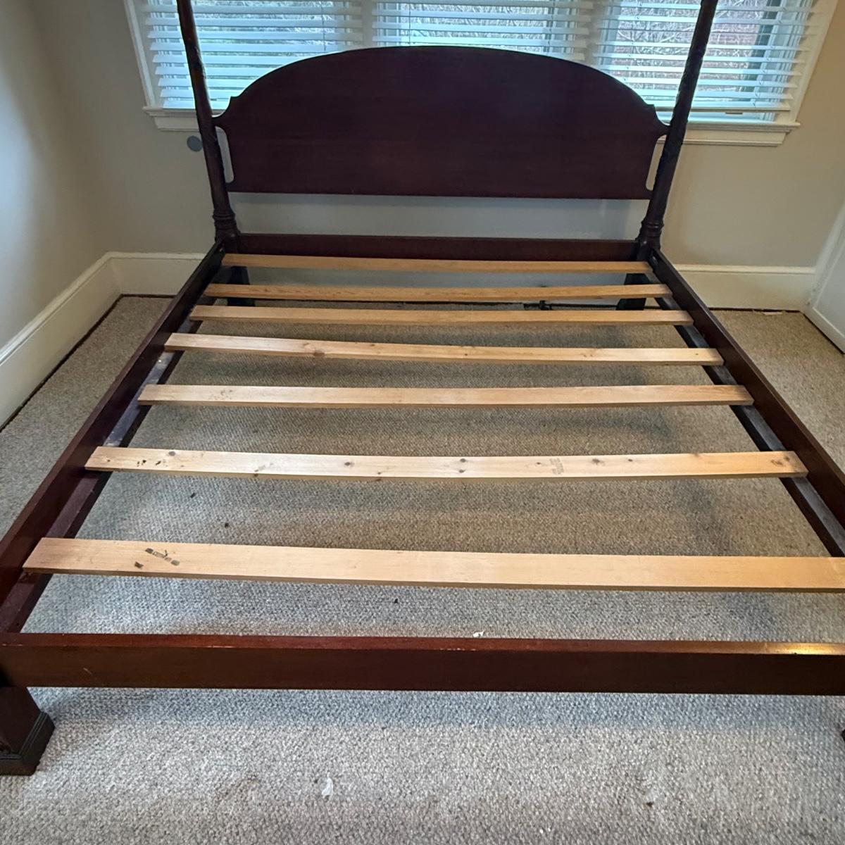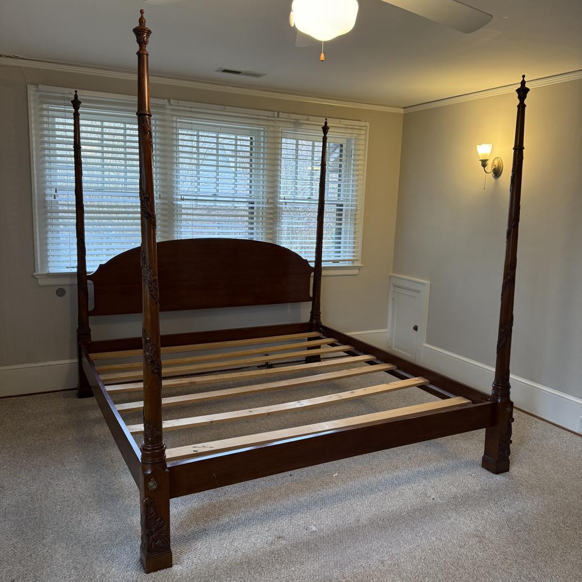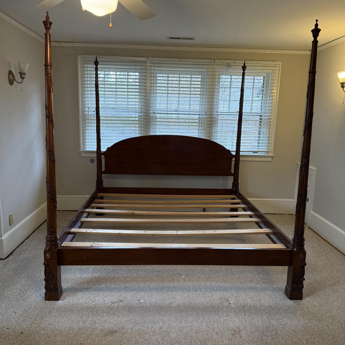 This lot contains an absolutely stunning king size four poster bed frame. This gorgeous bed frame is made of solid wood with rich coloring. Each post features delicate vibes carved into the wood and base. This piece measures approximately 83” x 90” x 88”H. There are some minor scrapes and scuffs, see pictures for details. Winner bidder will need a flat head screw driver to break this down. Local pick up only. Winning bidder MUST bring assistance to help move and load this item due to its weight and/or size. This piece is located on the second floor and will need to be moved down one staircase to the main floor and then another staircase to the parking port.