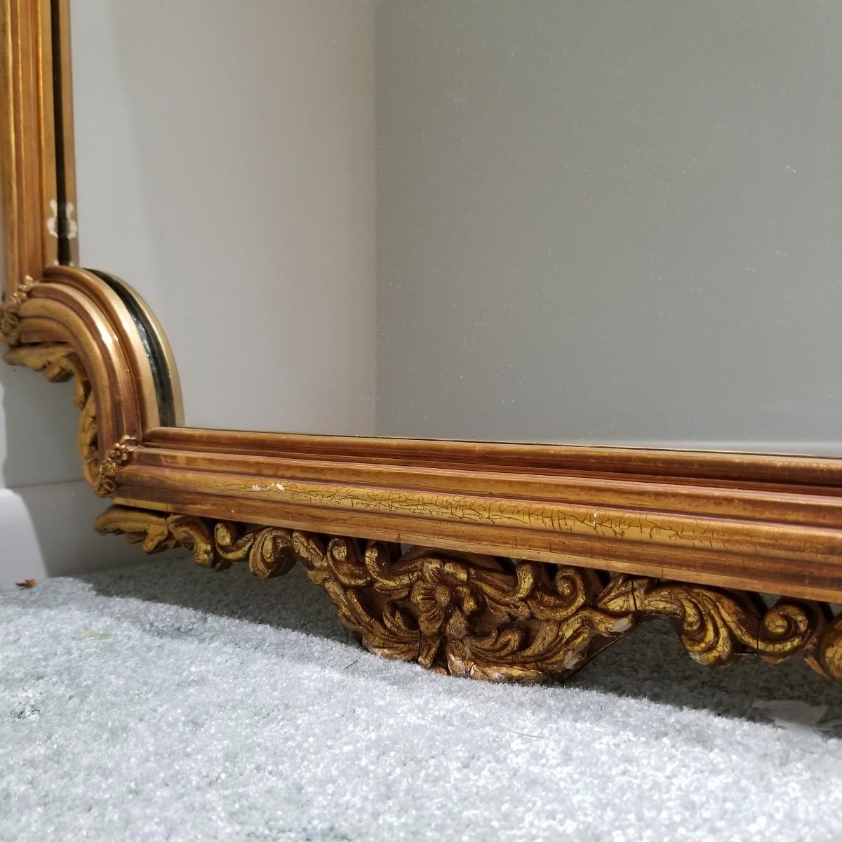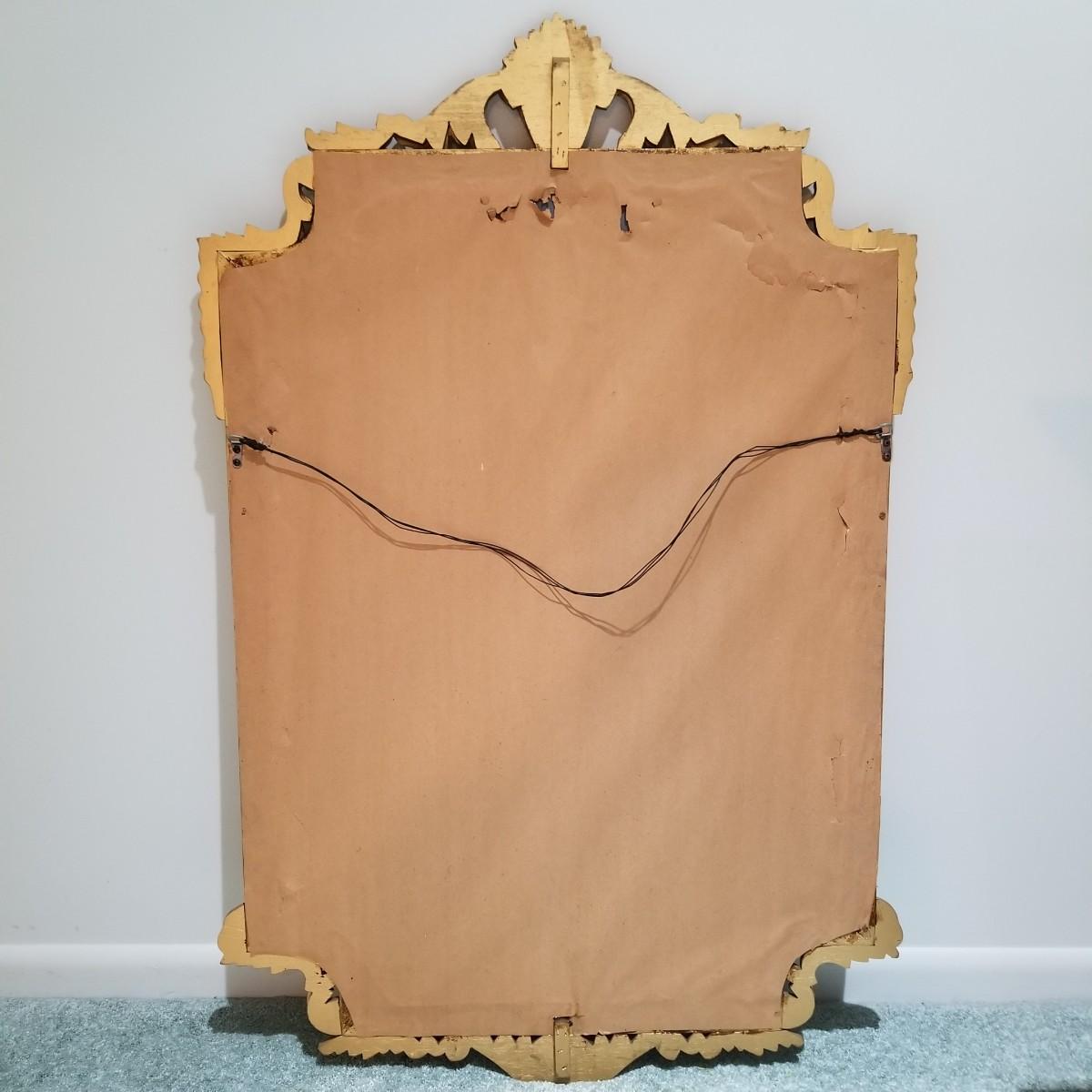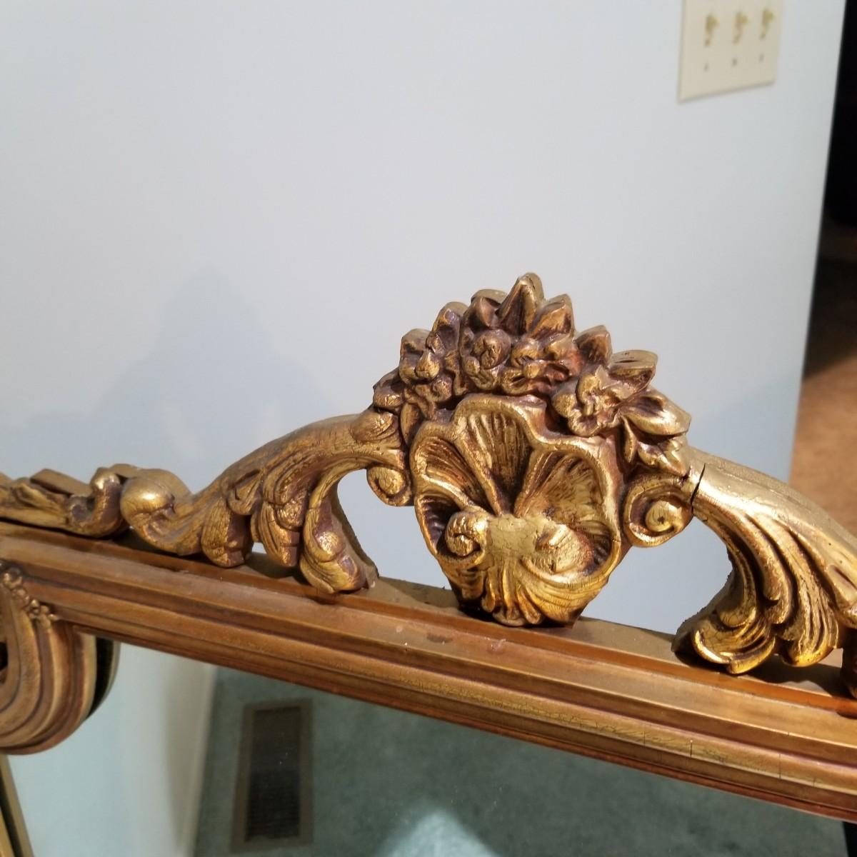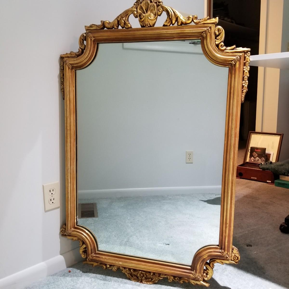 Fancy gold colored framed mirror.  Highly decorative wood frame, mirror is rectangular and measures 29"x44" with wire hanger on back.  See photos for detail.  Local pickup only.