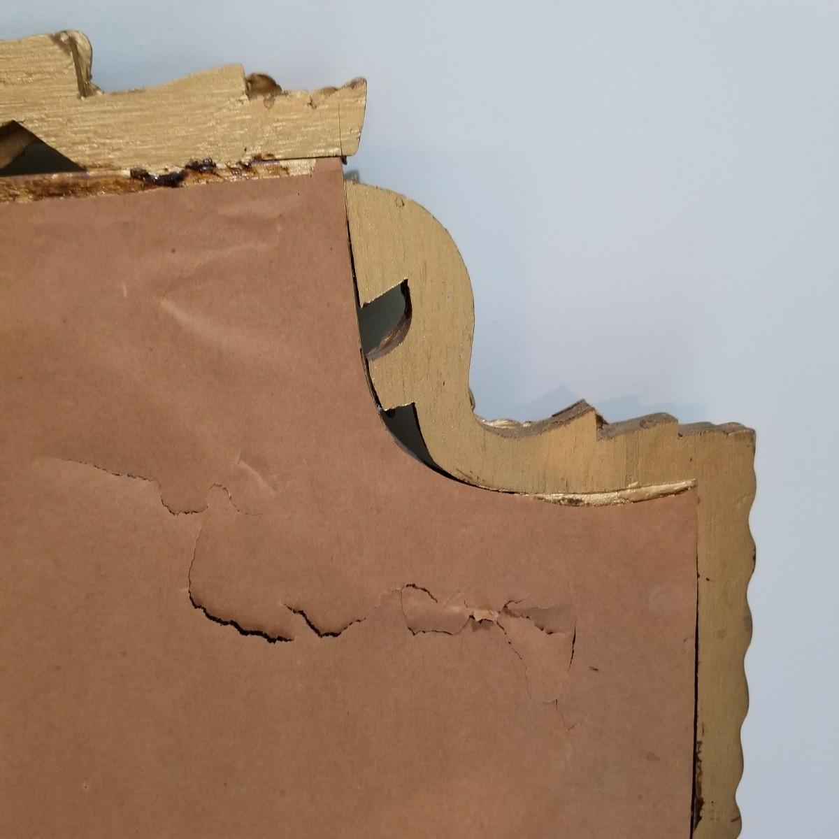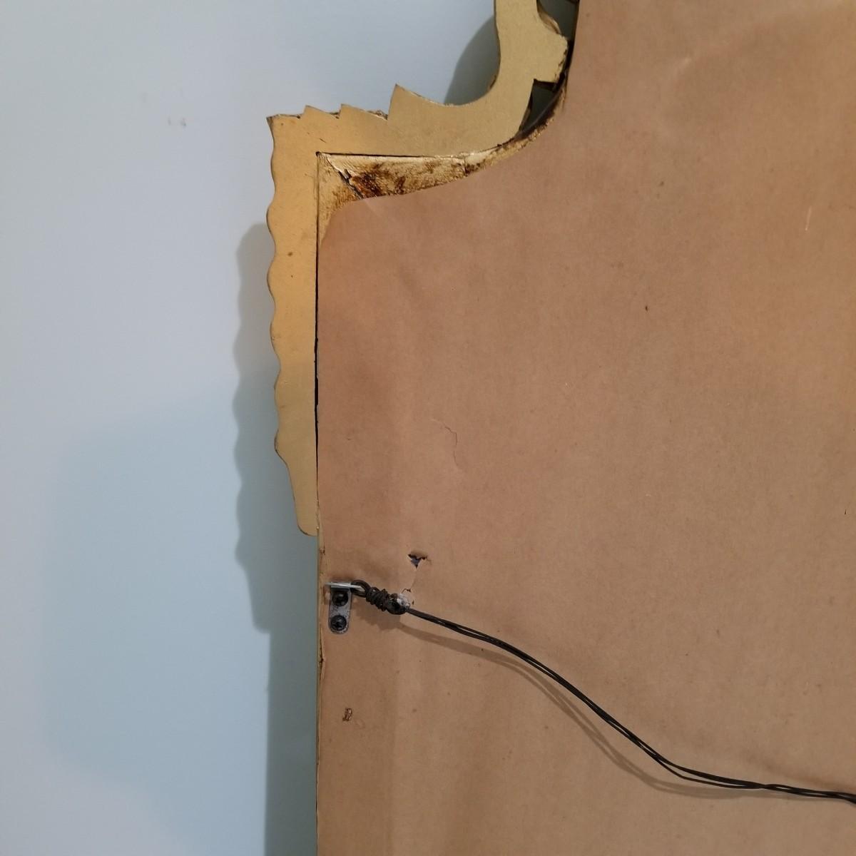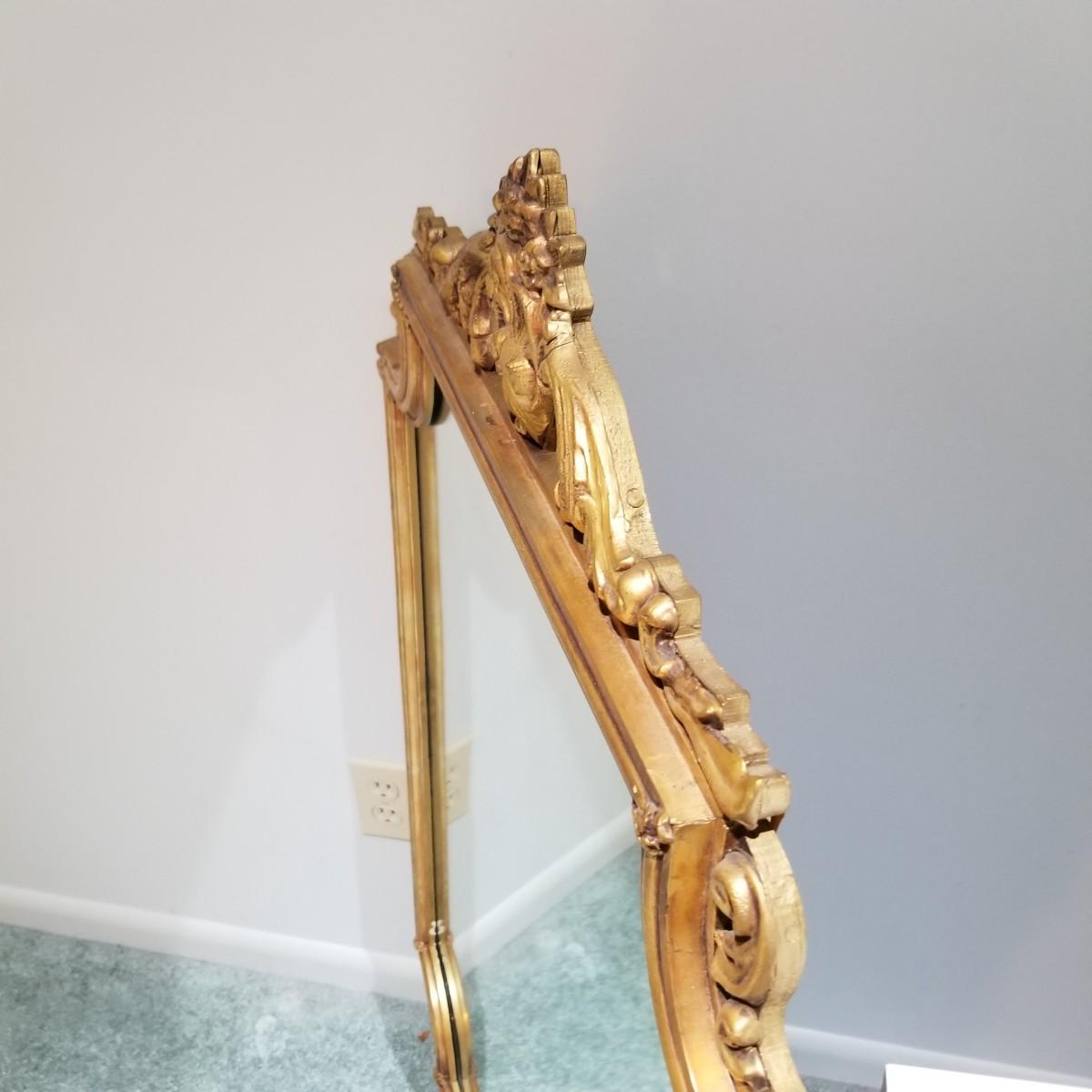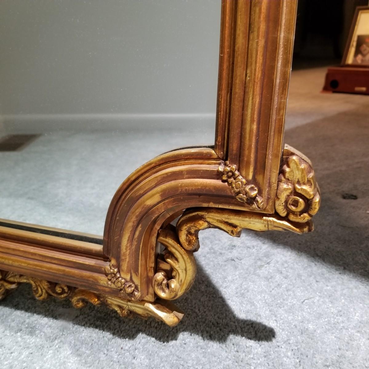 Fancy gold colored framed mirror.  Highly decorative wood frame, mirror is rectangular and measures 29"x44" with wire hanger on back.  See photos for detail.  Local pickup only.