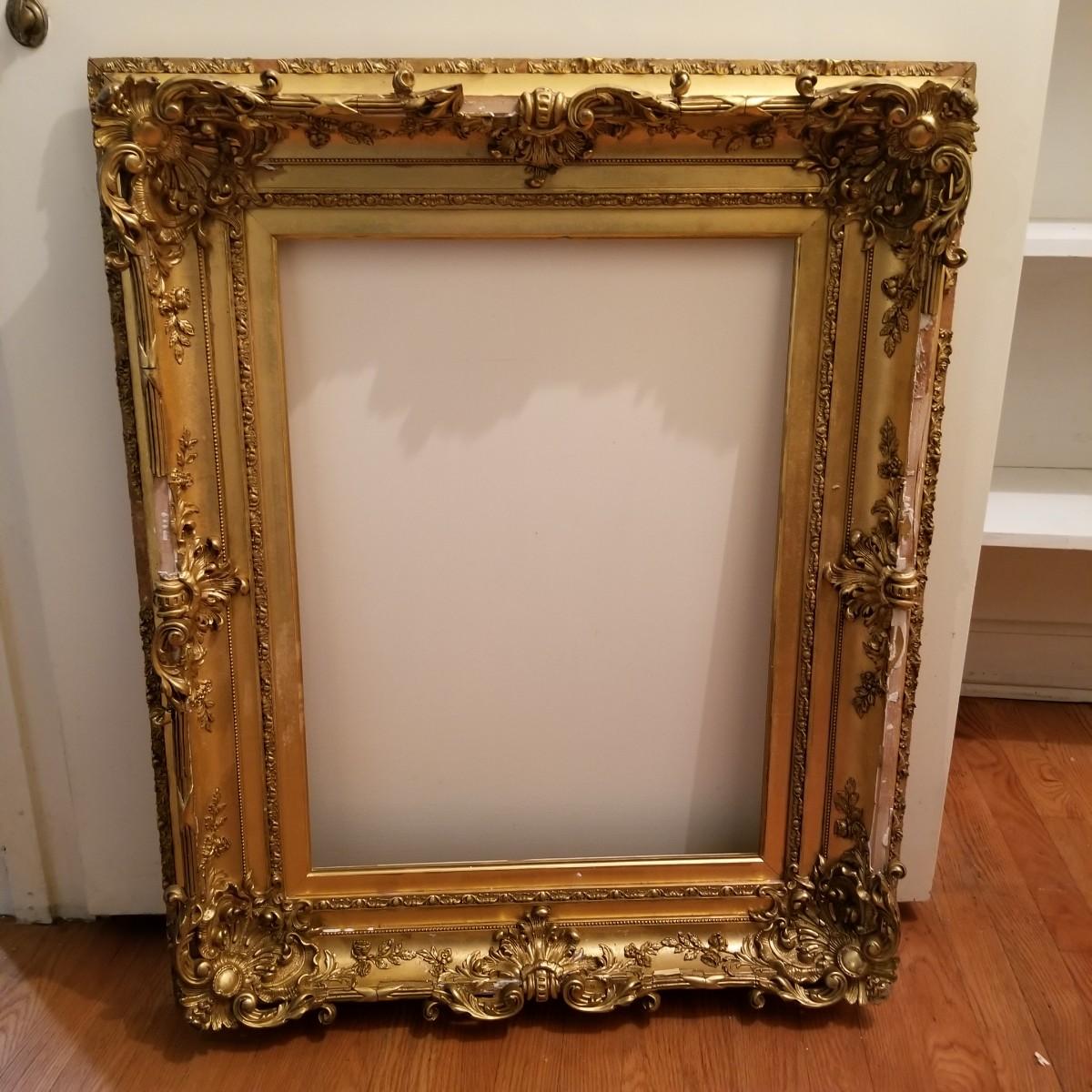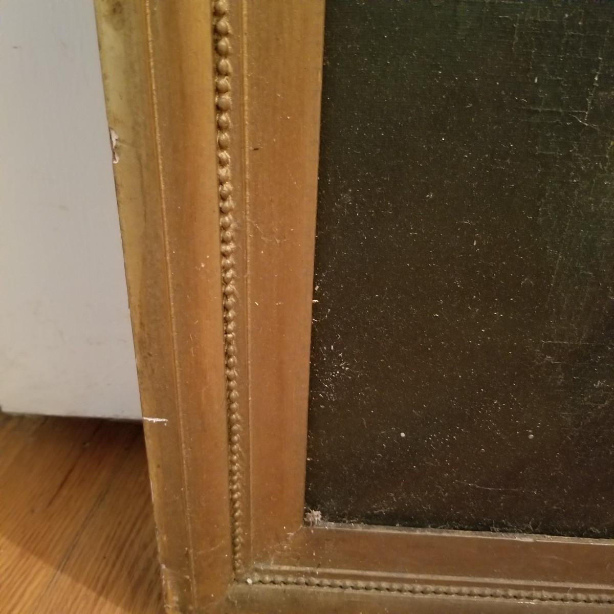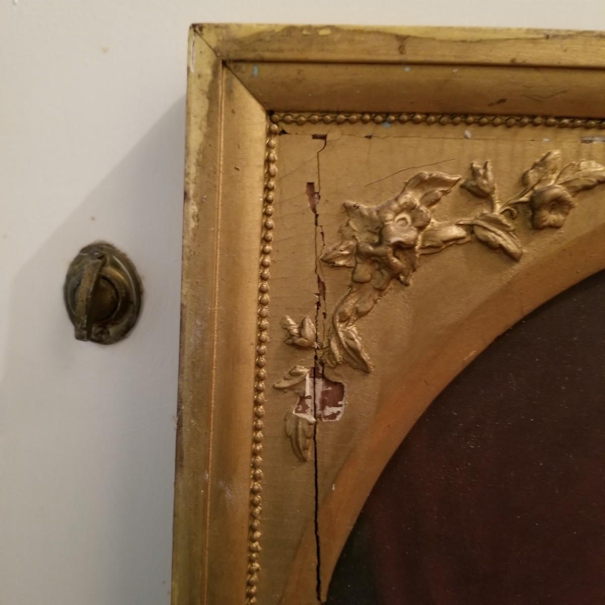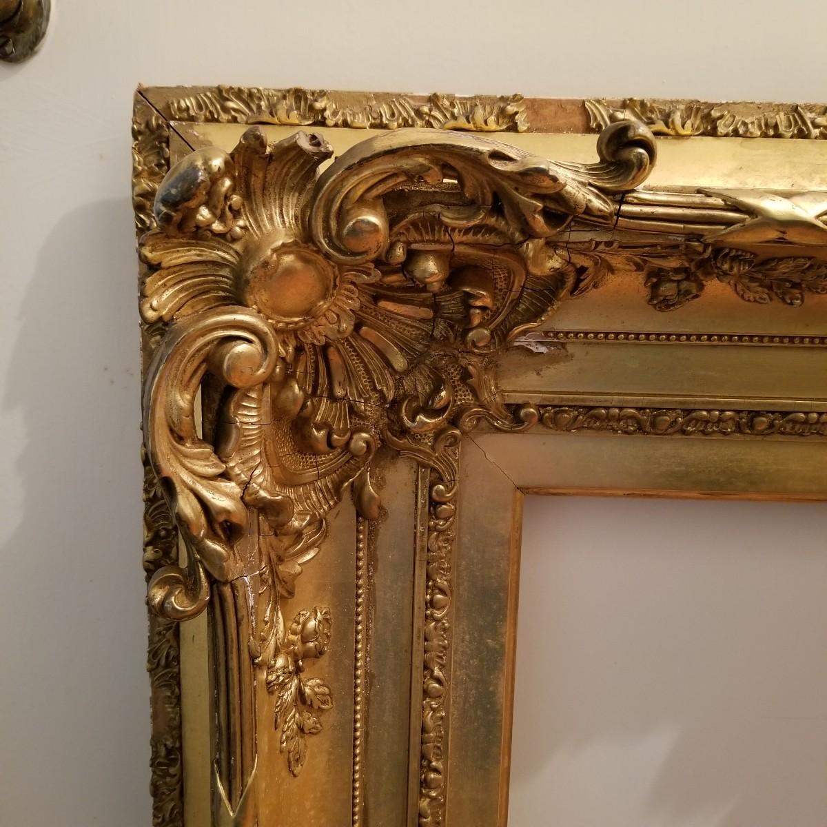 Three very detailed wooden gold frames, two with oil paintings in them (both show some damage). Large portrait of woman is 33" x40" x1"; it has streaks and lines in canvas. Gilt colored frame is highly decorative; is missing some pieces along edges. 29" x35" x4". Small oil has layered pattern edges, some pieces missing. Also some tears in canvas.  18" x26" x2". See photos for detail. Local pickup only.