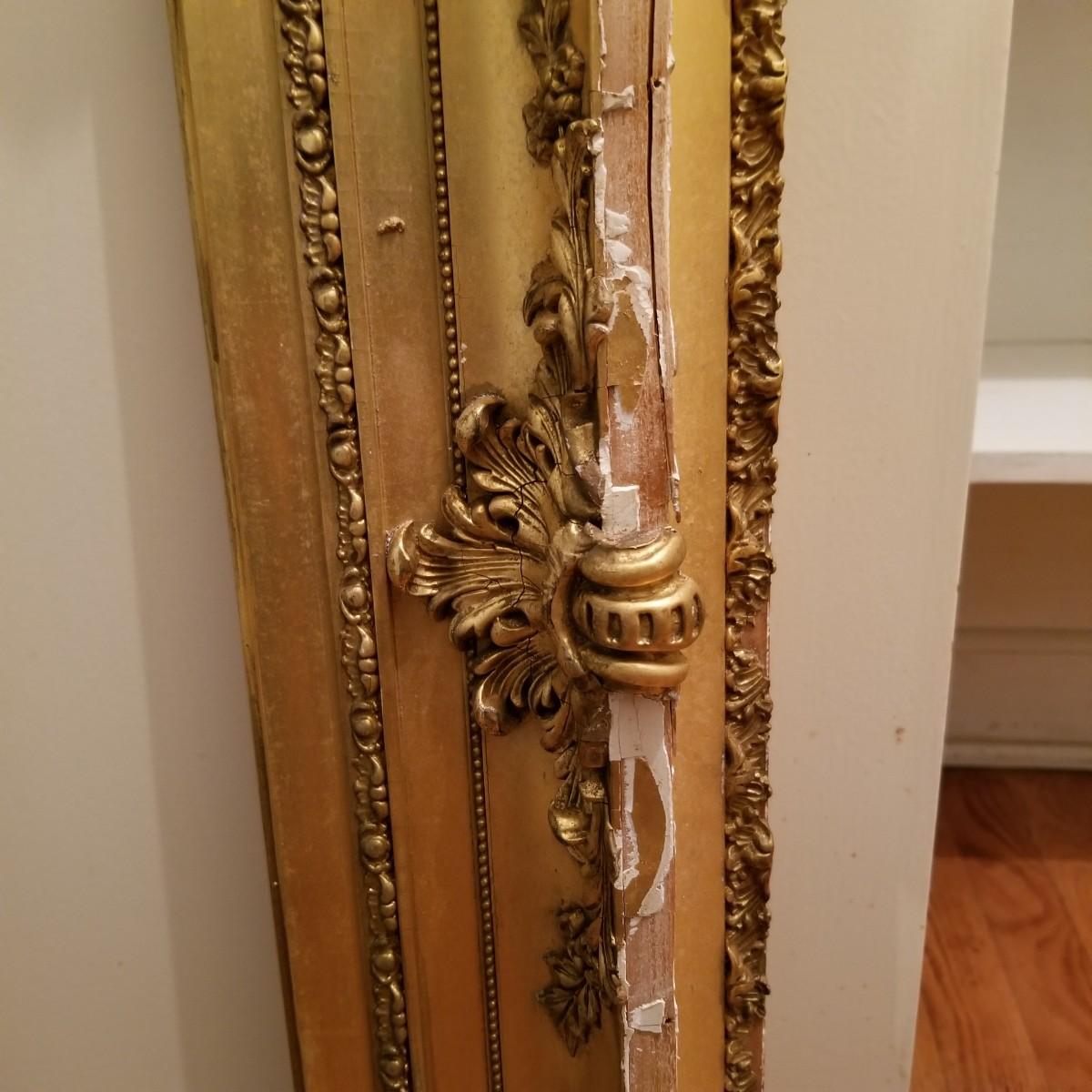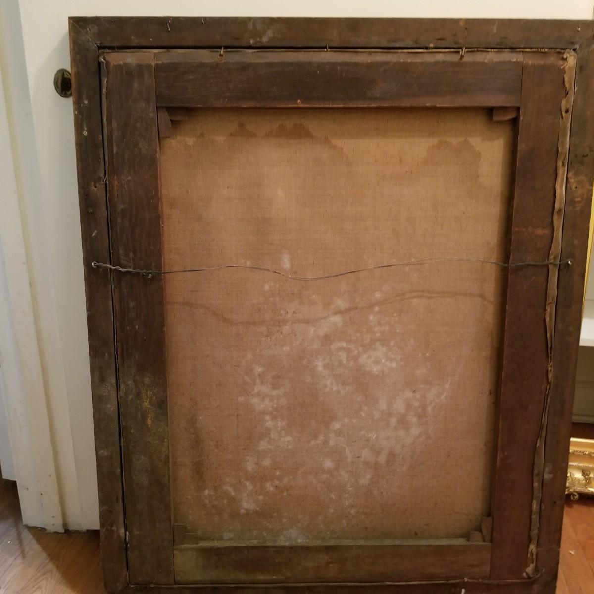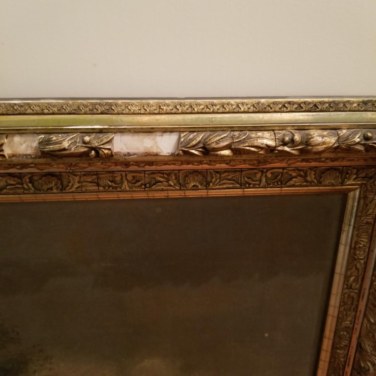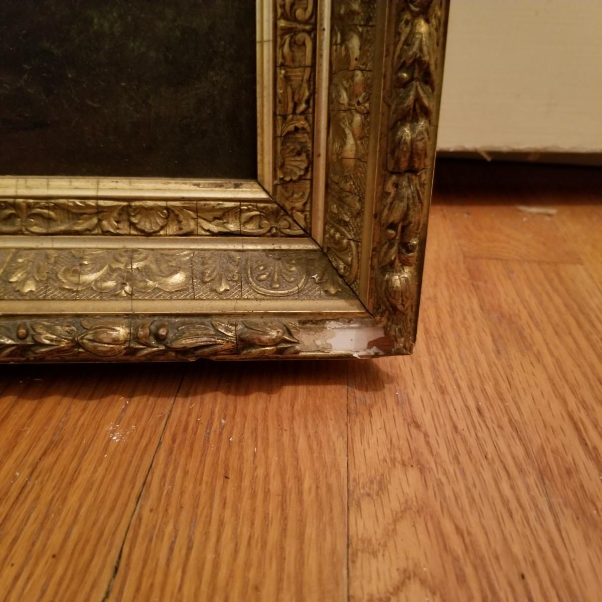 Three very detailed wooden gold frames, two with oil paintings in them (both show some damage). Large portrait of woman is 33" x40" x1"; it has streaks and lines in canvas. Gilt colored frame is highly decorative; is missing some pieces along edges. 29" x35" x4". Small oil has layered pattern edges, some pieces missing. Also some tears in canvas.  18" x26" x2". See photos for detail. Local pickup only.