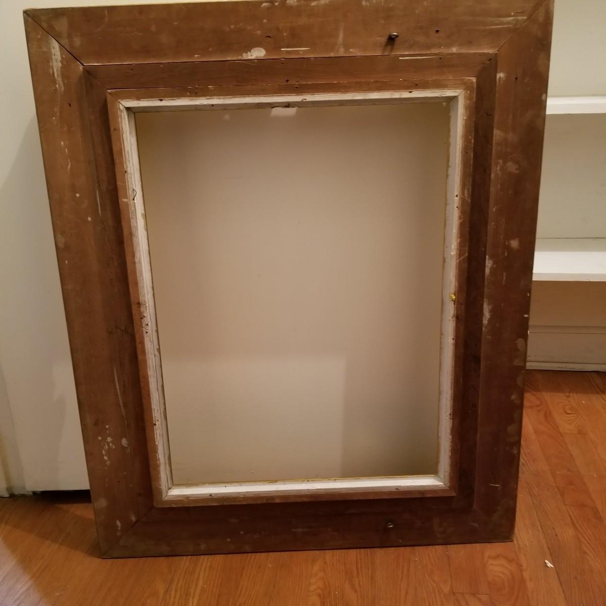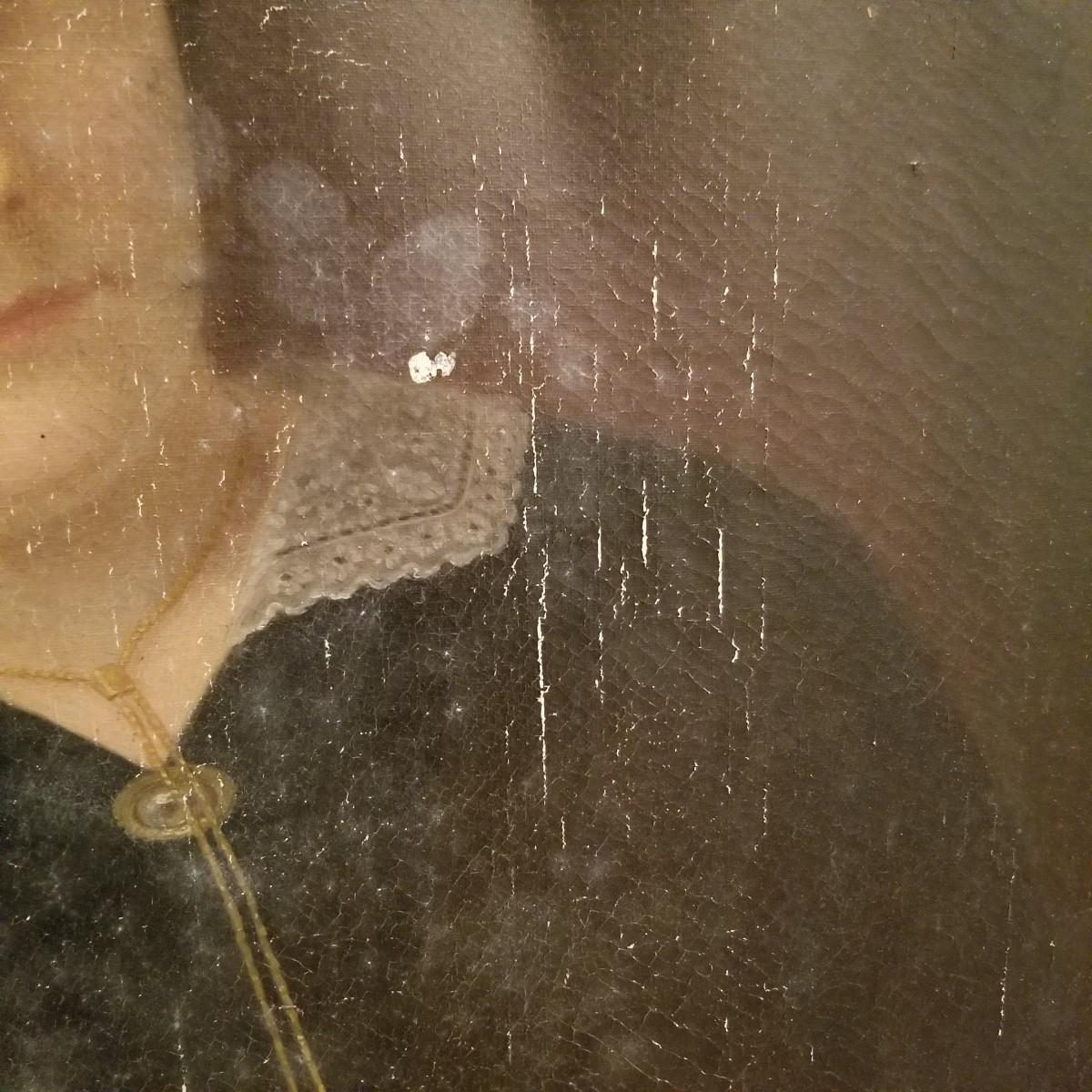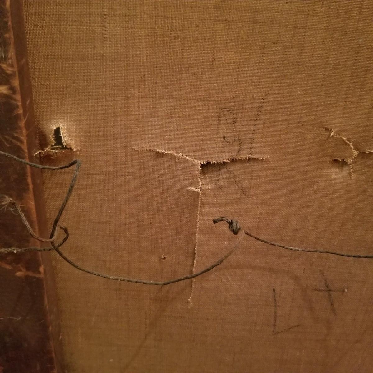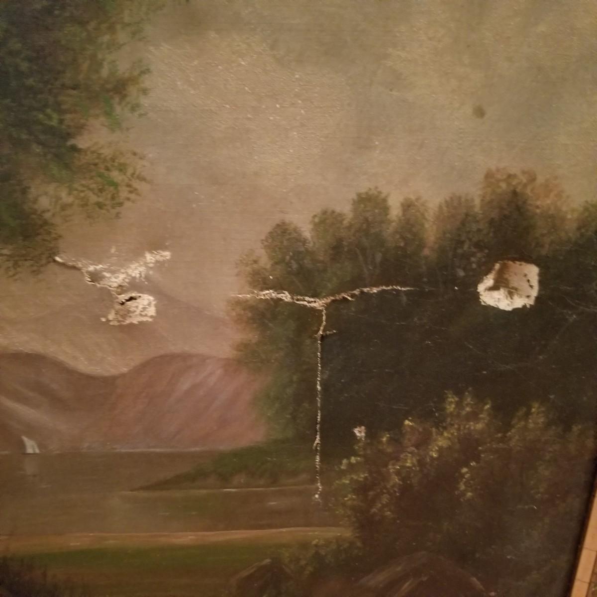 Three very detailed wooden gold frames, two with oil paintings in them (both show some damage). Large portrait of woman is 33" x40" x1"; it has streaks and lines in canvas. Gilt colored frame is highly decorative; is missing some pieces along edges. 29" x35" x4". Small oil has layered pattern edges, some pieces missing. Also some tears in canvas.  18" x26" x2". See photos for detail. Local pickup only.