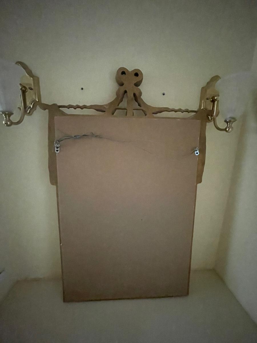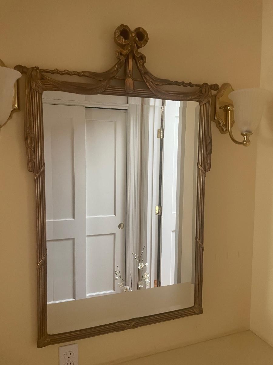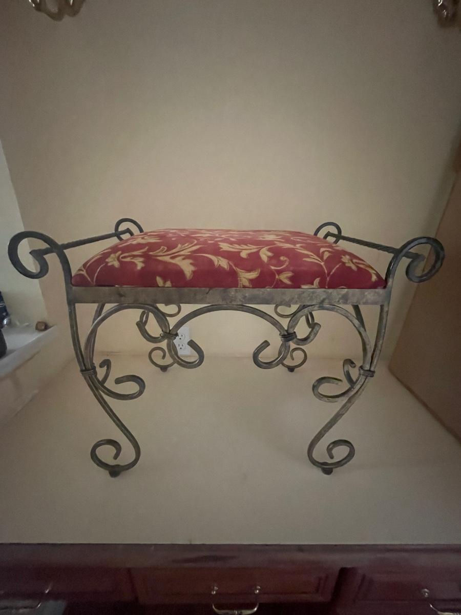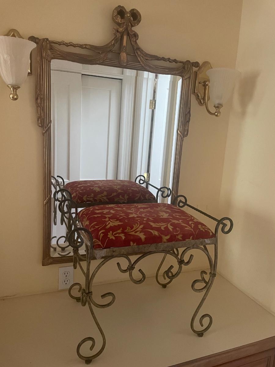 A perfect vanity duo this gilded mirror measures 30” x 44”; frame is a gold colored resin like material with durable hanging hardware and is in excellent condition. The stool is a gold painted metal with an attractive red and gold upholstered seat, it measures 23.5” x 14” with 17” seat height.