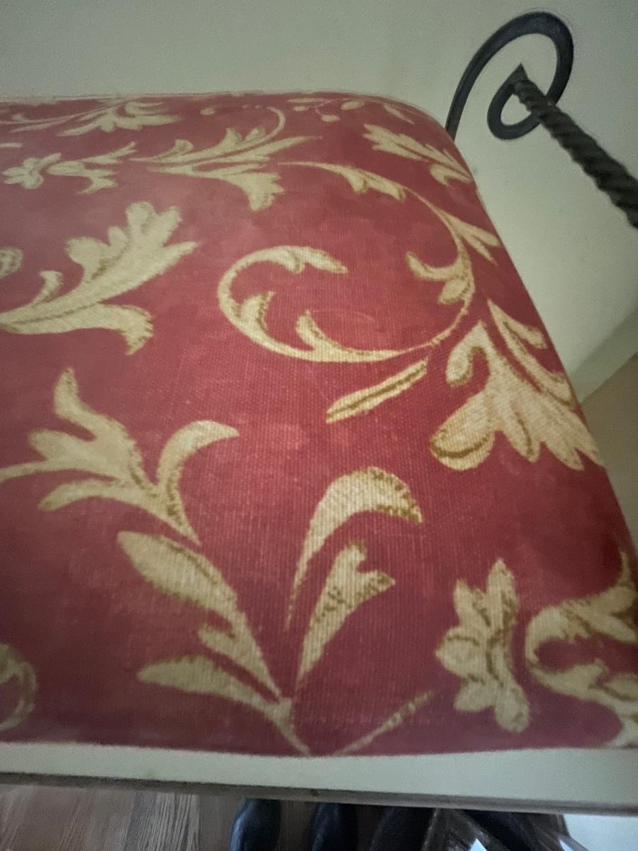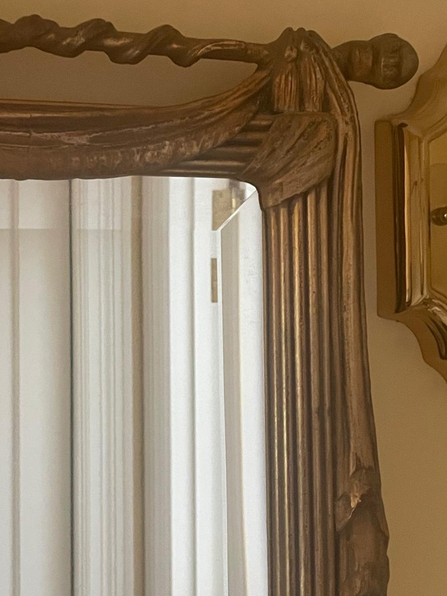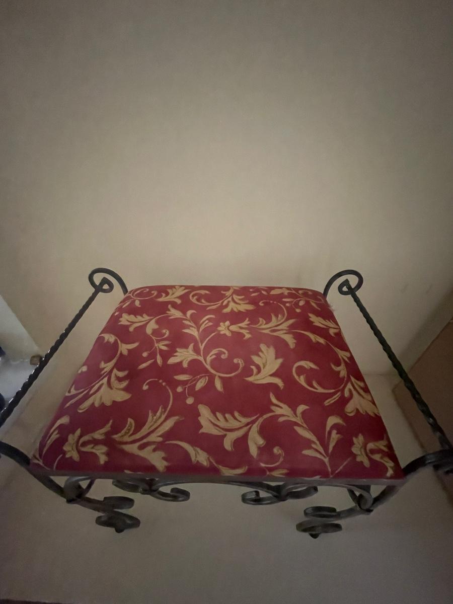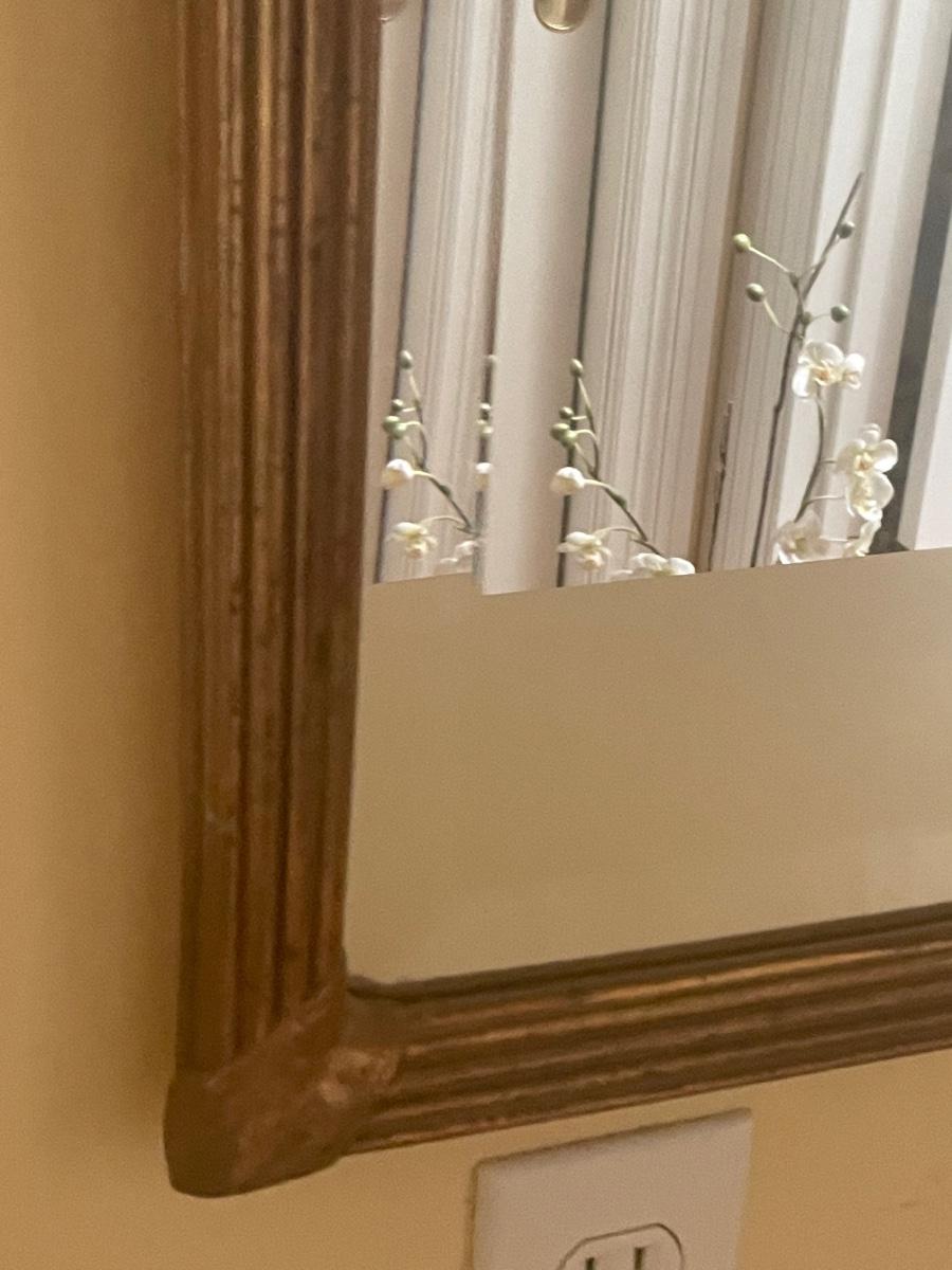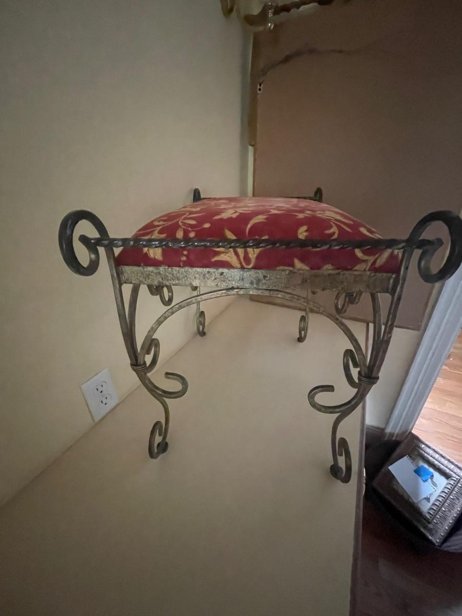 A perfect vanity duo this gilded mirror measures 30” x 44”; frame is a gold colored resin like material with durable hanging hardware and is in excellent condition. The stool is a gold painted metal with an attractive red and gold upholstered seat, it measures 23.5” x 14” with 17” seat height.