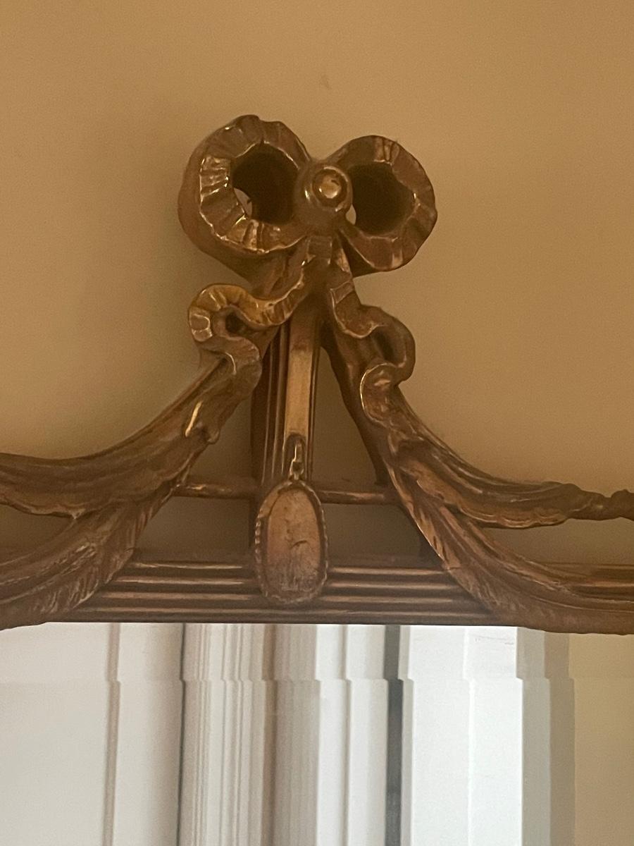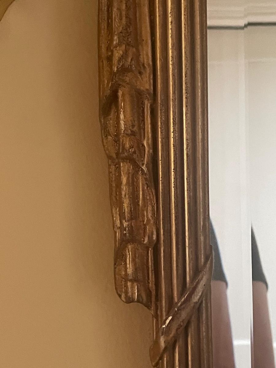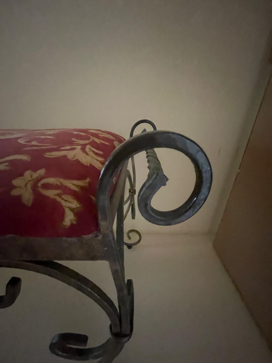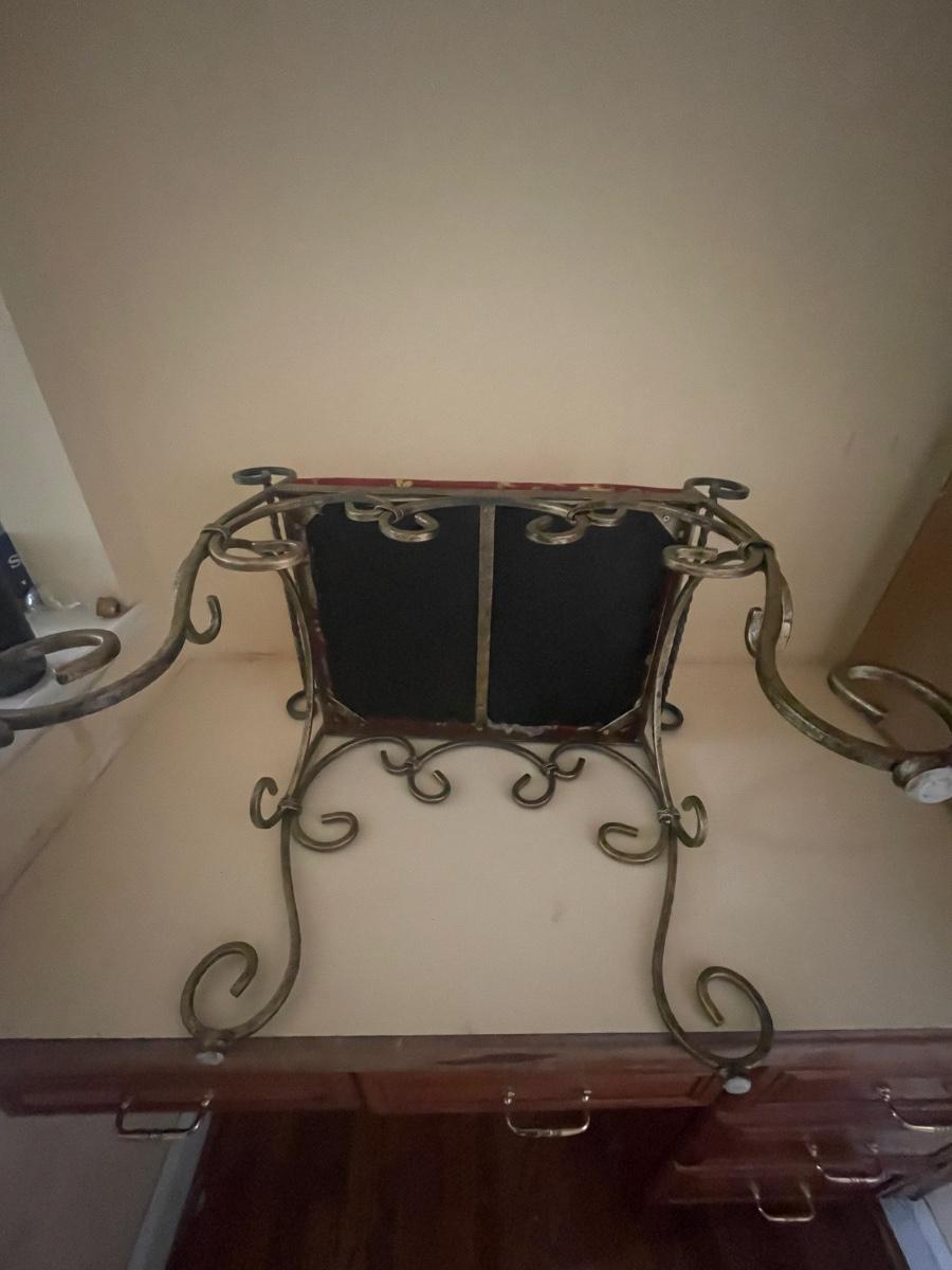 A perfect vanity duo this gilded mirror measures 30” x 44”; frame is a gold colored resin like material with durable hanging hardware and is in excellent condition. The stool is a gold painted metal with an attractive red and gold upholstered seat, it measures 23.5” x 14” with 17” seat height.