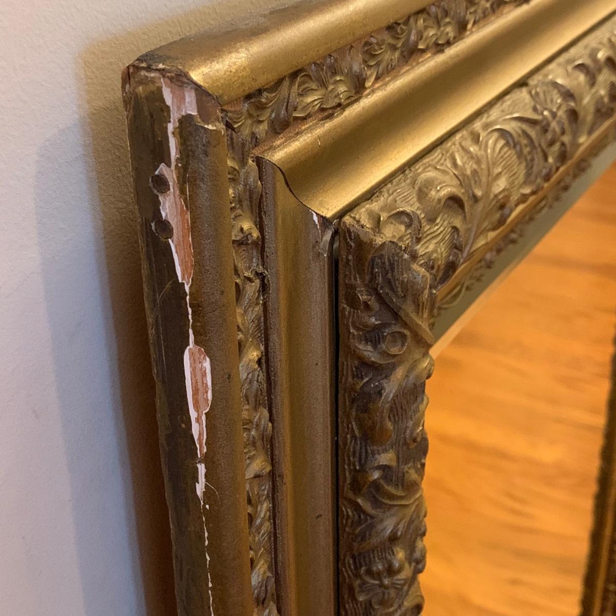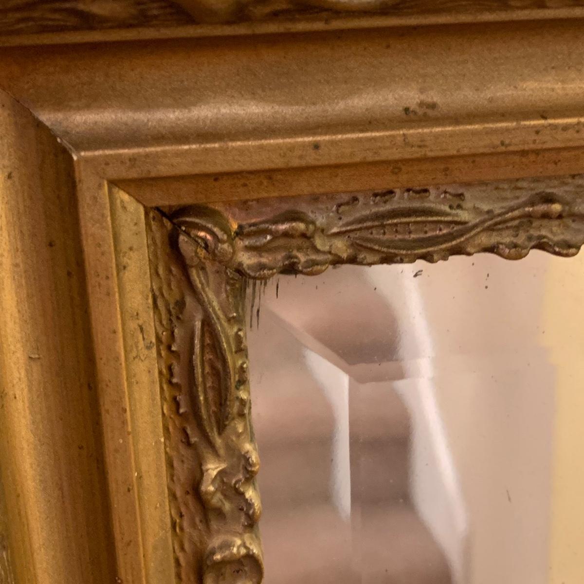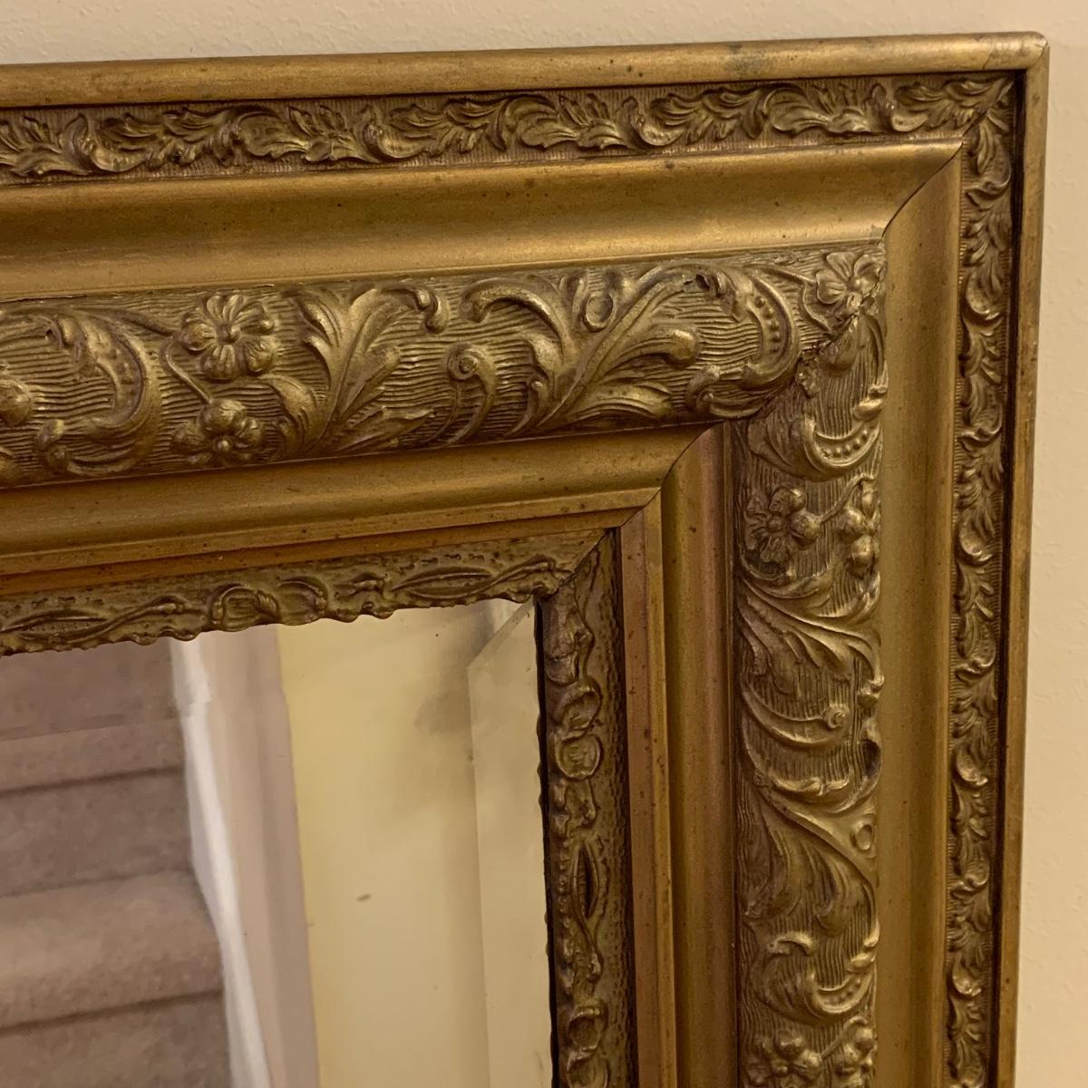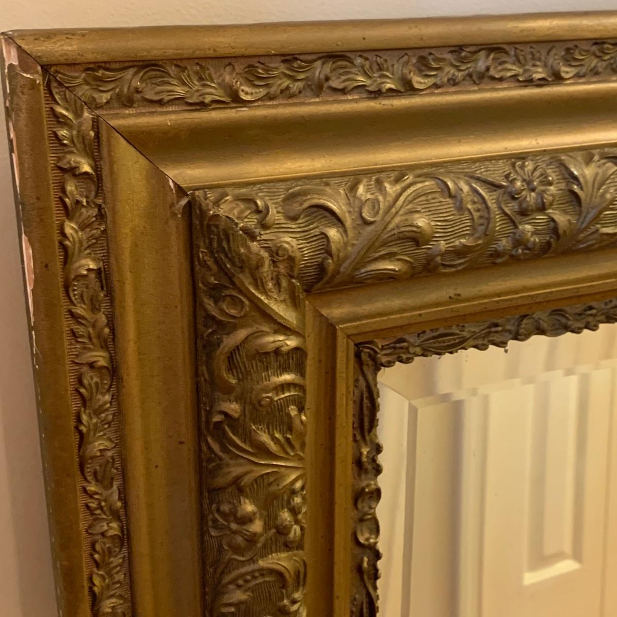 Multiple layers of ornate carved designs are found on the thick frame that borders this beveled mirror. The framed is wood that has been painted gold. The frame measures 29” x 51”. The wire is currently attached to hang the mirror vertically, but there is hardware to change the orientation if desired. There are some blemishes on the mirror and chips and wear on the frame.