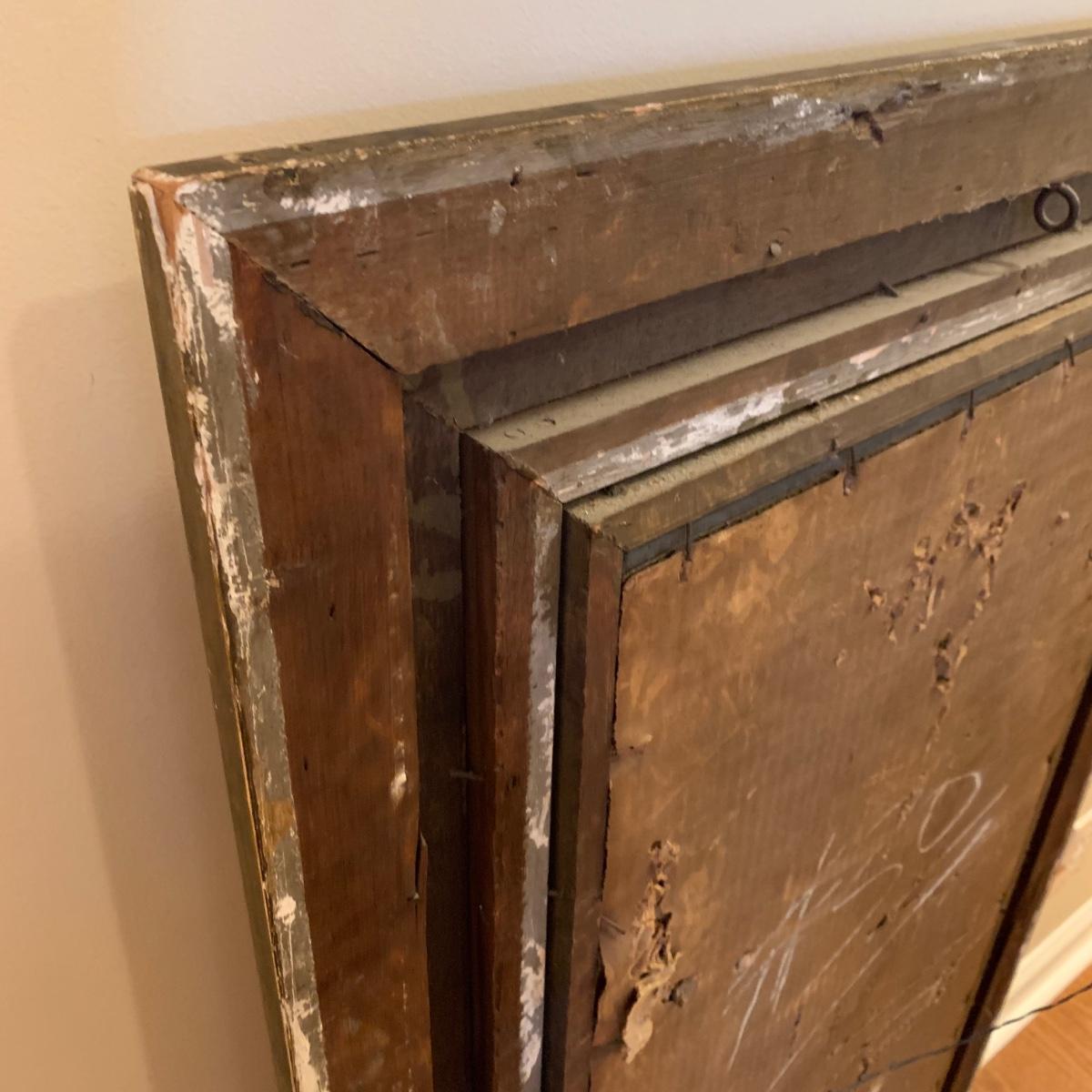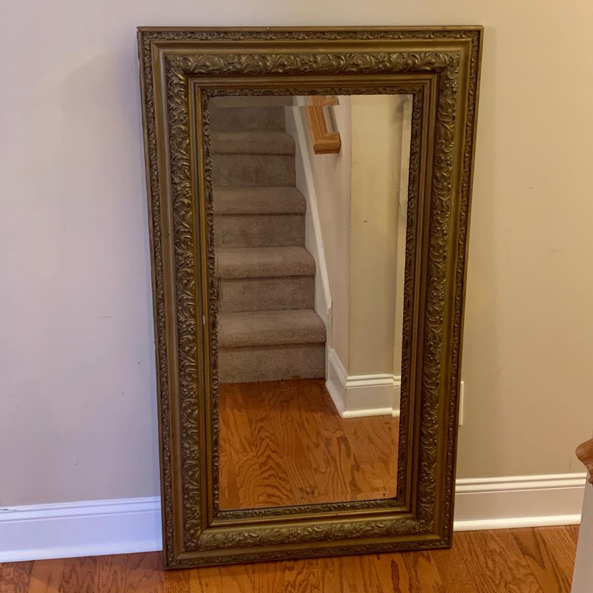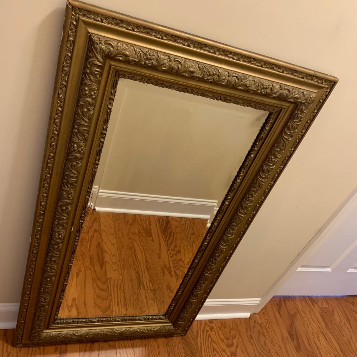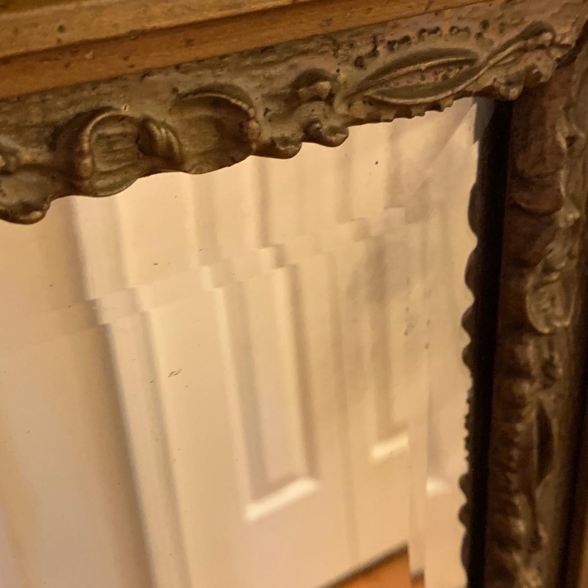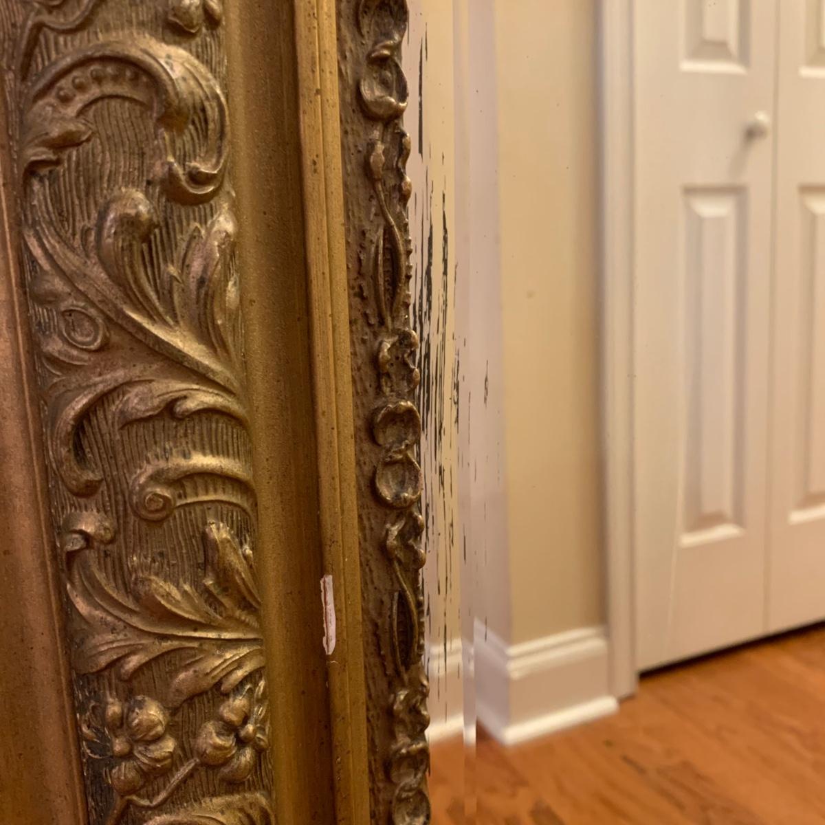 Multiple layers of ornate carved designs are found on the thick frame that borders this beveled mirror. The framed is wood that has been painted gold. The frame measures 29” x 51”. The wire is currently attached to hang the mirror vertically, but there is hardware to change the orientation if desired. There are some blemishes on the mirror and chips and wear on the frame.