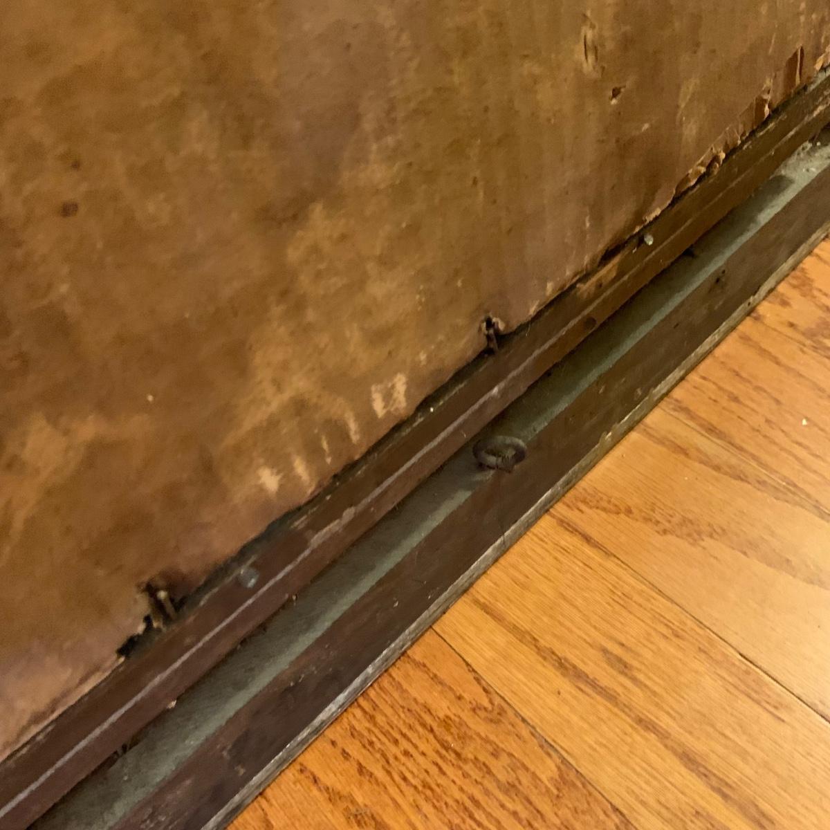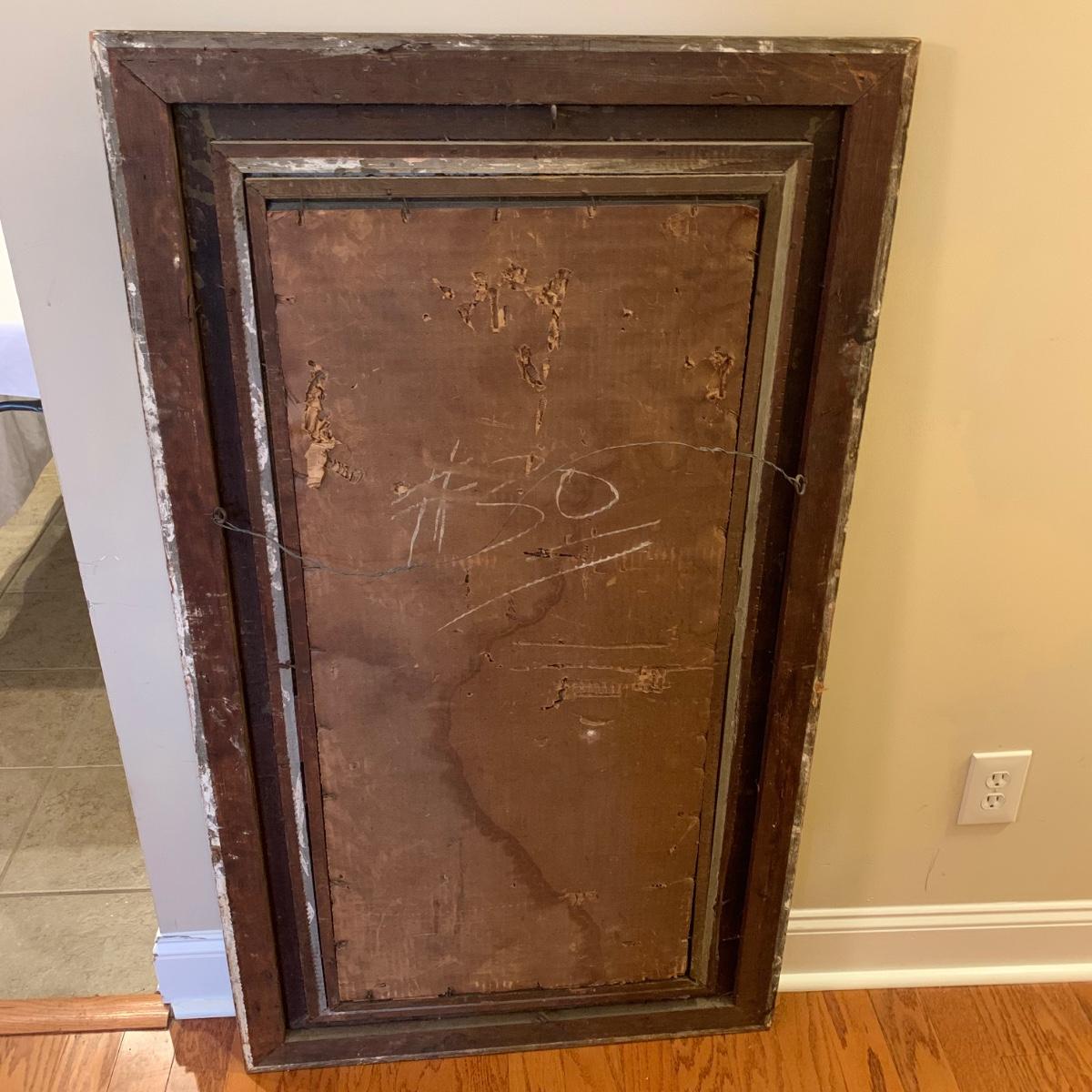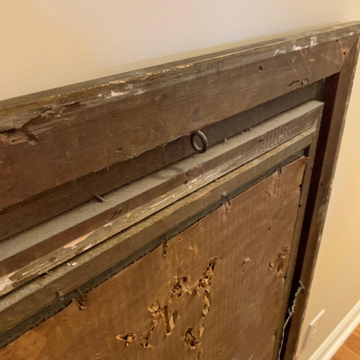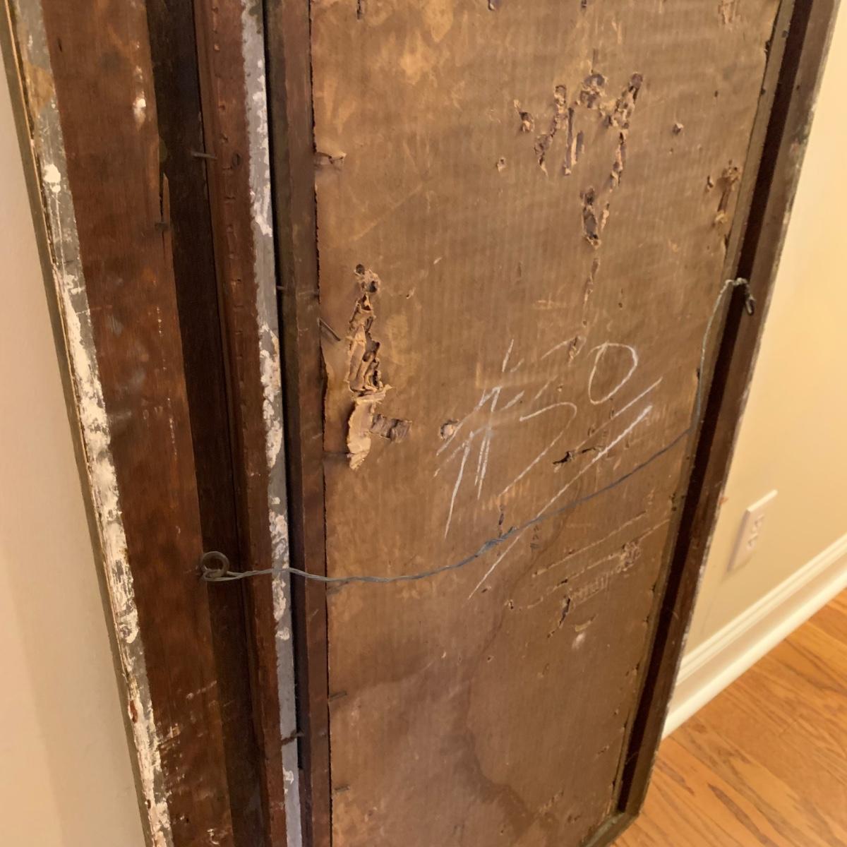 Multiple layers of ornate carved designs are found on the thick frame that borders this beveled mirror. The framed is wood that has been painted gold. The frame measures 29” x 51”. The wire is currently attached to hang the mirror vertically, but there is hardware to change the orientation if desired. There are some blemishes on the mirror and chips and wear on the frame.