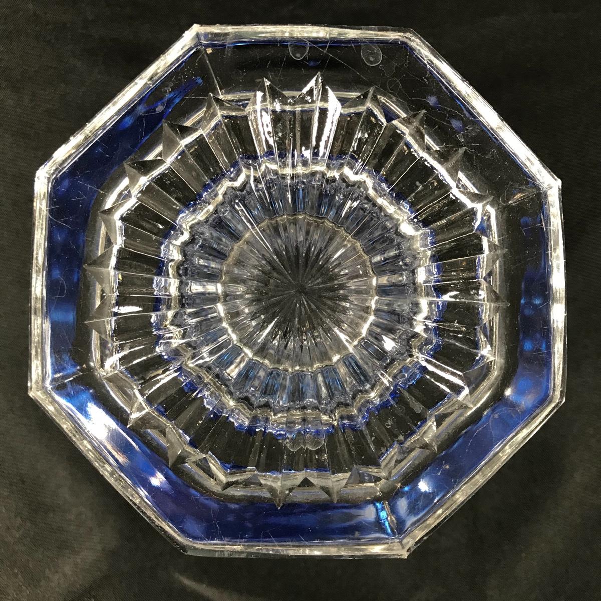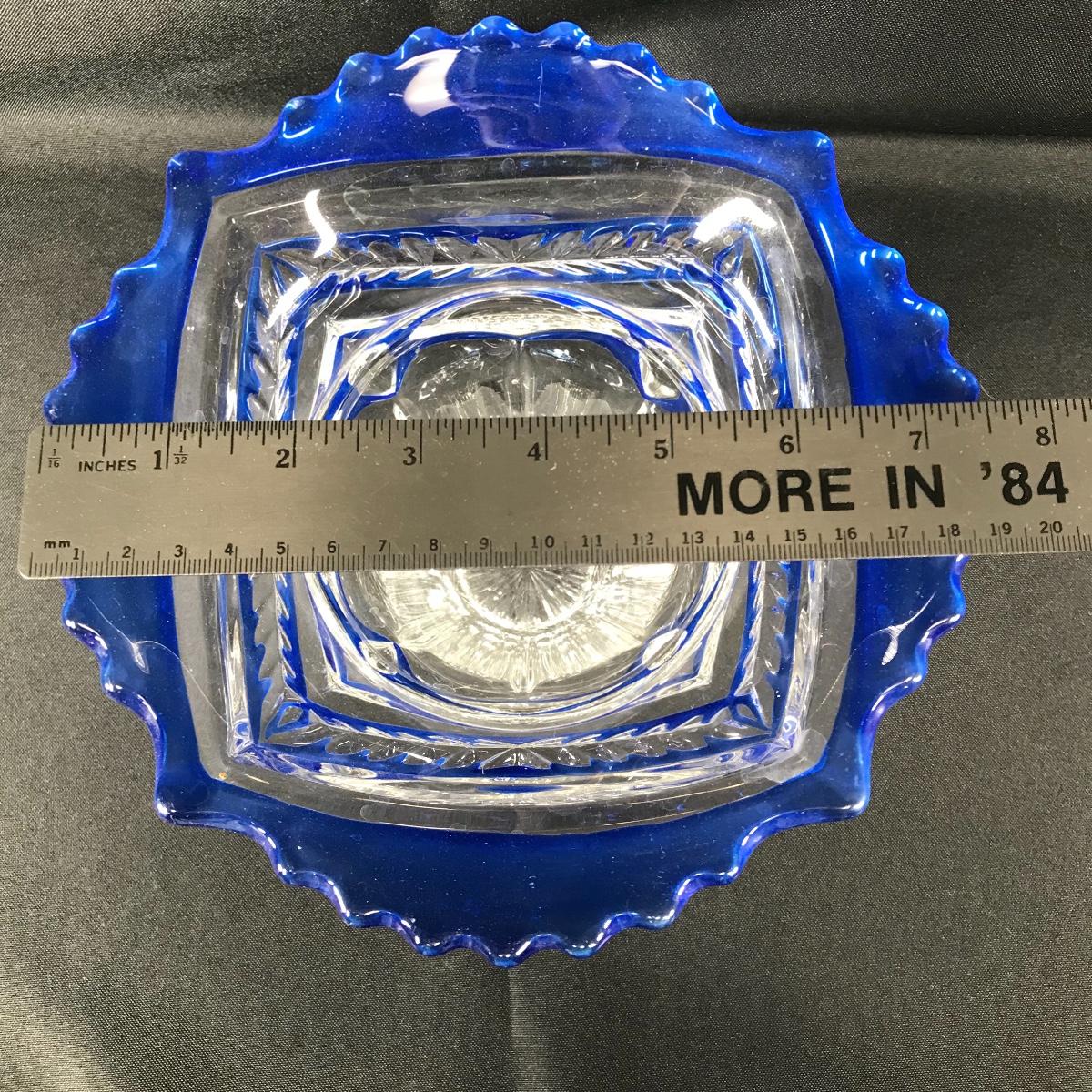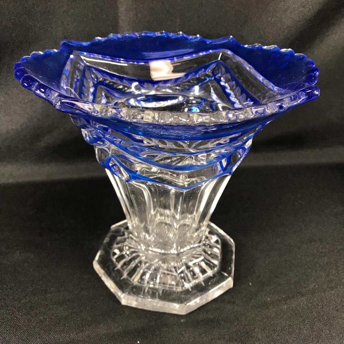 Up for auction is a cobalt to clear flower vase. Etched ornate design. It stands approximately 6.75“ tall; see pictures.