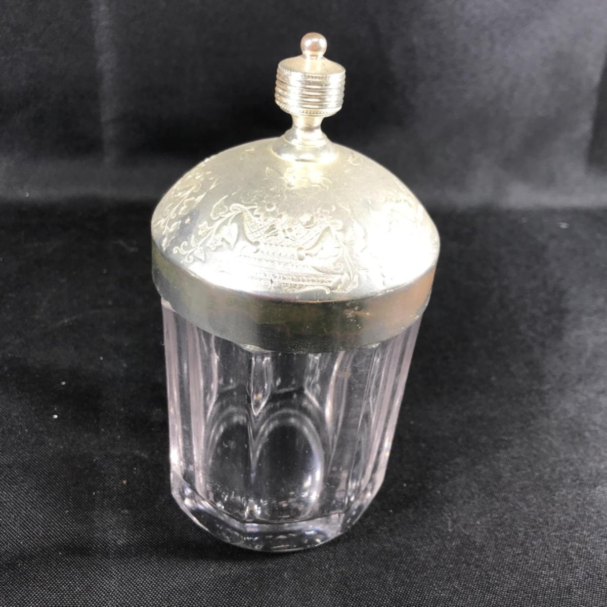 Up for auction is a silvertone and glass pickle caster. Glass jar with metal hardware; see pictures.