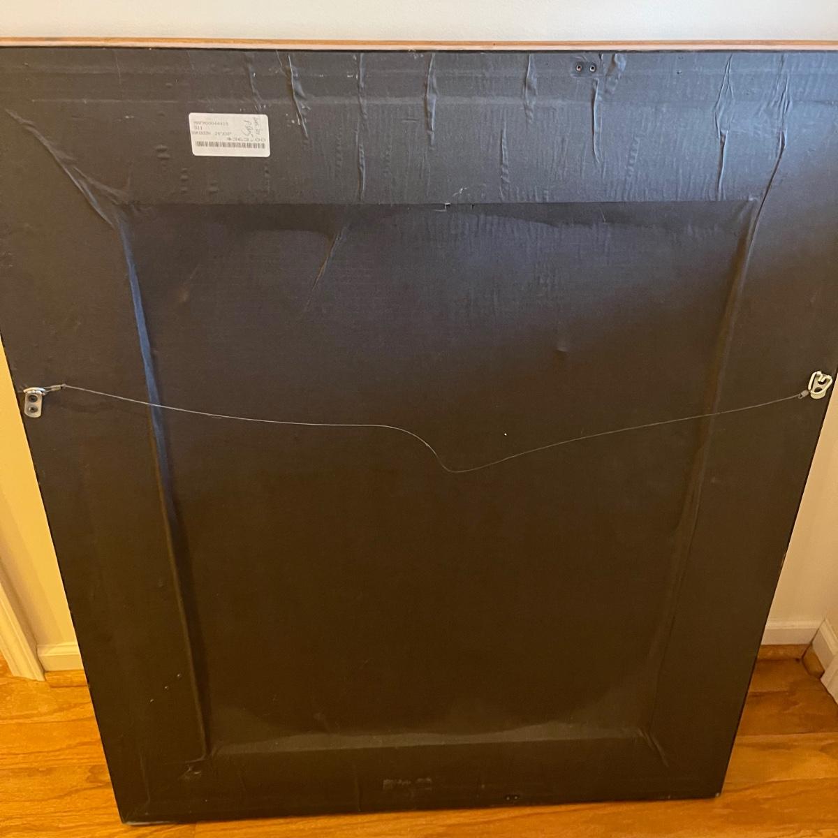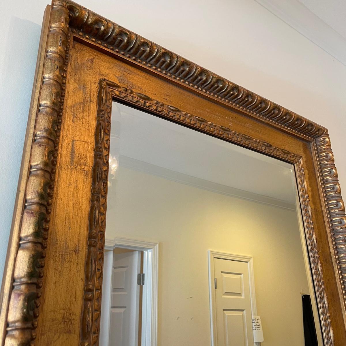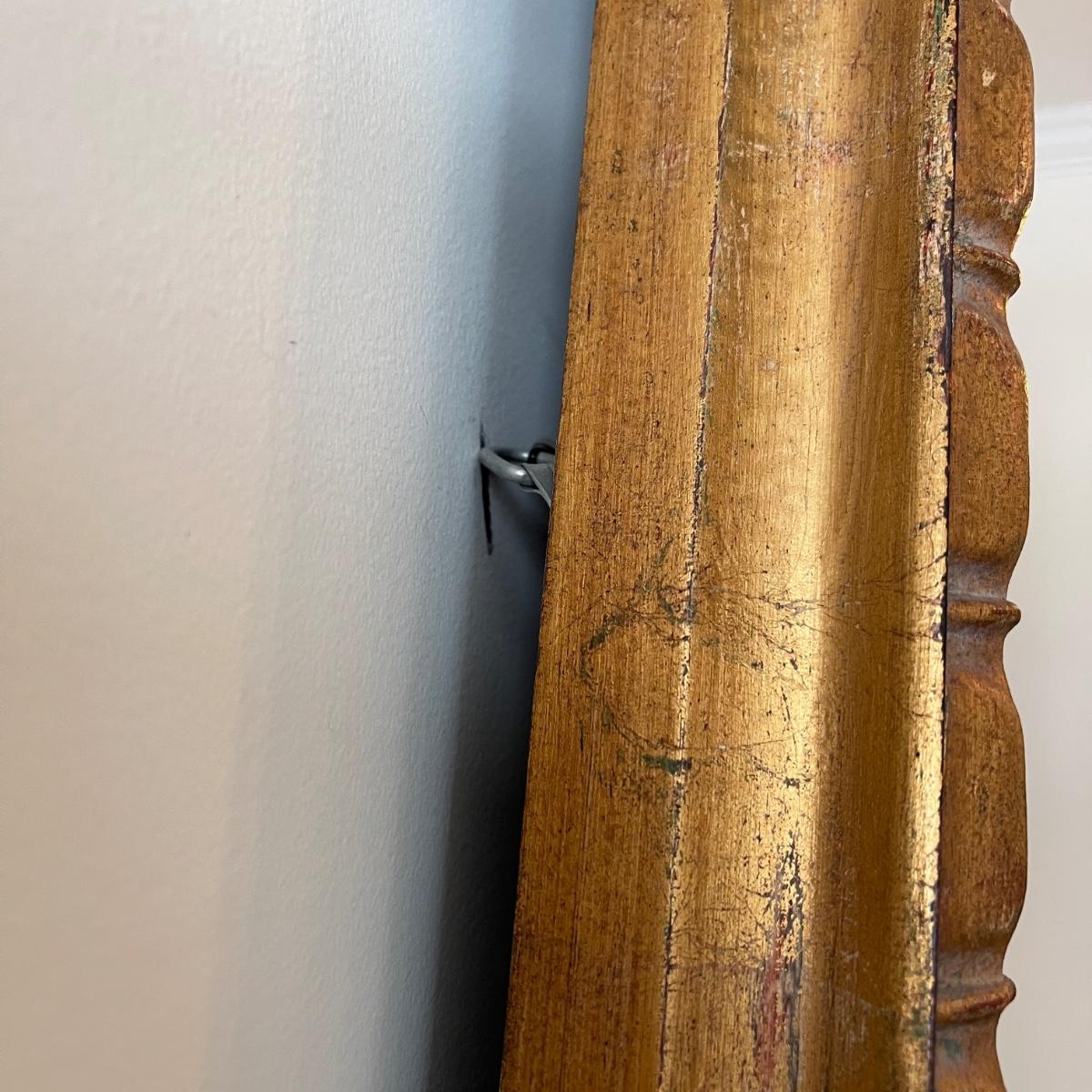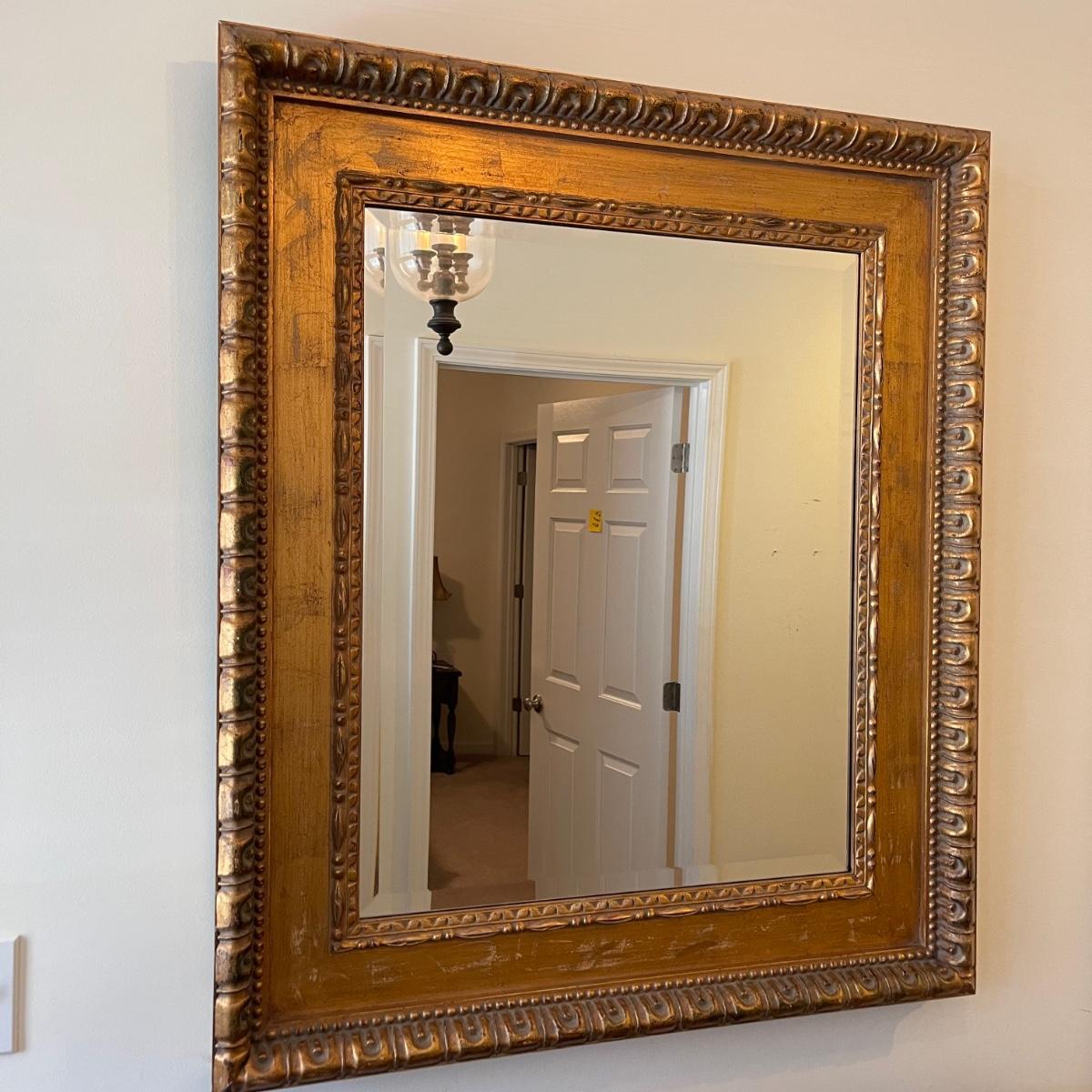 A large ornate gold colored mirror.that appears to be wooden. It measures 35” x 41” and the frame is about 3” thick. It is hung by a wire across the back and the back has no noticeable brand name or signature.