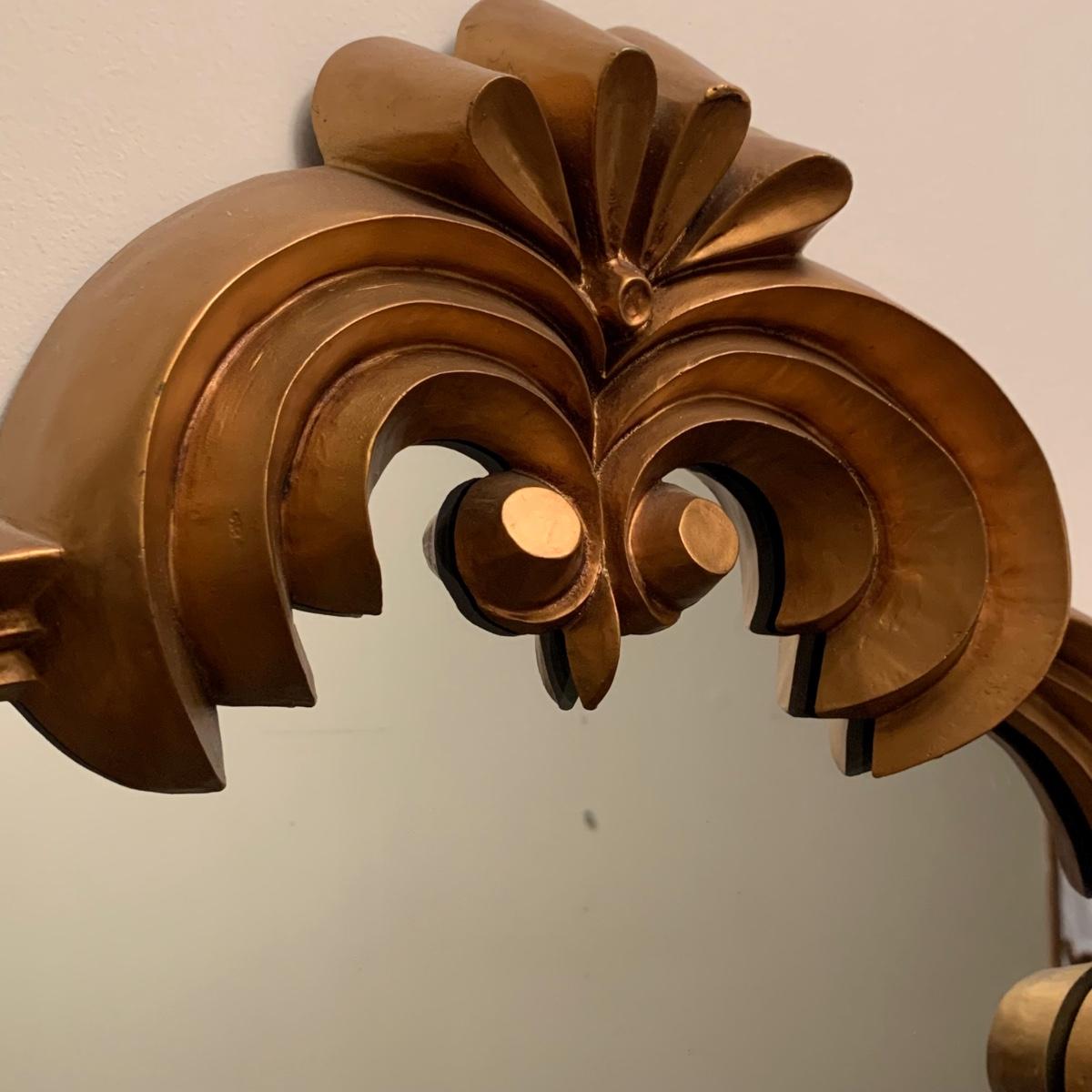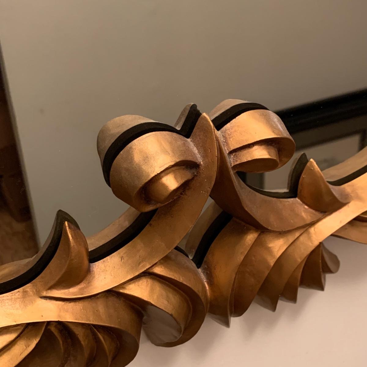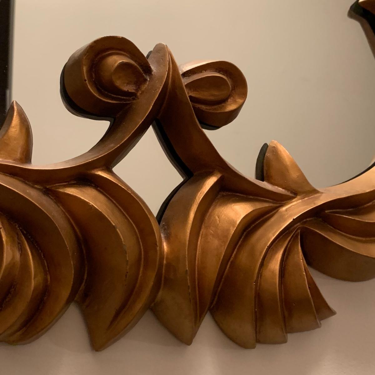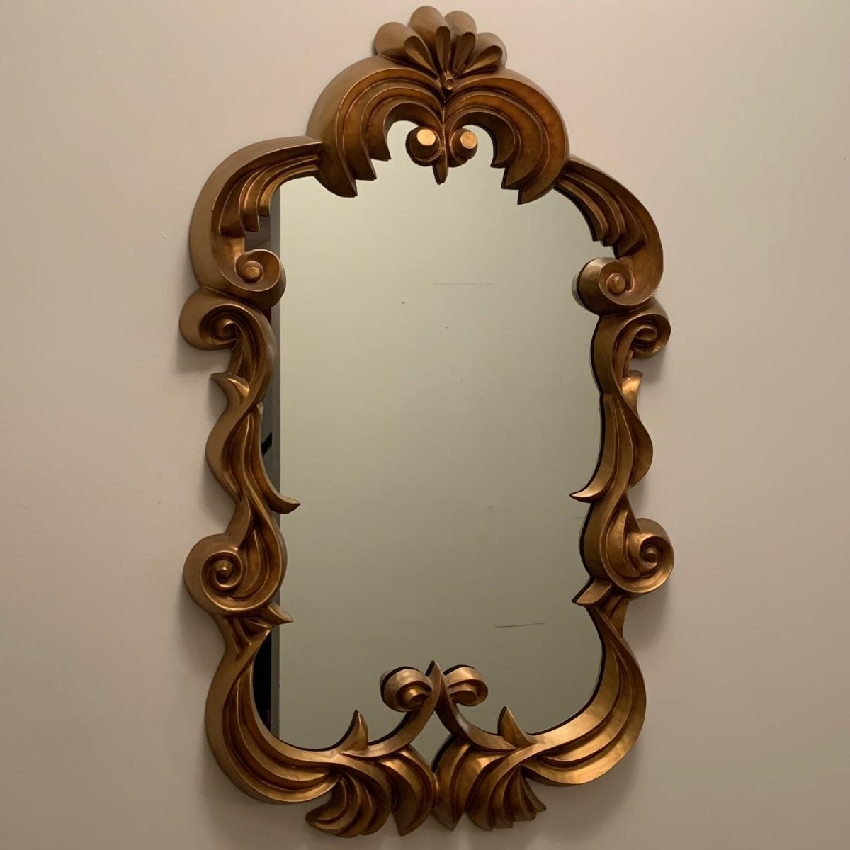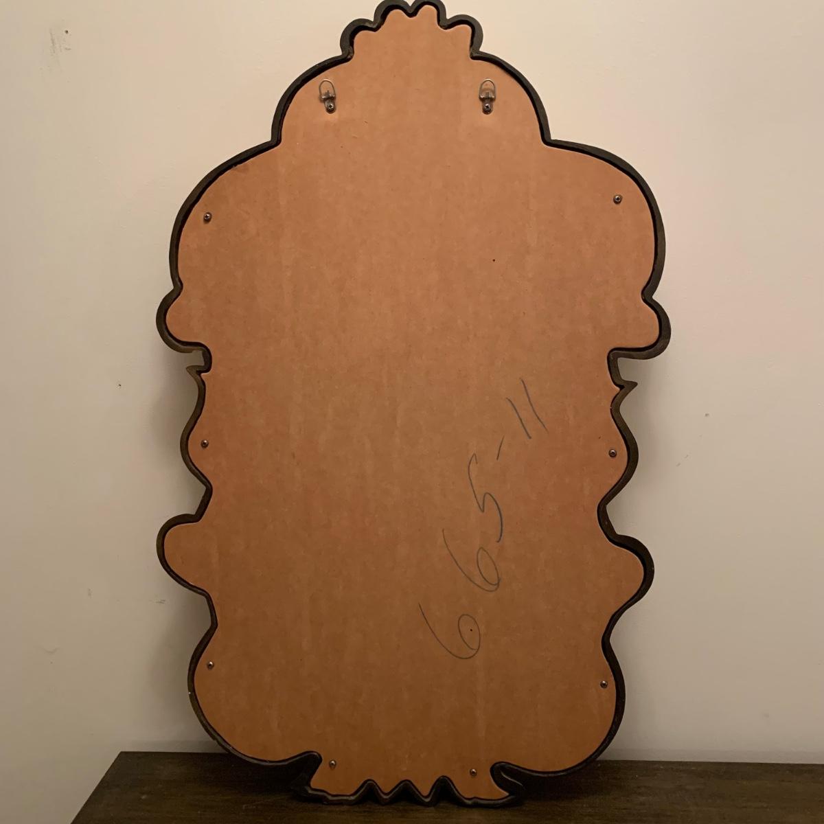 Ornate metallic gold framed mirror measures approximately 20” x 32”H. Mirror frame appears to be a resin or plastic material. Two hooks are attached to the back for hanging. It is quite heavy.
