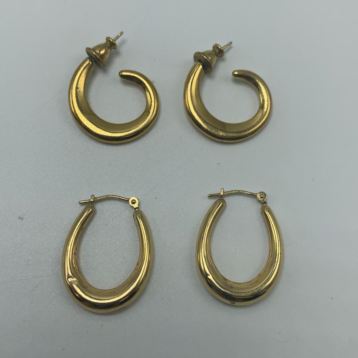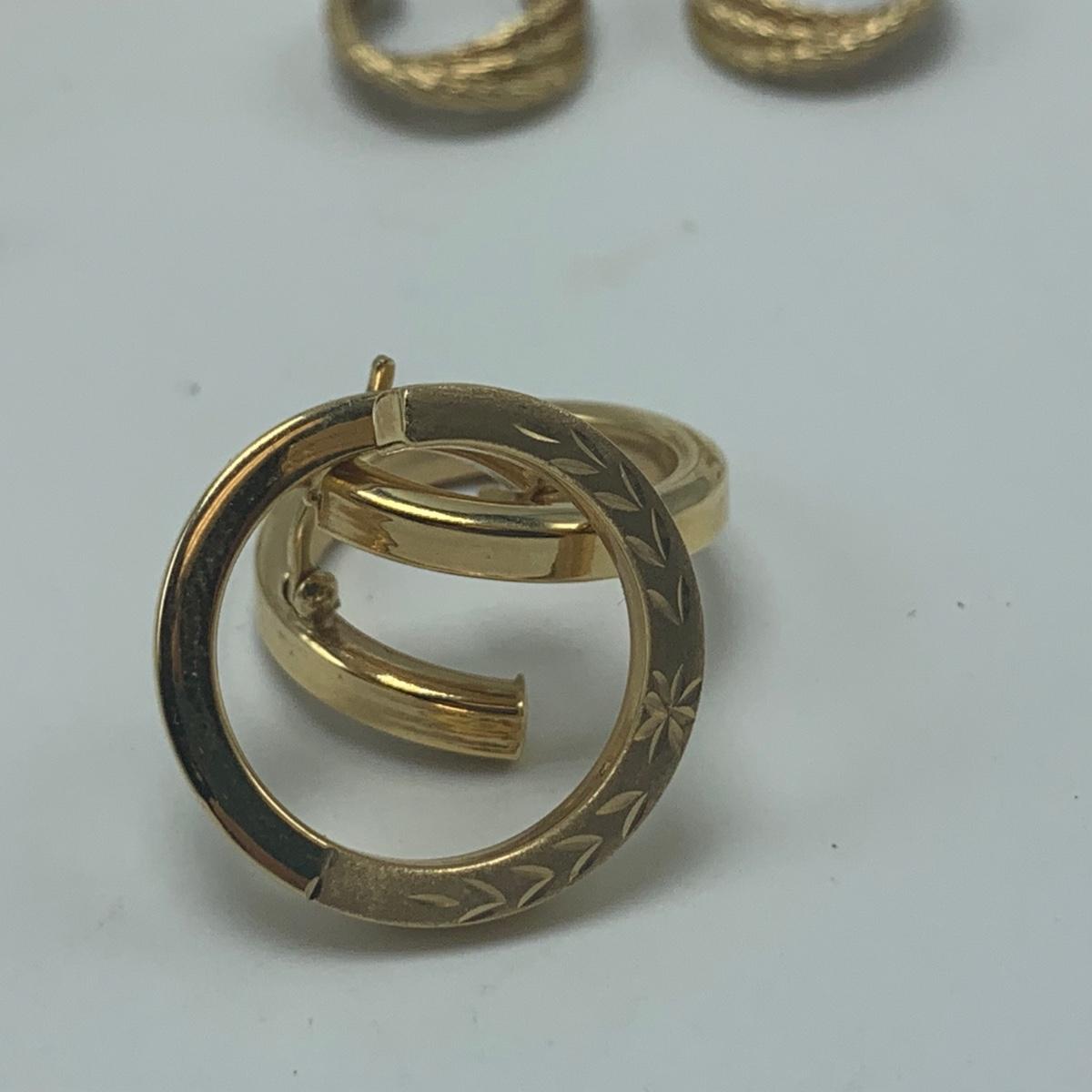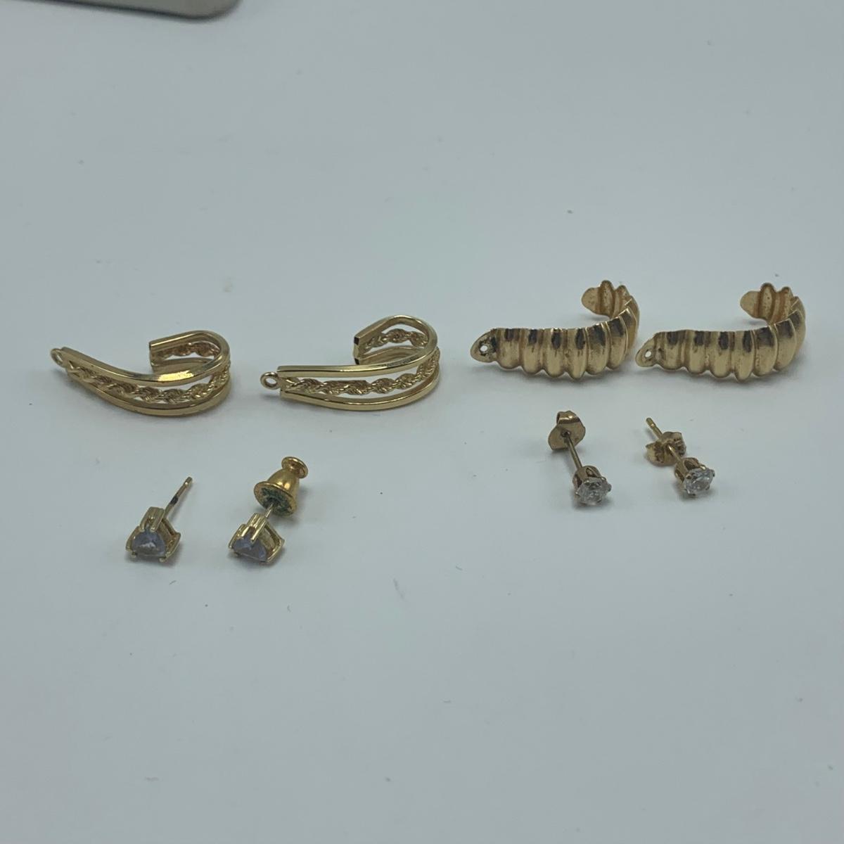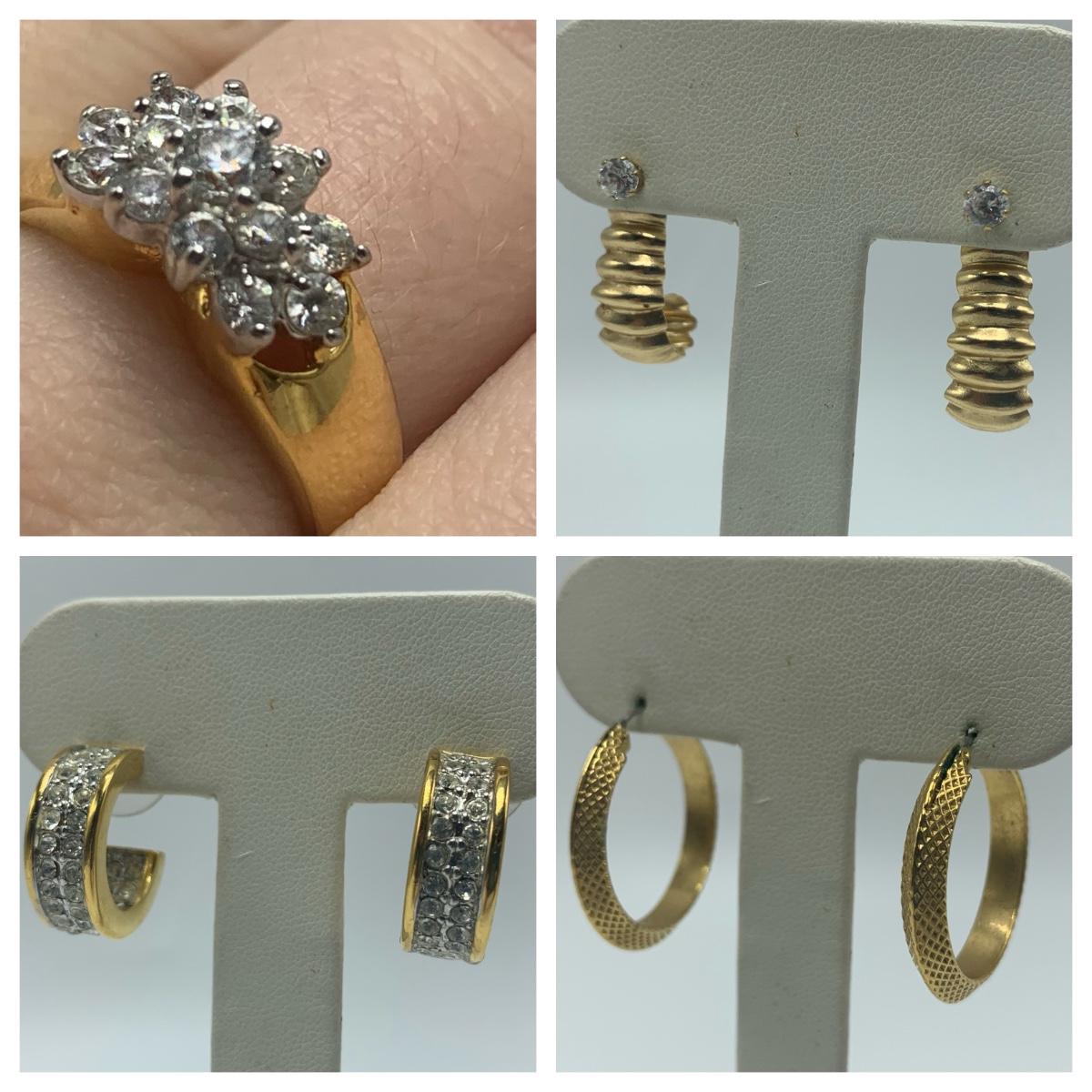 18 pairs of earrings for pierced ears, plus one ring and one pendant. All items are made with gold colored metal. Two are stamped “˜14K’ and “˜585’. The ring is approximately size 8. The largest pair of hoops are about 1 1/8”. One pair of studs is missing a back.