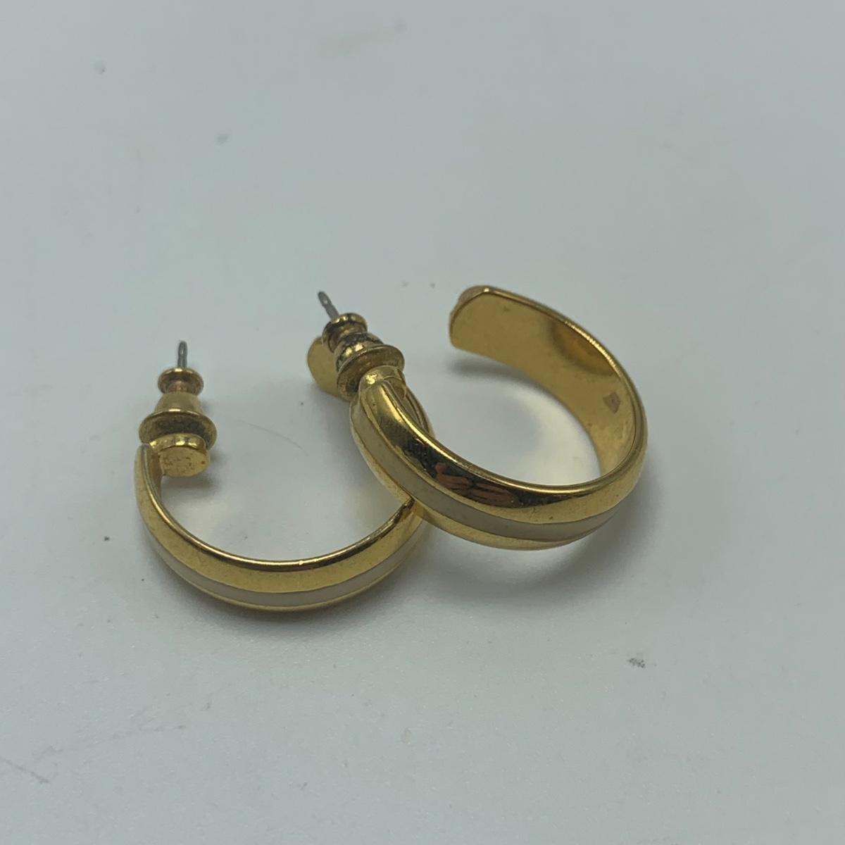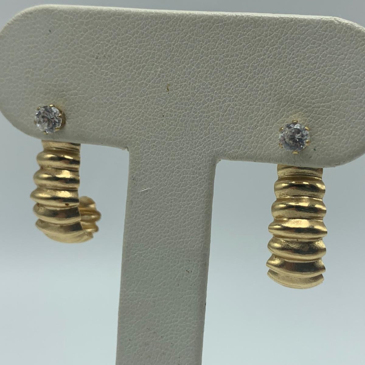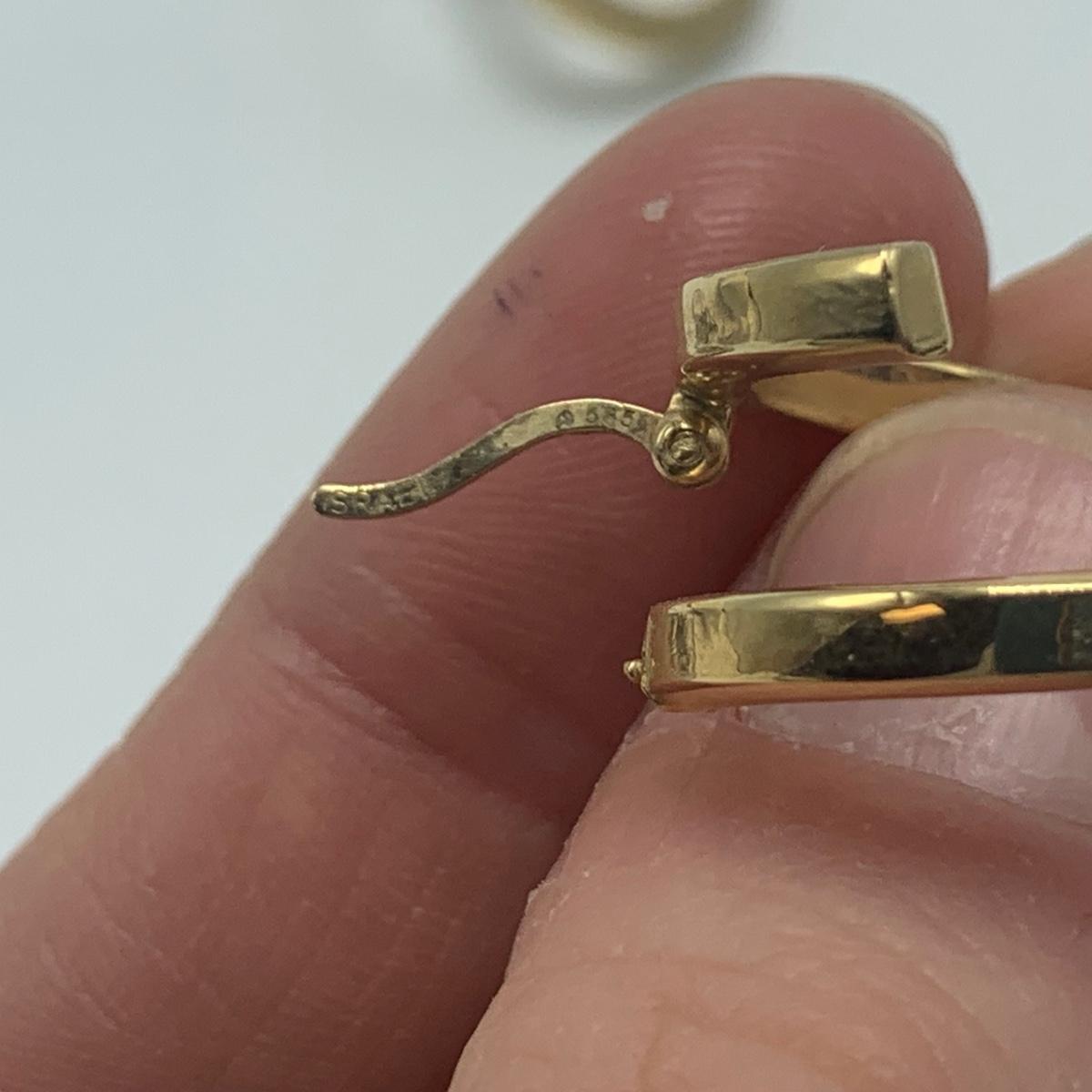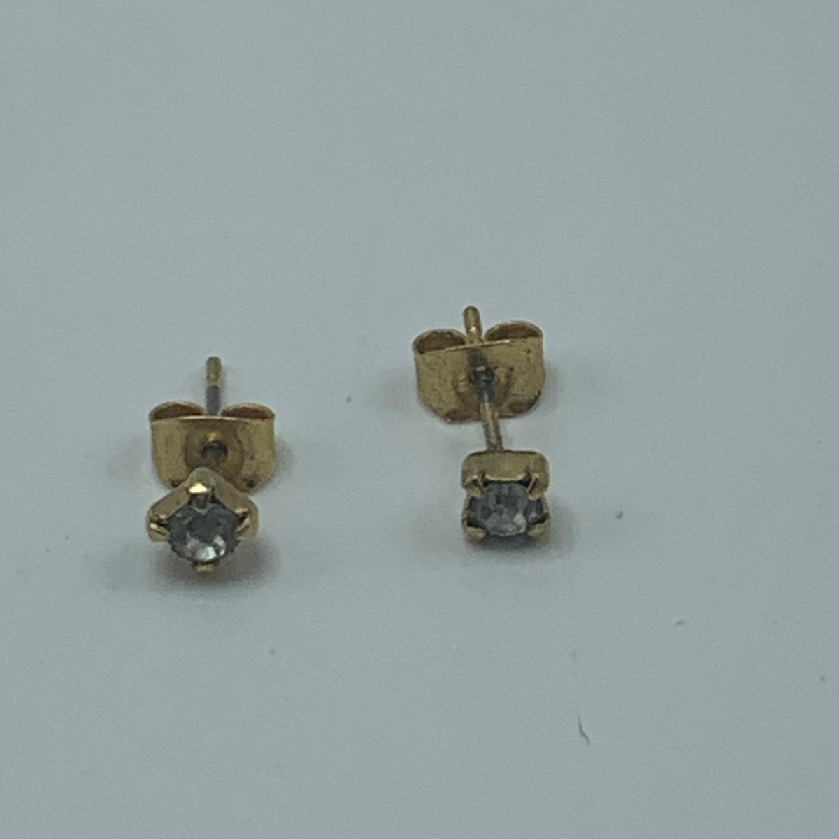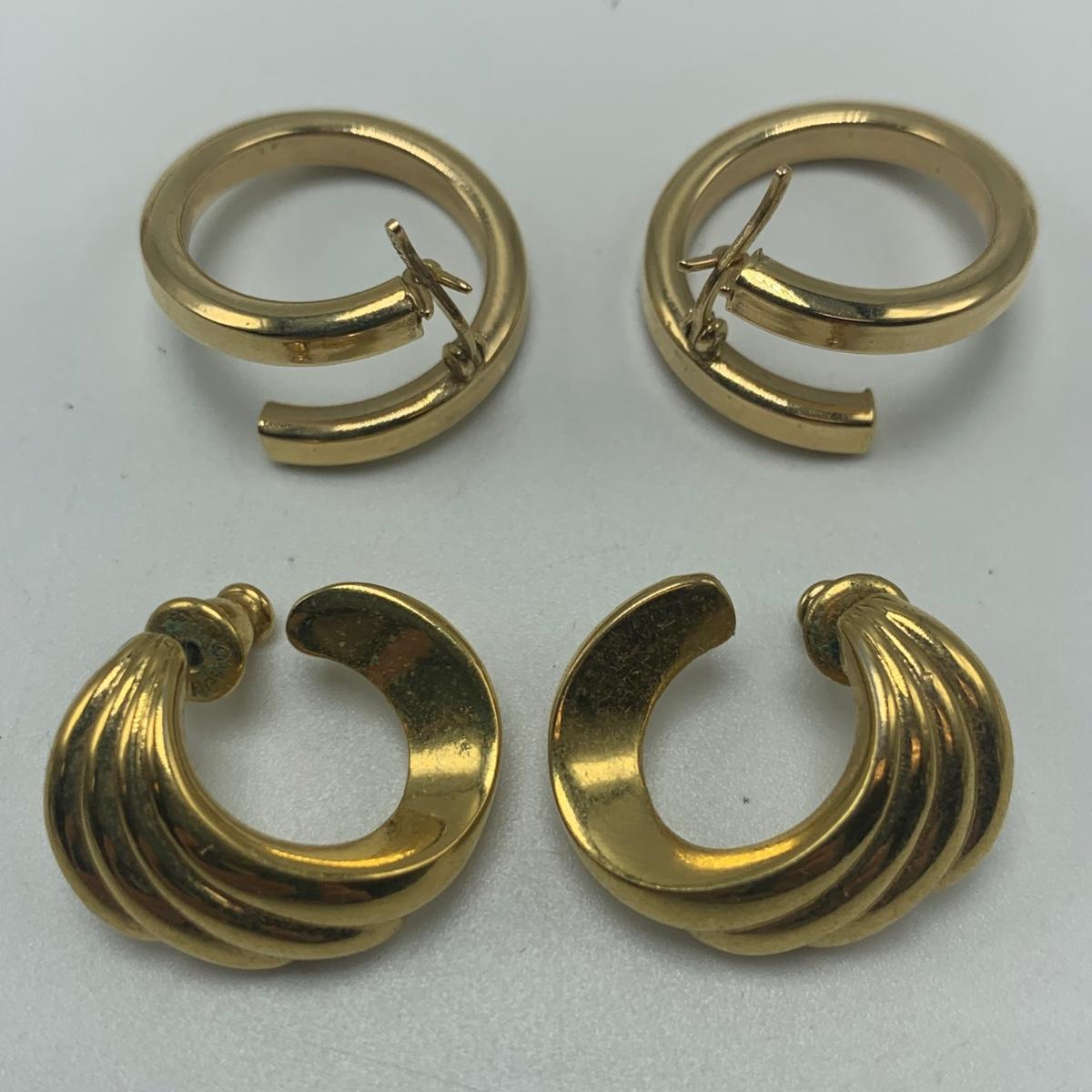 18 pairs of earrings for pierced ears, plus one ring and one pendant. All items are made with gold colored metal. Two are stamped “˜14K’ and “˜585’. The ring is approximately size 8. The largest pair of hoops are about 1 1/8”. One pair of studs is missing a back.