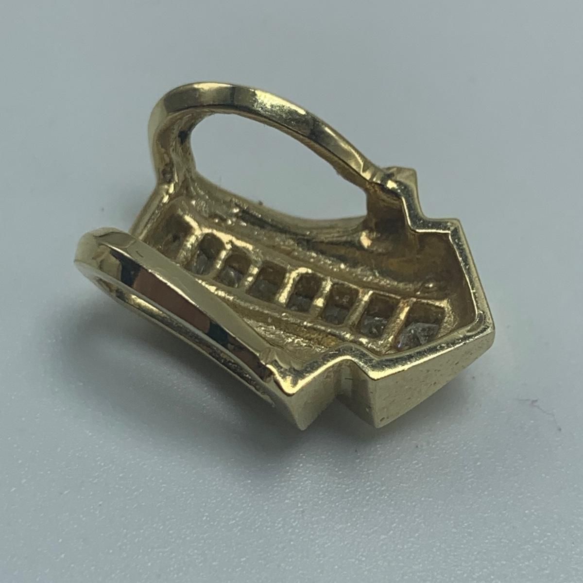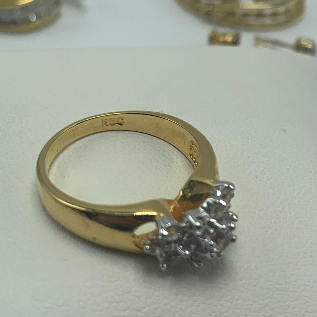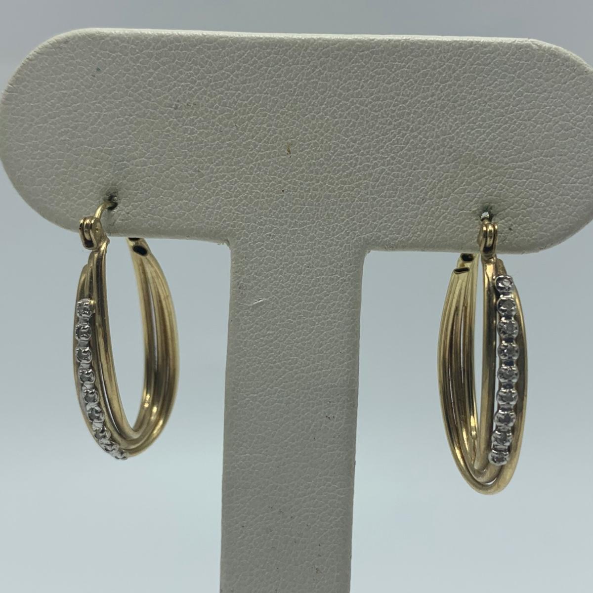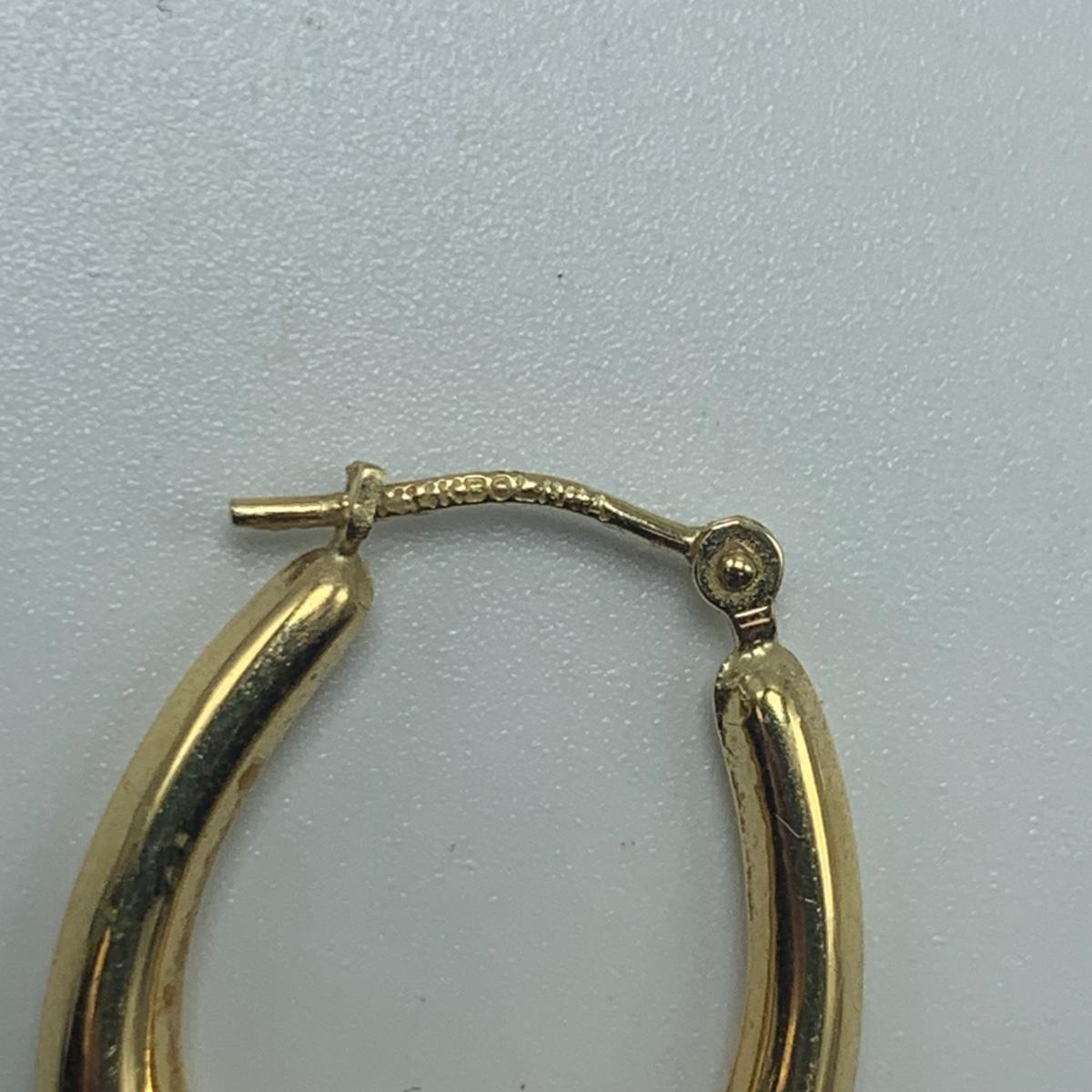 18 pairs of earrings for pierced ears, plus one ring and one pendant. All items are made with gold colored metal. Two are stamped “˜14K’ and “˜585’. The ring is approximately size 8. The largest pair of hoops are about 1 1/8”. One pair of studs is missing a back.