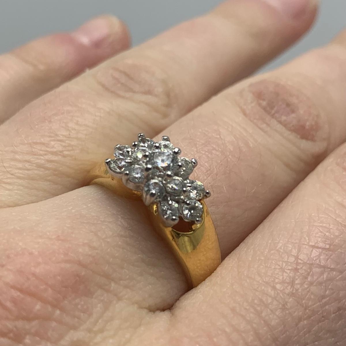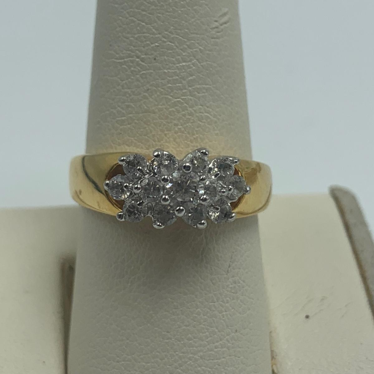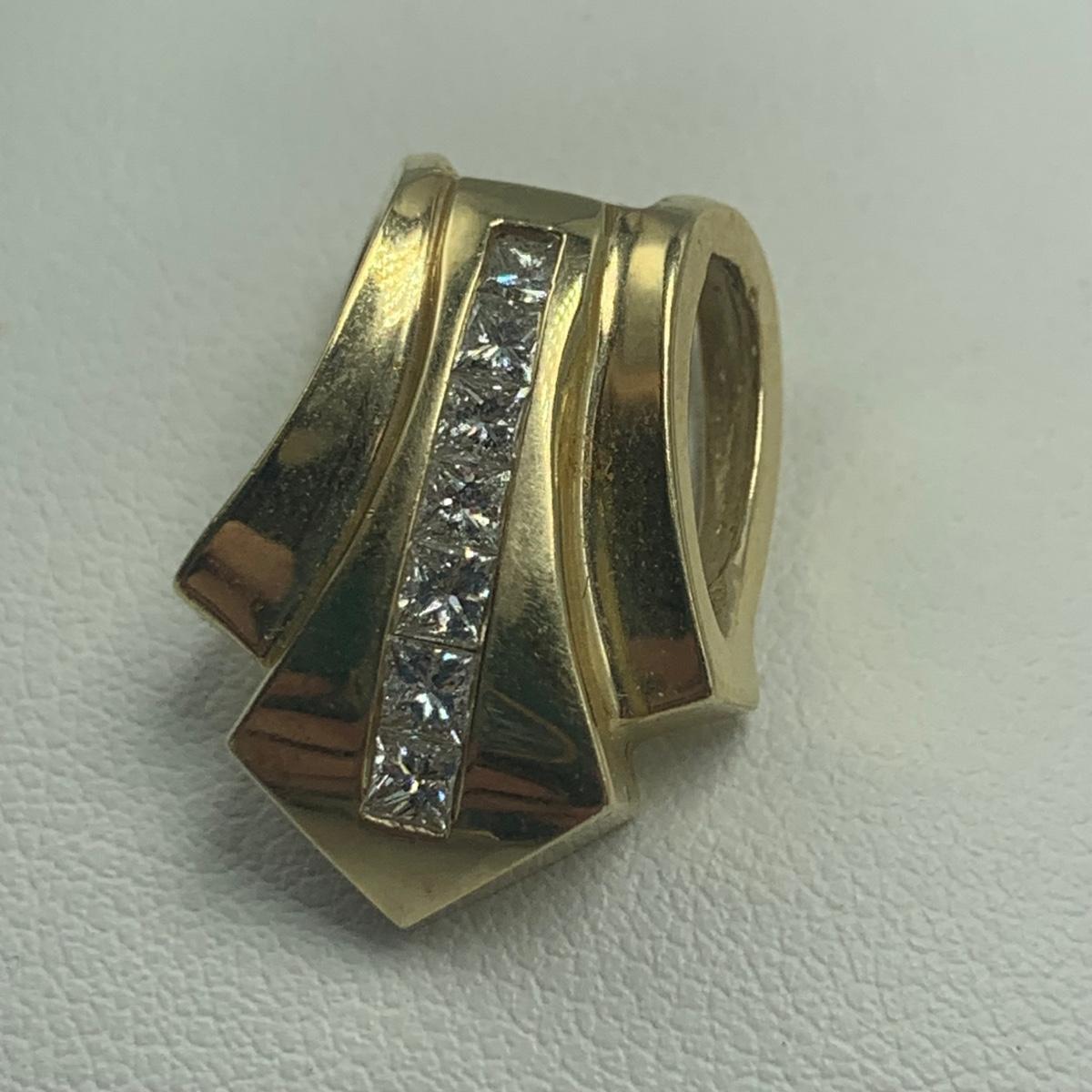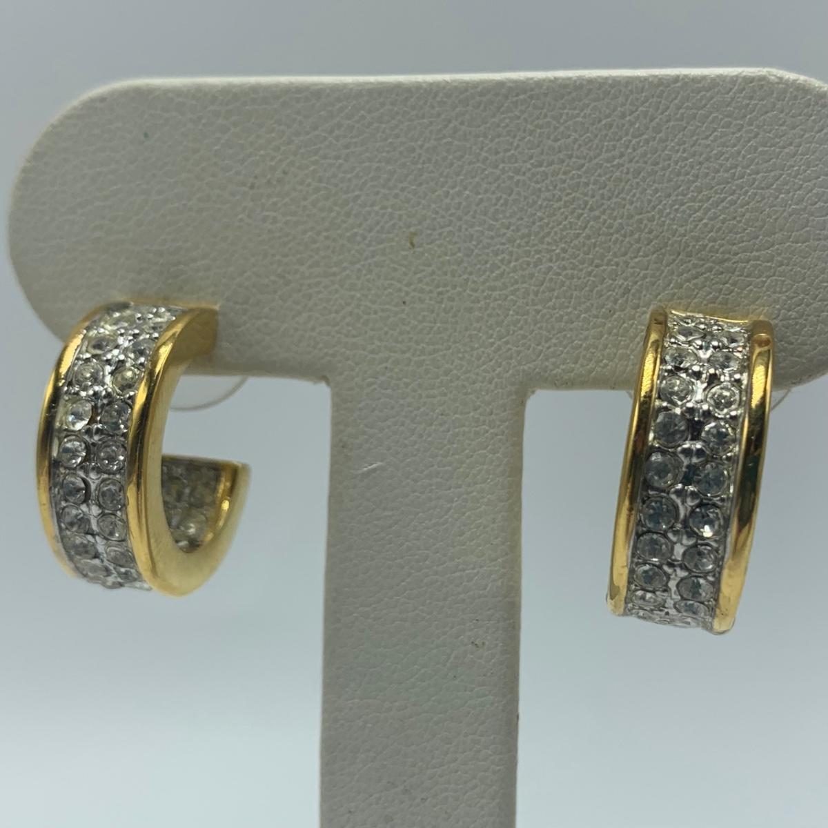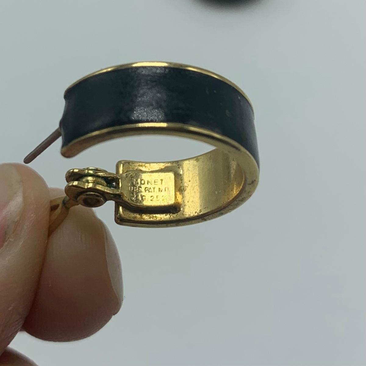 18 pairs of earrings for pierced ears, plus one ring and one pendant. All items are made with gold colored metal. Two are stamped “˜14K’ and “˜585’. The ring is approximately size 8. The largest pair of hoops are about 1 1/8”. One pair of studs is missing a back.