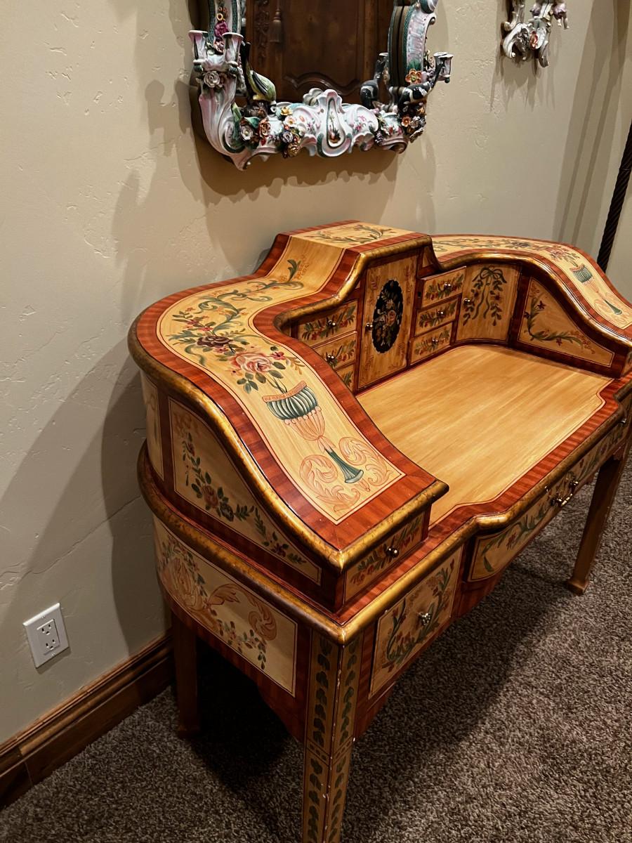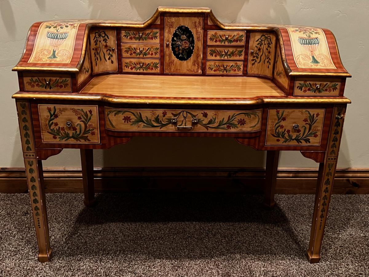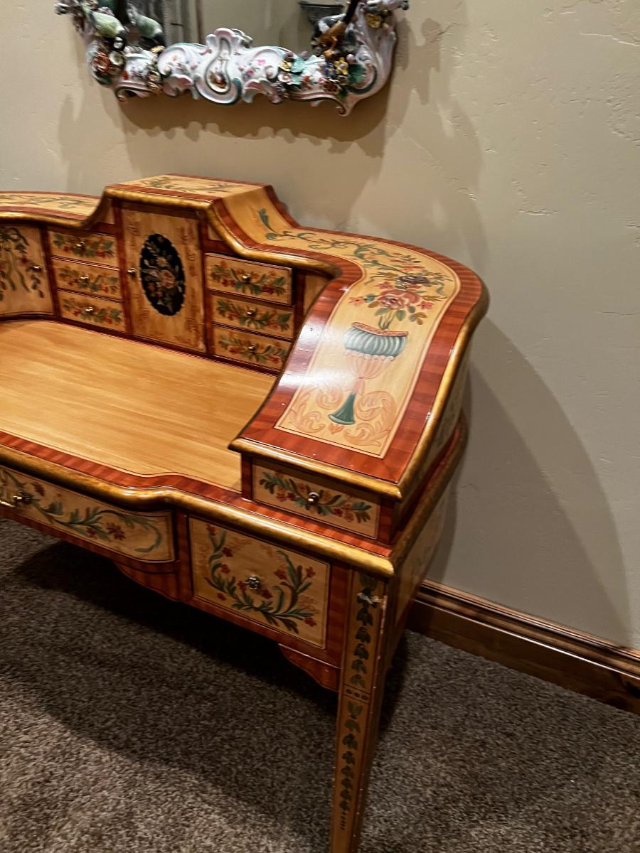 Antique reproduction 50" wide, 25" deep writing surface 30", total height 40". Good overall condition some wear and nicks from use. Most likely 20-30 years old.